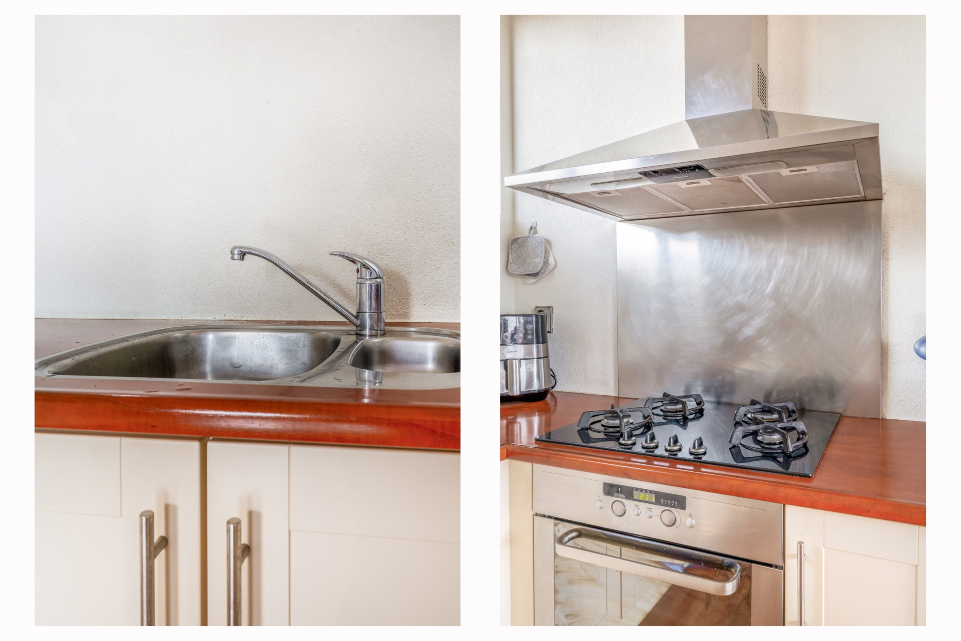 Hier is gekozen voor een lichte keuken in L-opstelling, voorzien van diverse inbouw apparatuur (fornuis met afzuigkap, combi oven en koelkast). Aanwezige vriezer wordt ter overname aangeboden.