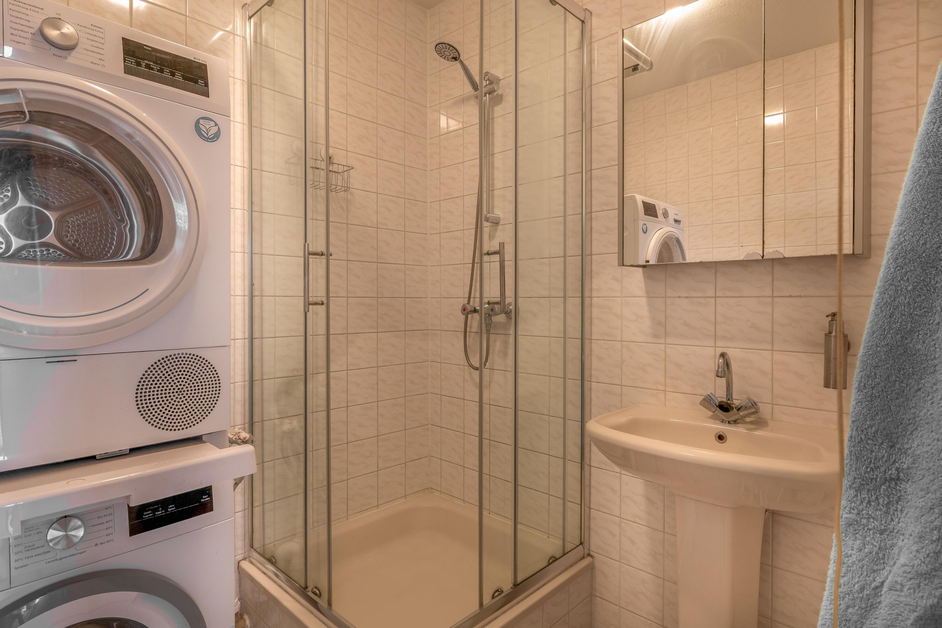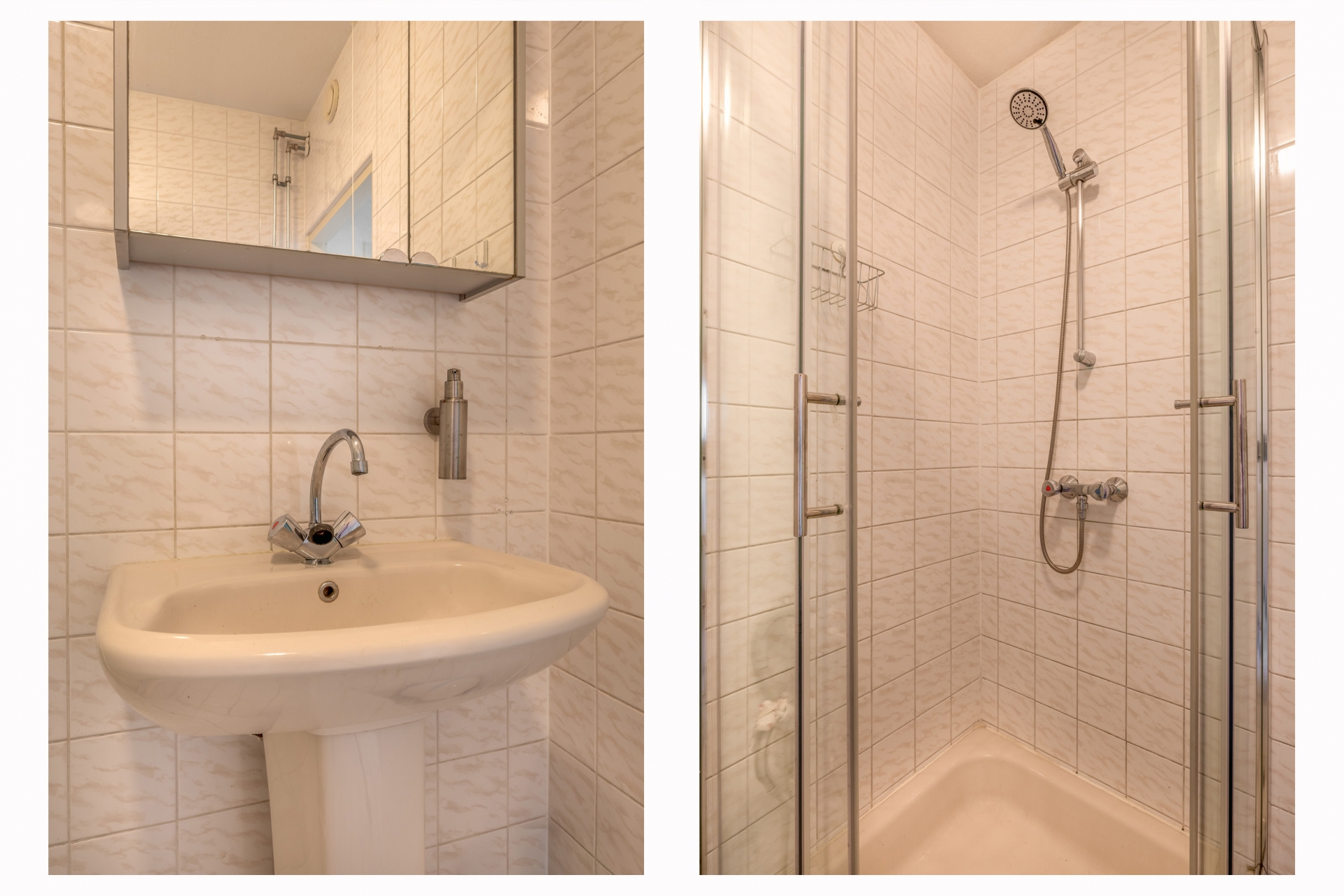 In de naastgelegen badkamer treffen we een wastafel, douche cabine en opstelplaats voor was apparatuur.