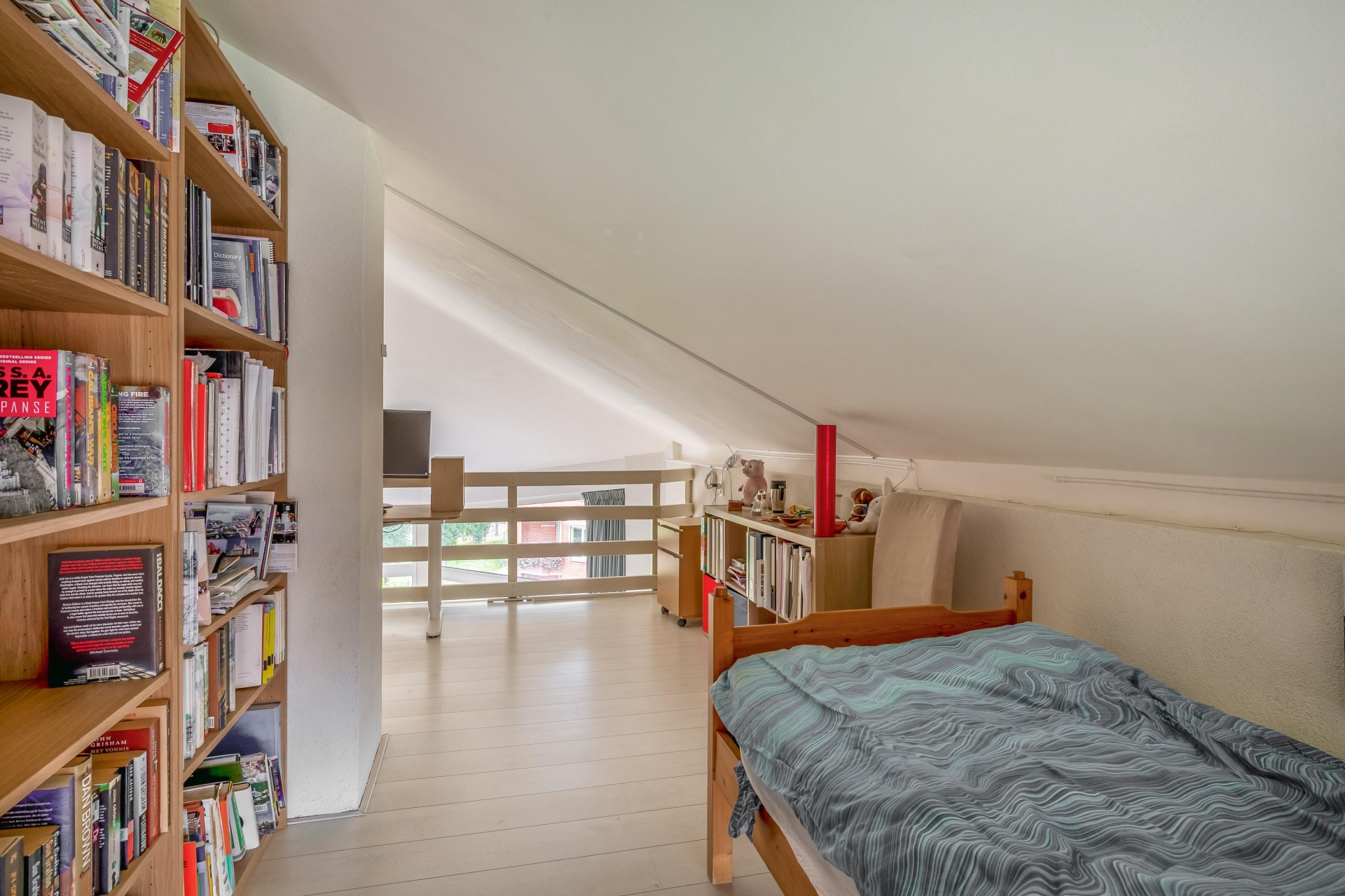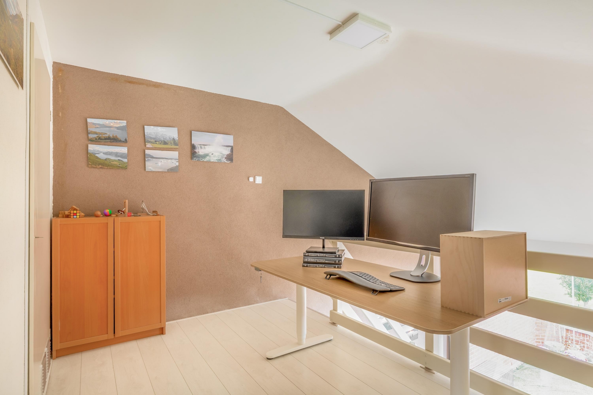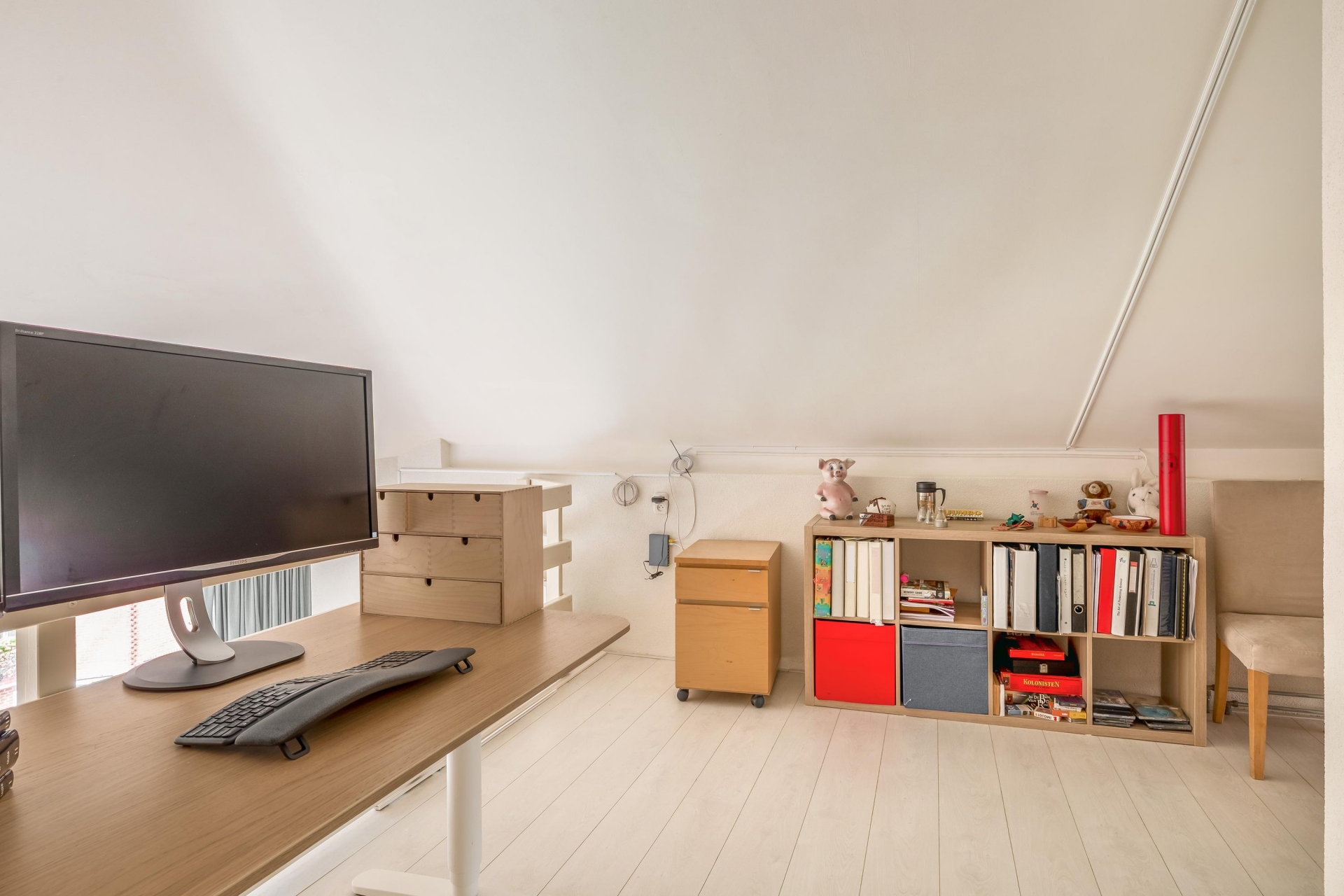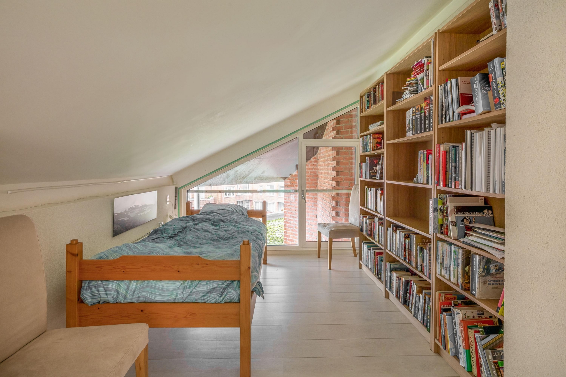 Zo heeft de huidige bewoner deze ruimte zeer functioneel ingericht als werkkamer met aangrenzend een extra slaap gelegenheid. Dankzij het raam aan de achterzijde en de vide bij de hoge raampartijen is ook deze etage omgeven door veel lichtinval.
