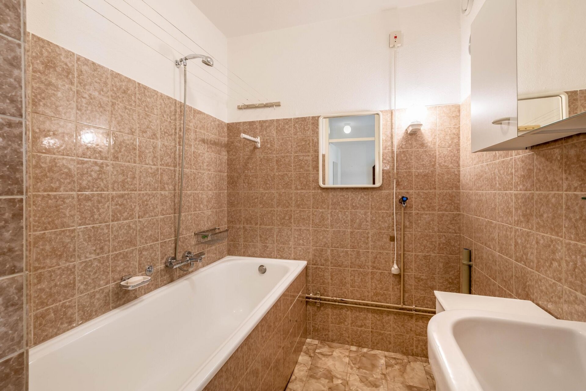 Aan de linkerzijde bevindt zich de badkamer, voorzien van een bad-douchecombinatie, een wastafelmeubel en een aansluiting voor de wasmachine. Direct naast de badkamer is een separaat toilet met fonteintje.