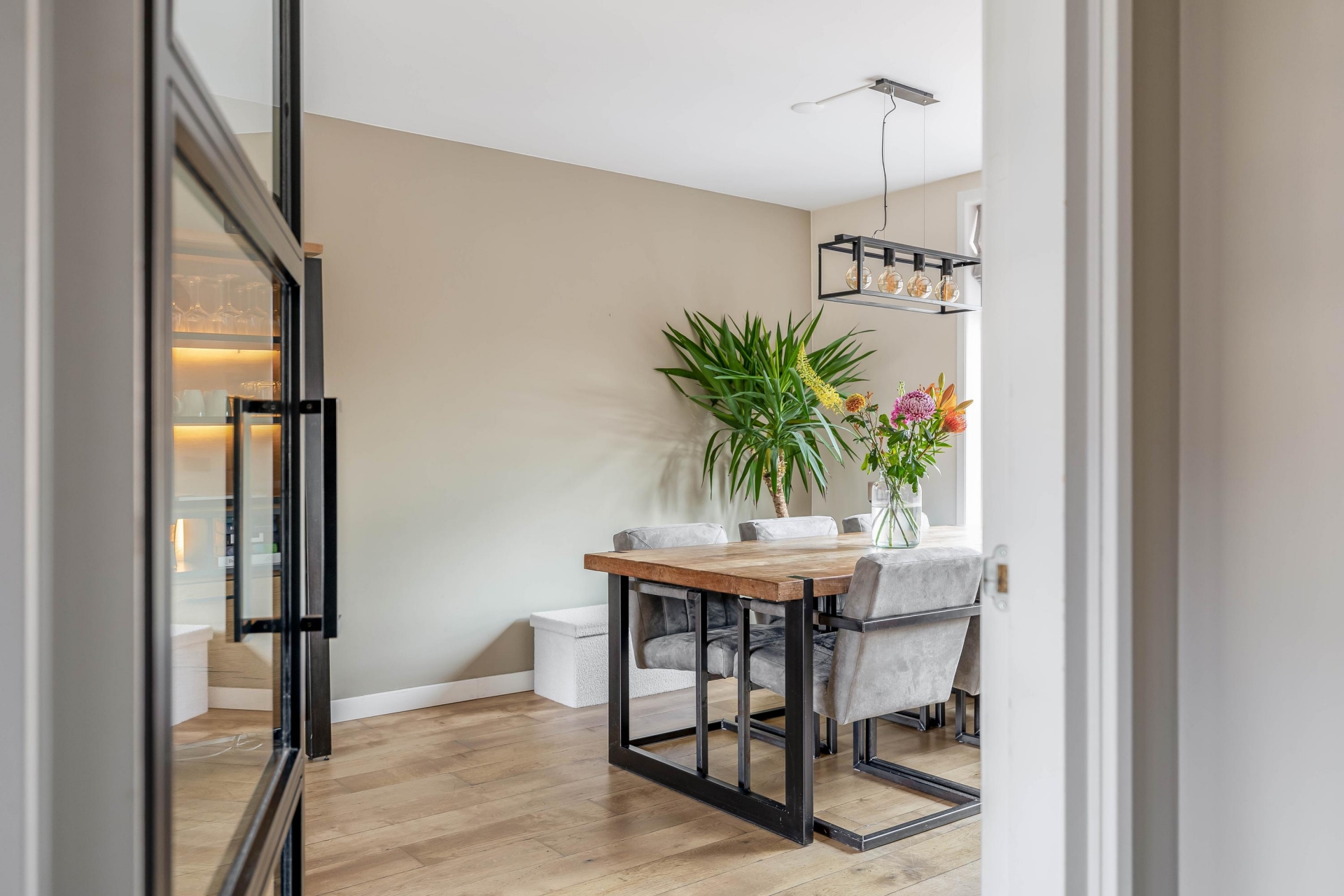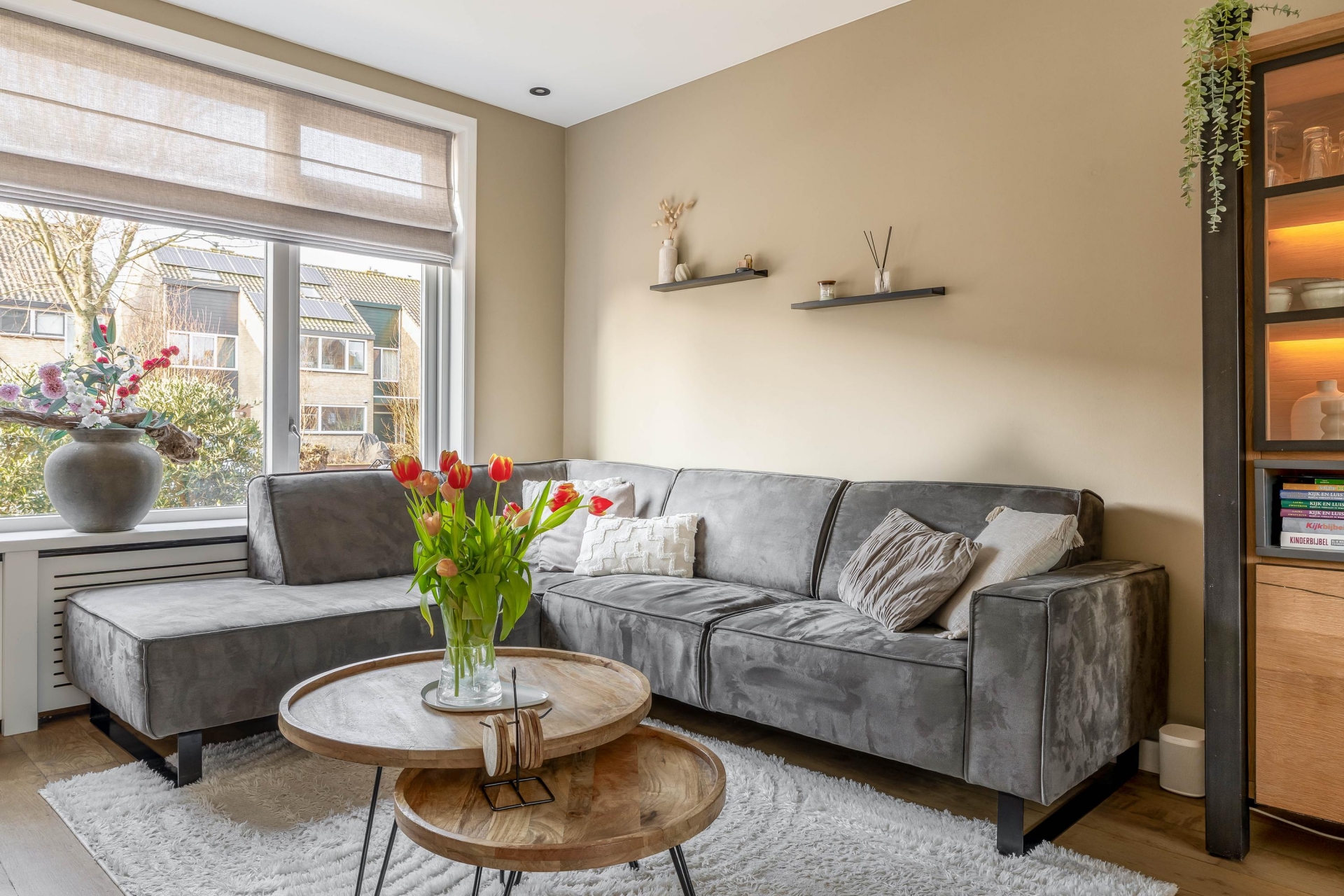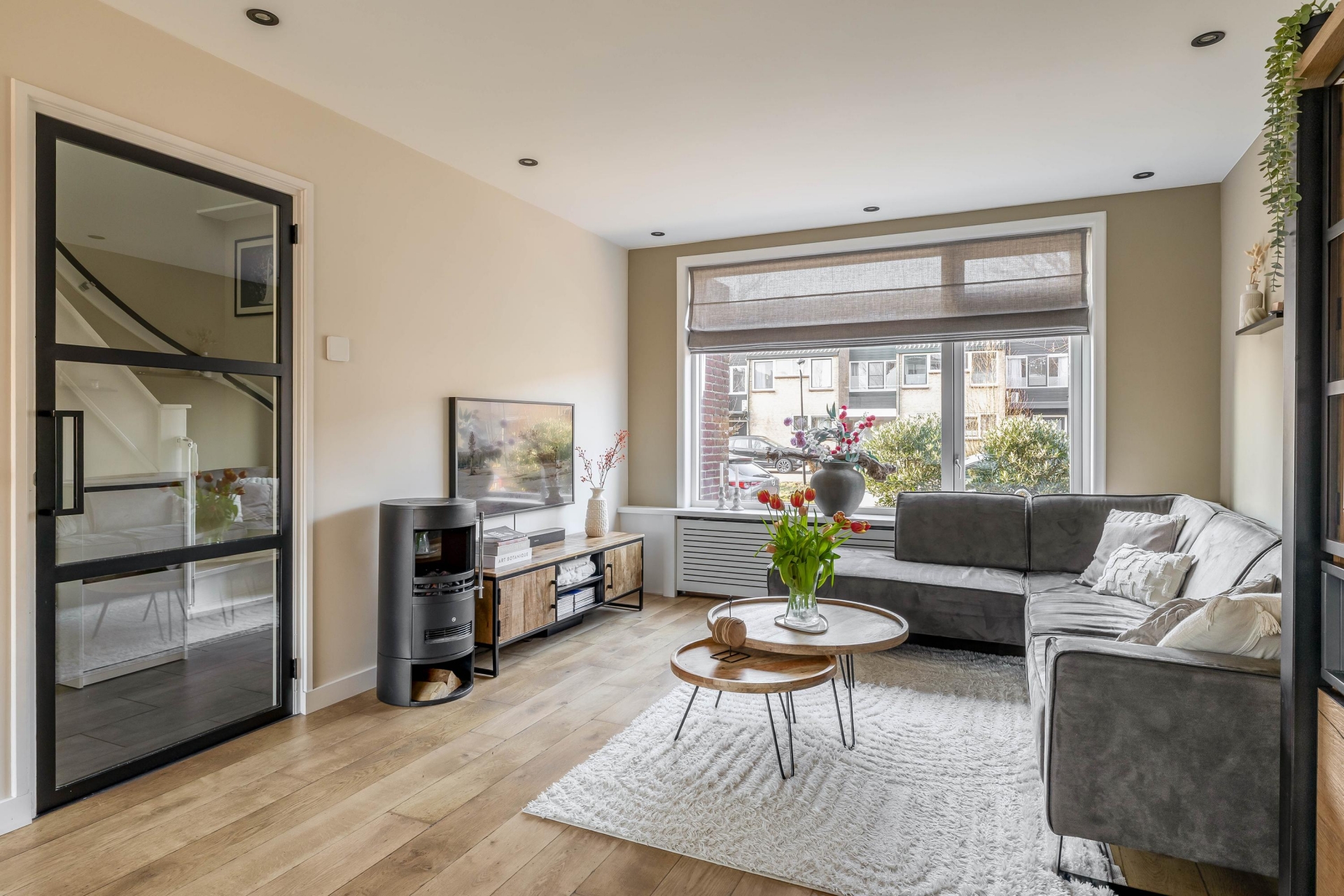 Zodra je binnenkomt merk je dat dit huis goed is onderhouden. De begane grond is in 2020 grondig aangepakt en dat zie je terug in de afwerking. De woonkamer is licht en sfeervol dankzij de grote raampartij aan de voorzijde. Vanuit de zithoek kijk je prettig uit over de rustige straat en het water aan de voorzijde, wat zorgt voor meer privacy. De wanden en het plafond op de begane grond zijn strak gestuukt en voorzien van inbouwspots, wat het geheel een moderne uitstraling geeft. De ruimte is praktisch in te delen met een comfortabele zithoek aan de voorzijde en een eethoek richting de keuken. De elektrische sierhaard zorgt daarbij voor extra sfeer tijdens de koudere maanden.