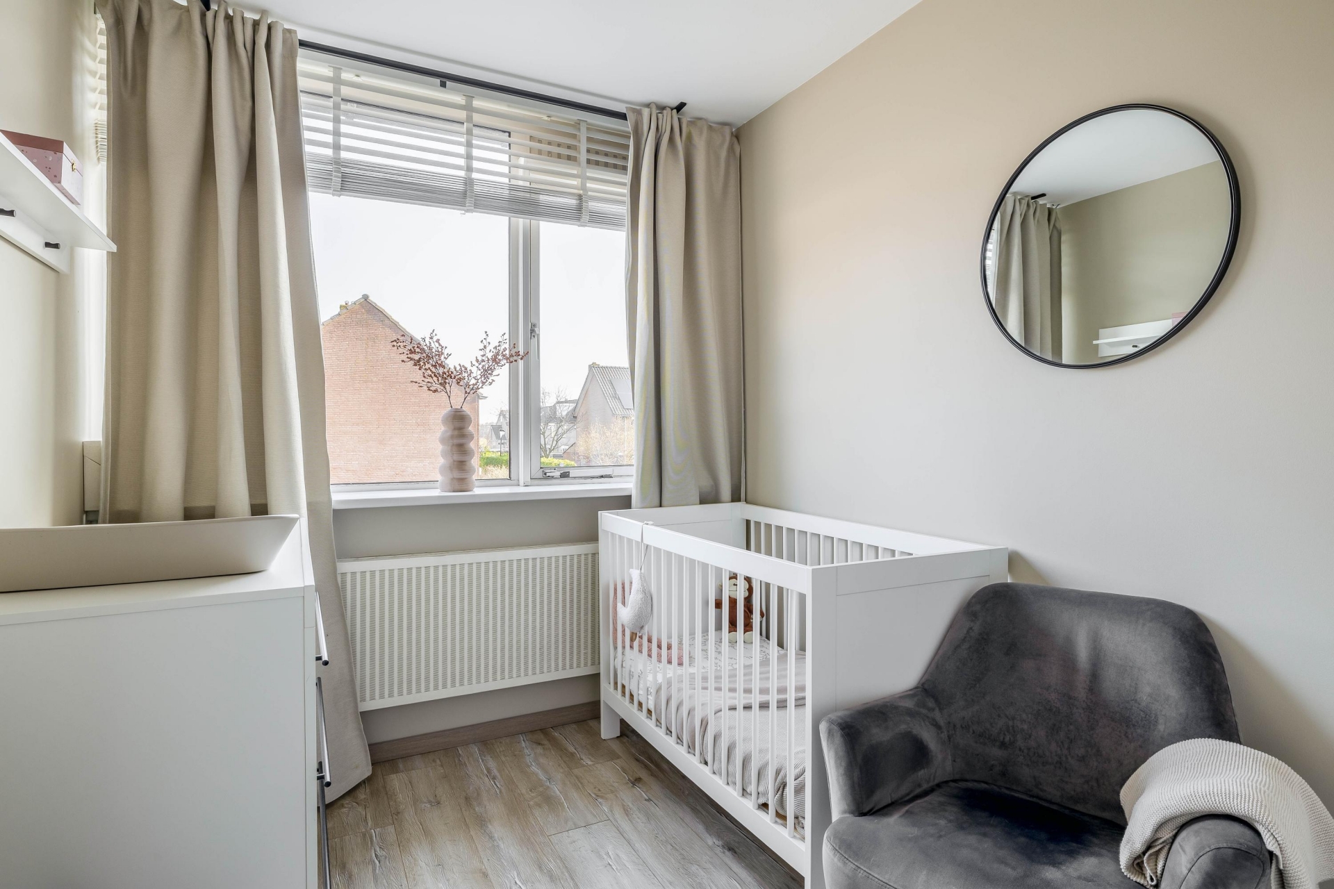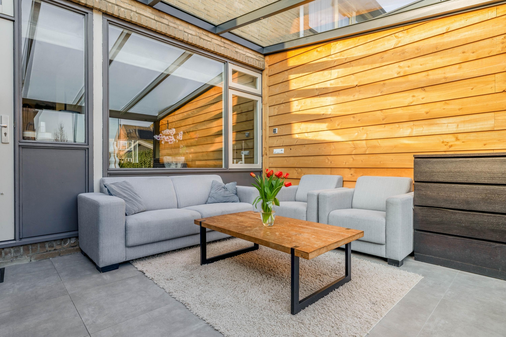 Een van de grootste pluspunten van dit huis is de serre aan de achterzijde. Deze is in 2022 geplaatst en volledig onderheid, waardoor het een solide en volwaardig onderdeel van het huis vormt. De serre voelt als een extra leefruimte waar je het hele jaar door kunt zitten. De grote glazen schuifpanelen zorgen voor veel lichtinval en een directe verbinding met de tuin. Op zonnige dagen zet je de panelen eenvoudig open en loopt binnen moeiteloos over in buiten. Hierdoor ontstaat een fijne plek voor een tweede zithoek, speelruimte voor kinderen of een rustige werkplek.