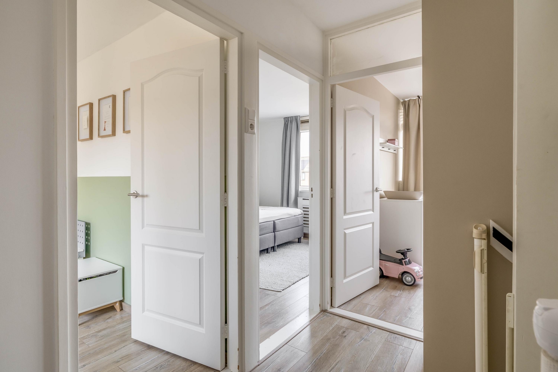 Op de eerste verdieping bevinden zich drie slaapkamers en de badkamer. De grootste slaapkamer ligt aan de achterzijde en biedt voldoende ruimte voor een tweepersoonsbed en een kastenwand. Aan de voorzijde liggen nog twee slaapkamers die ideaal zijn als kinderkamer, werkkamer of logeerkamer. De badkamer is praktisch ingericht en beschikt over een douche, wastafel en een elektrische vloerverwarming.
