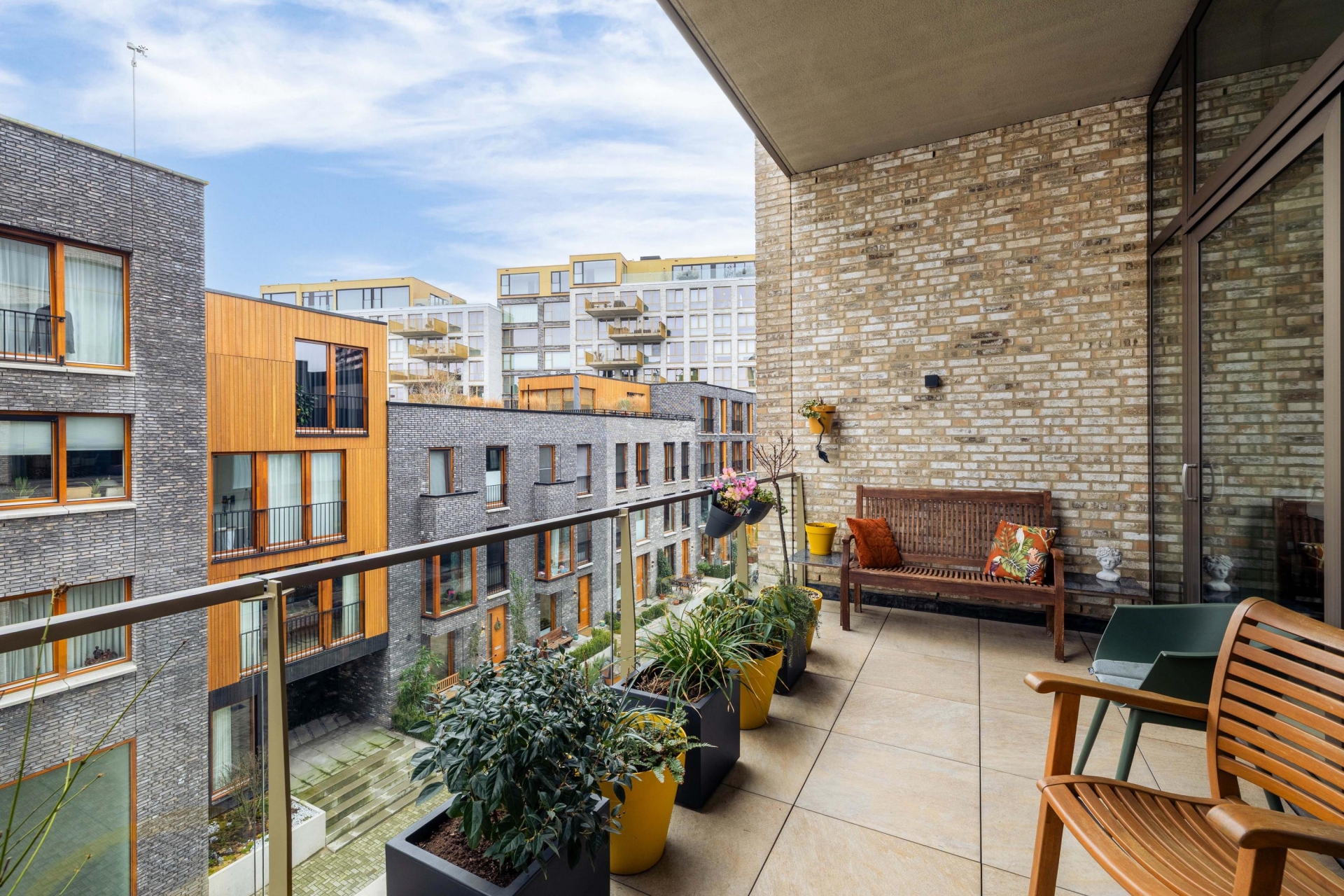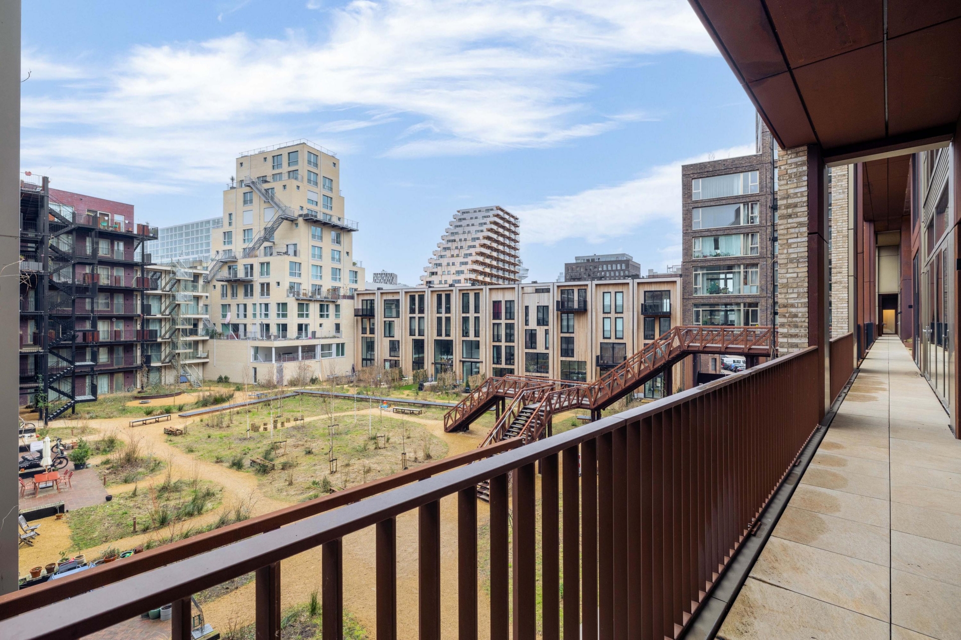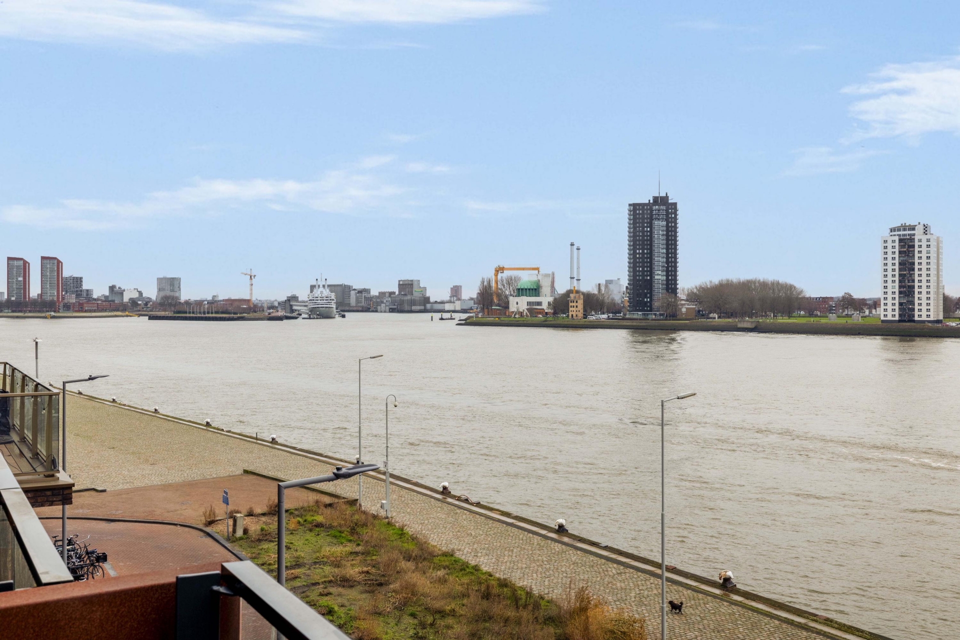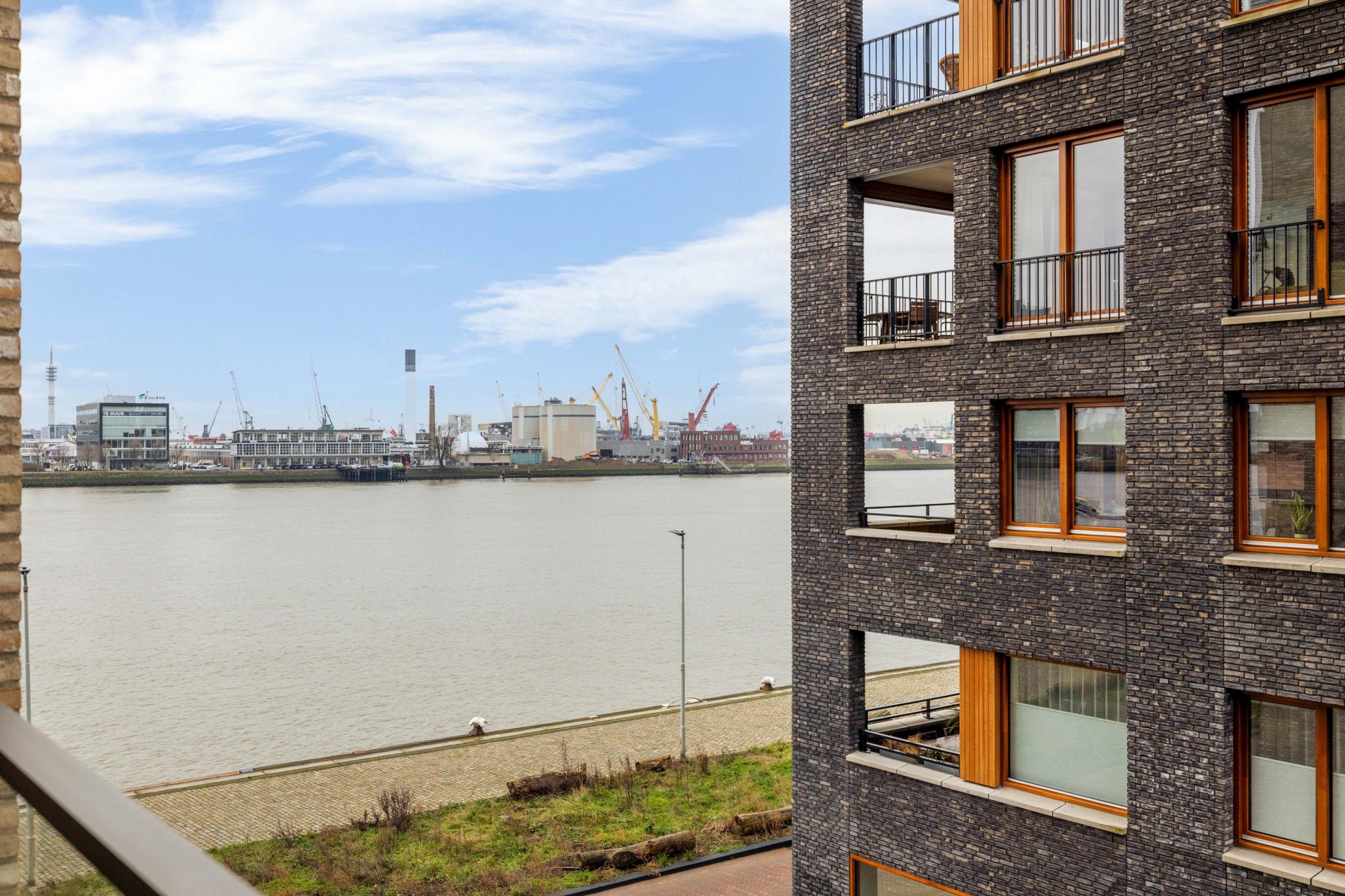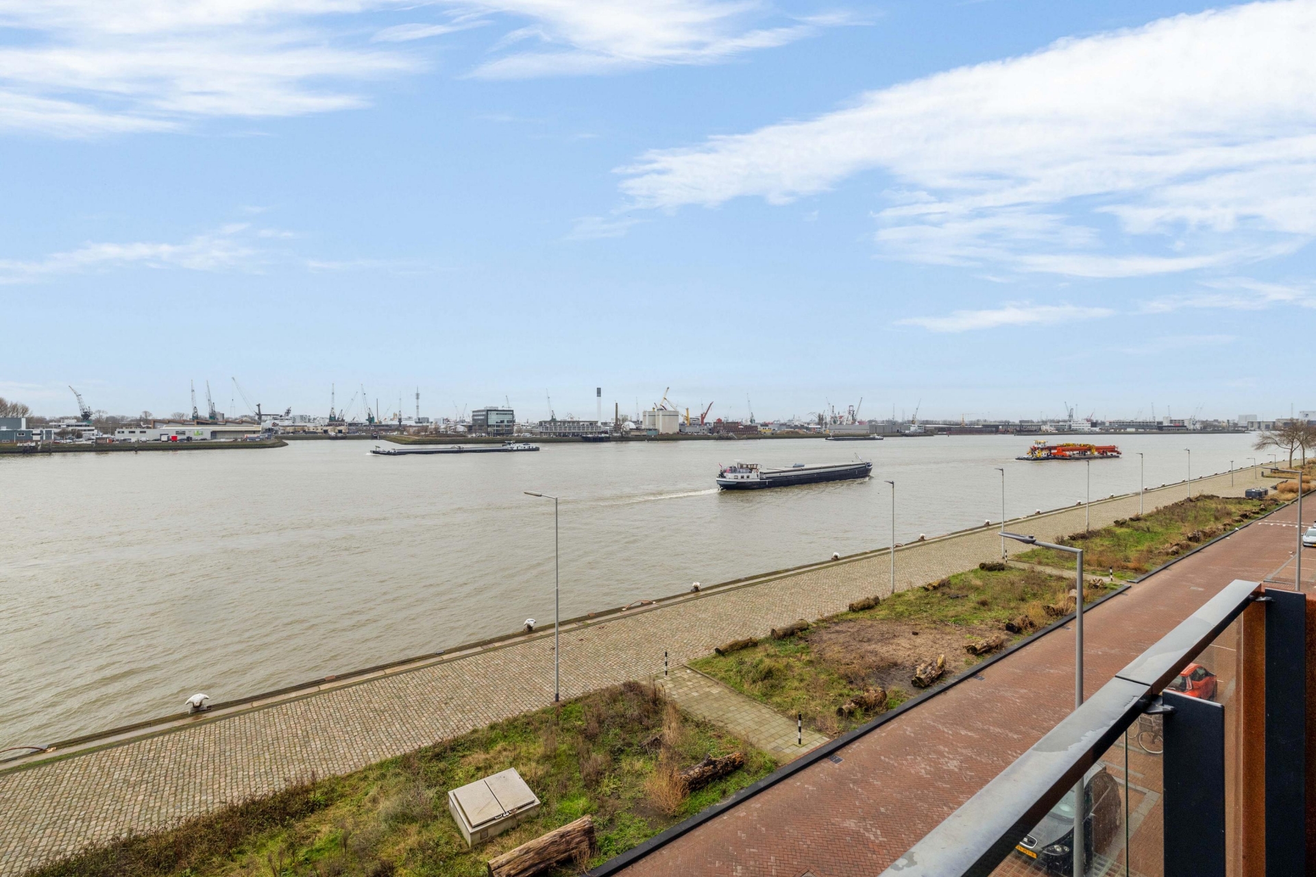 Het ruime balkon, bereikbaar vanuit de woonkamer, biedt een fijne buitenplek en een prettig uitzicht richting het water en binnen het Lloyd Yard-complex. Een ideale plek om te ontspannen en te genieten van de rust en het buitenleven aan de Maas.