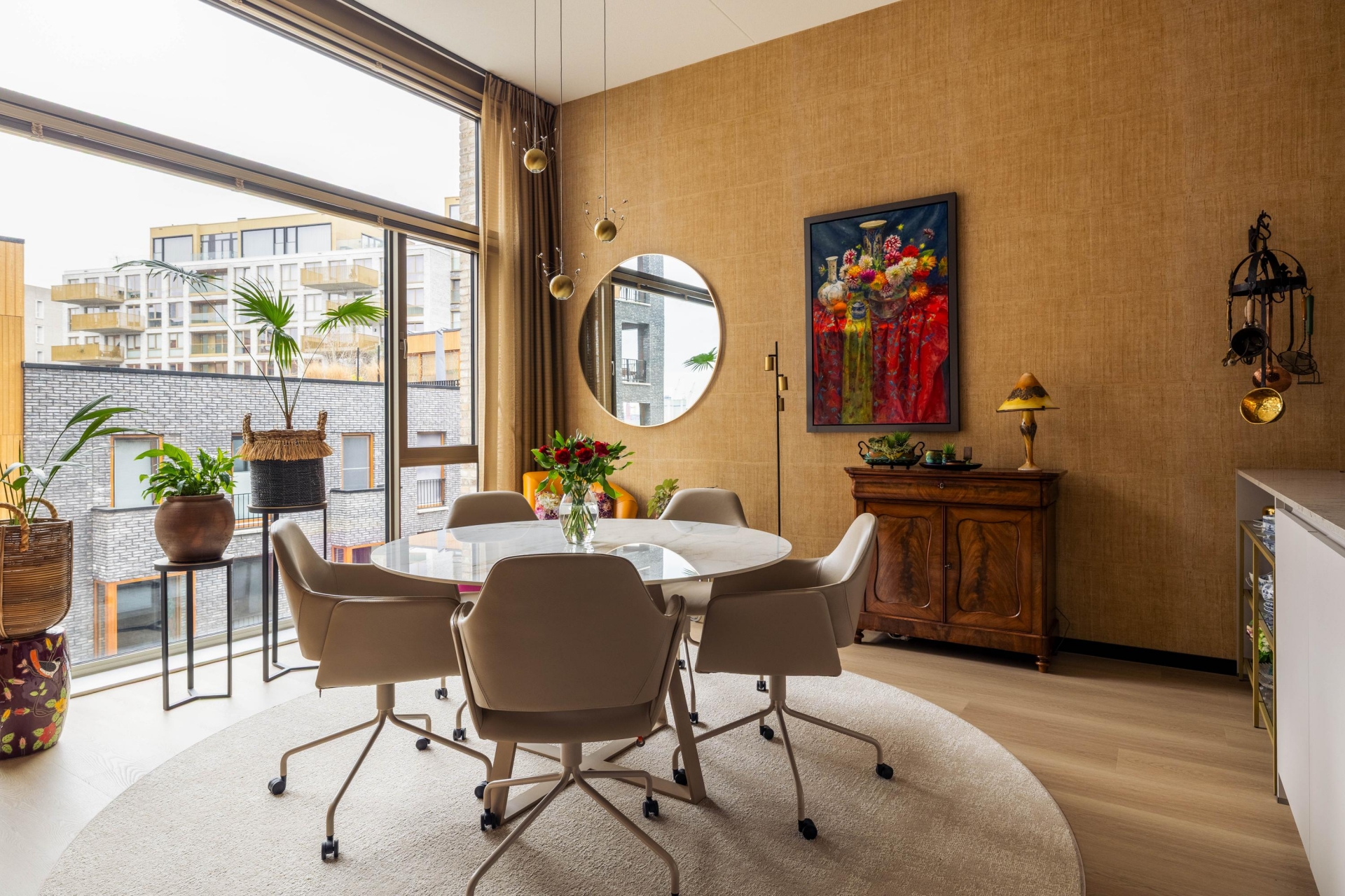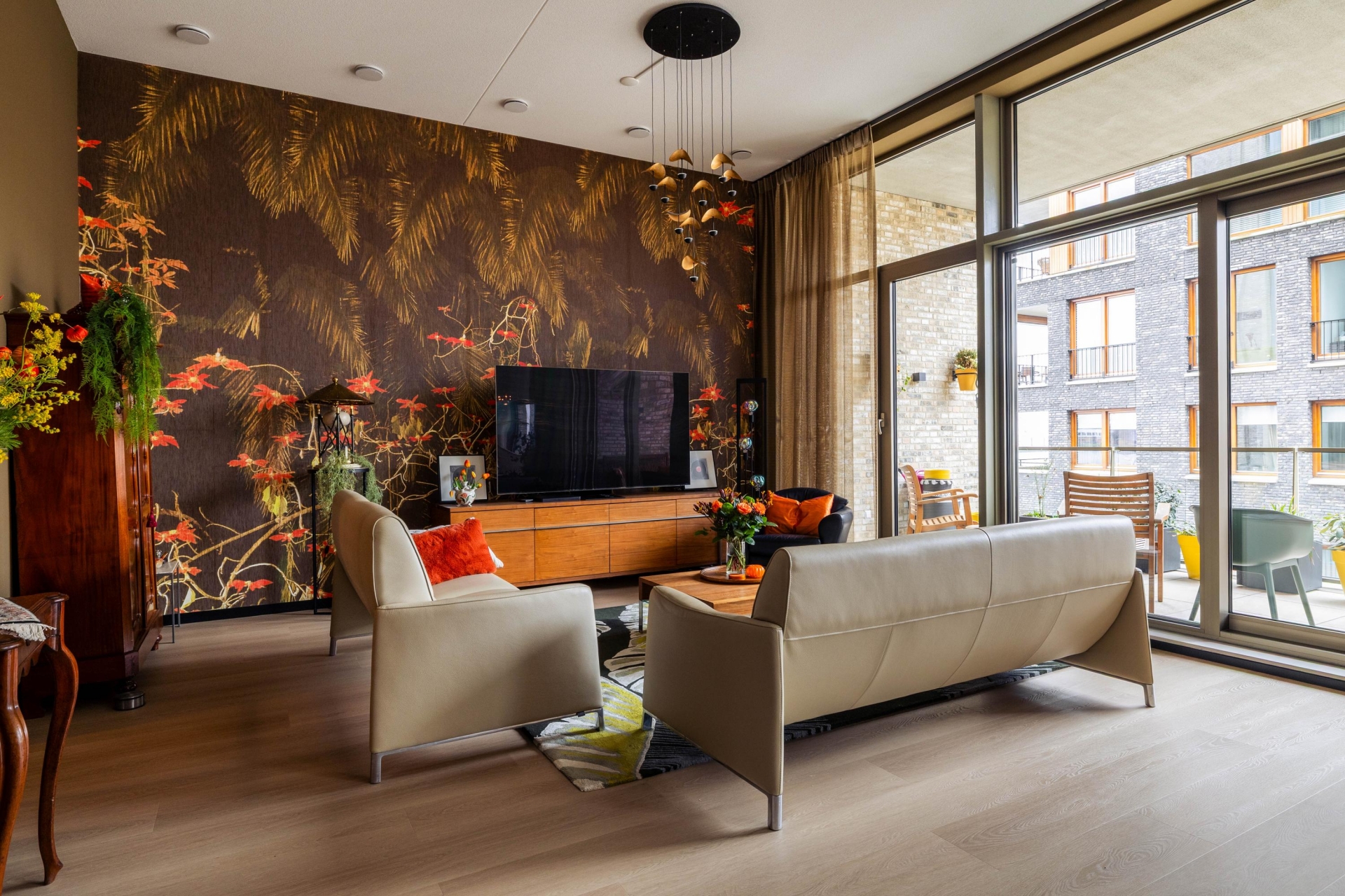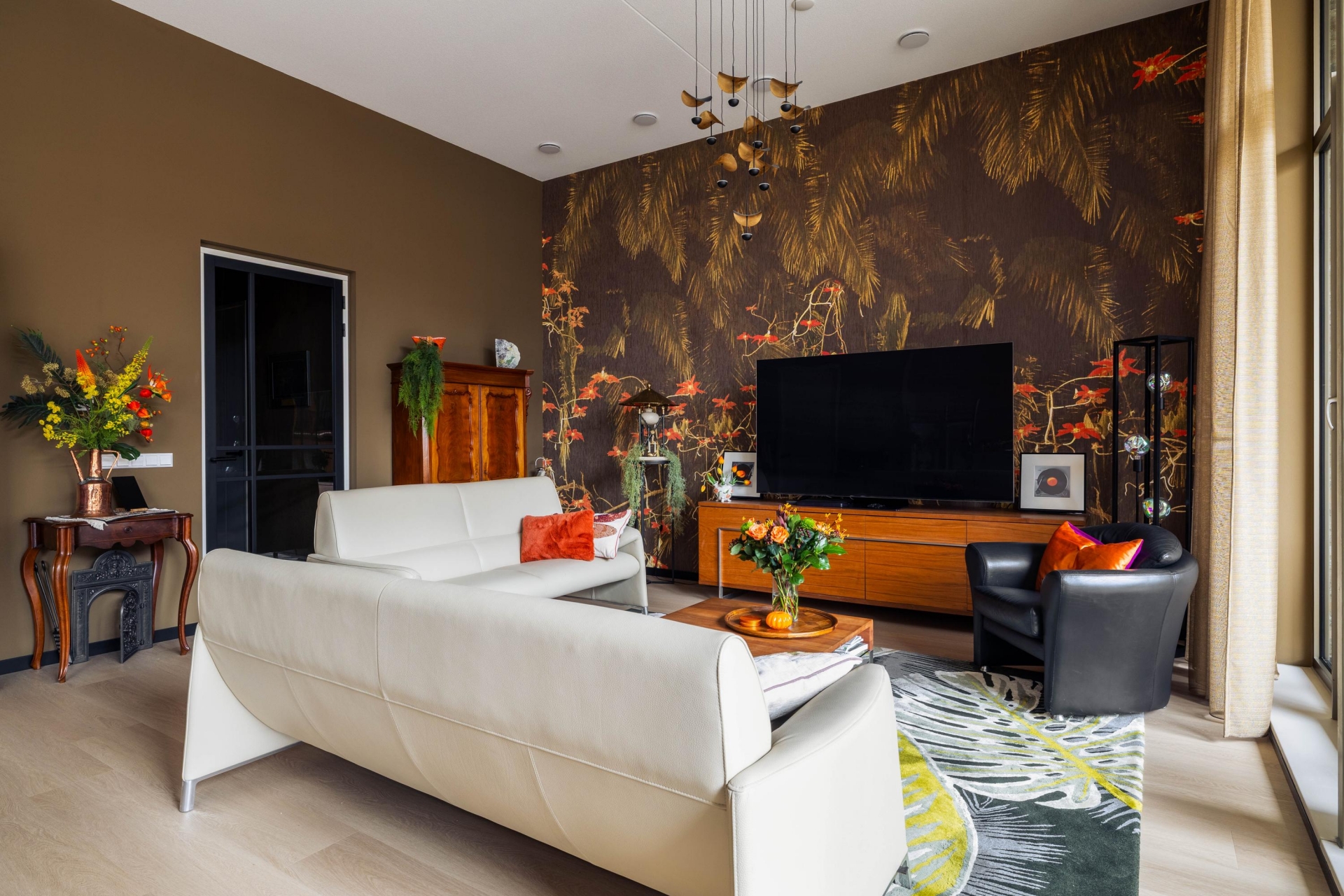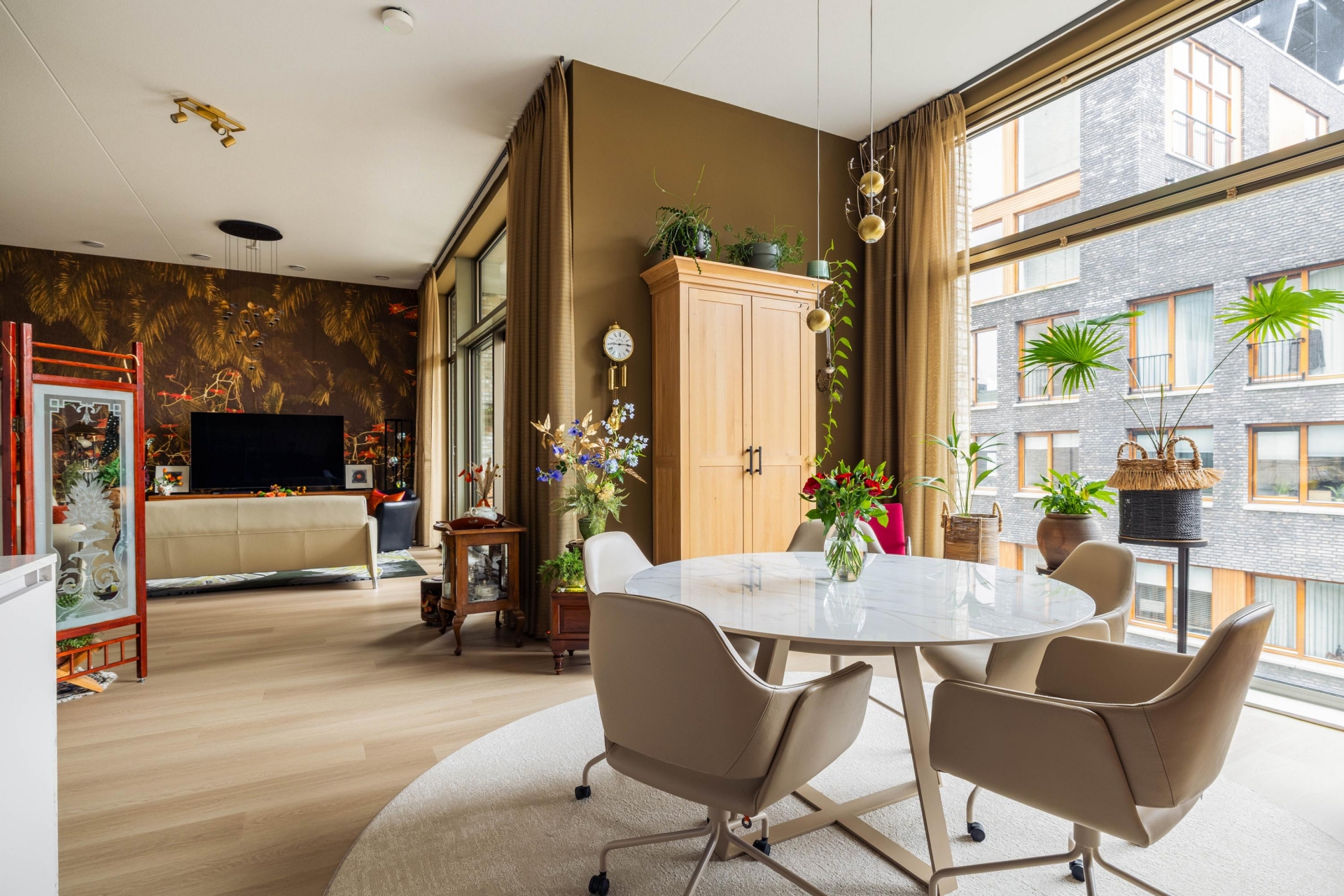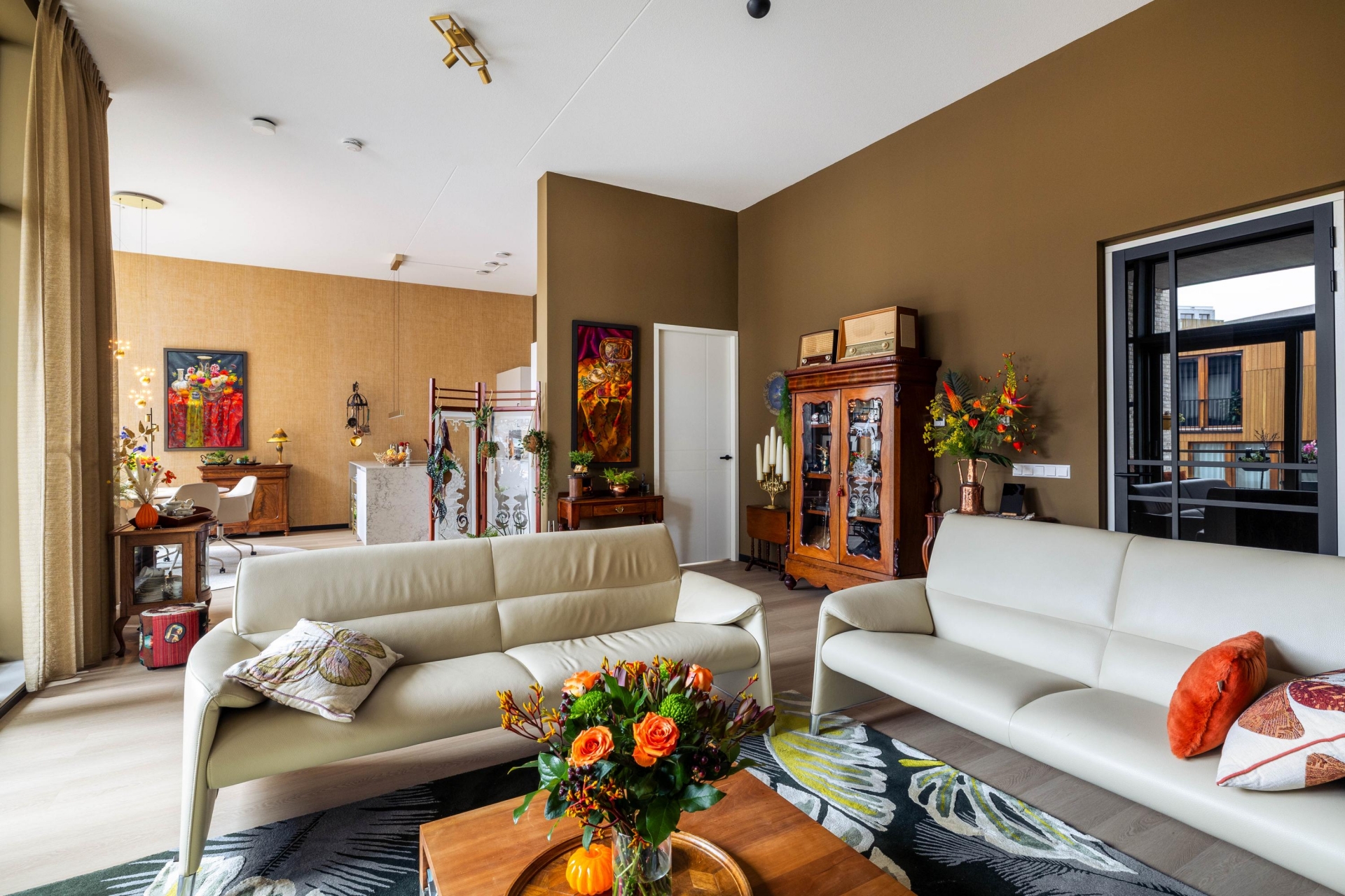 De royale woonkamer is opvallend ruim en beschikt over een indrukwekkende plafondhoogte van circa 3,63 meter, wat zorgt voor een open en lichte sfeer. Grote raampartijen en een schuifpui naar het balkon versterken het ruimtelijke gevoel en creëren een prettige verbinding tussen binnen en buiten.
