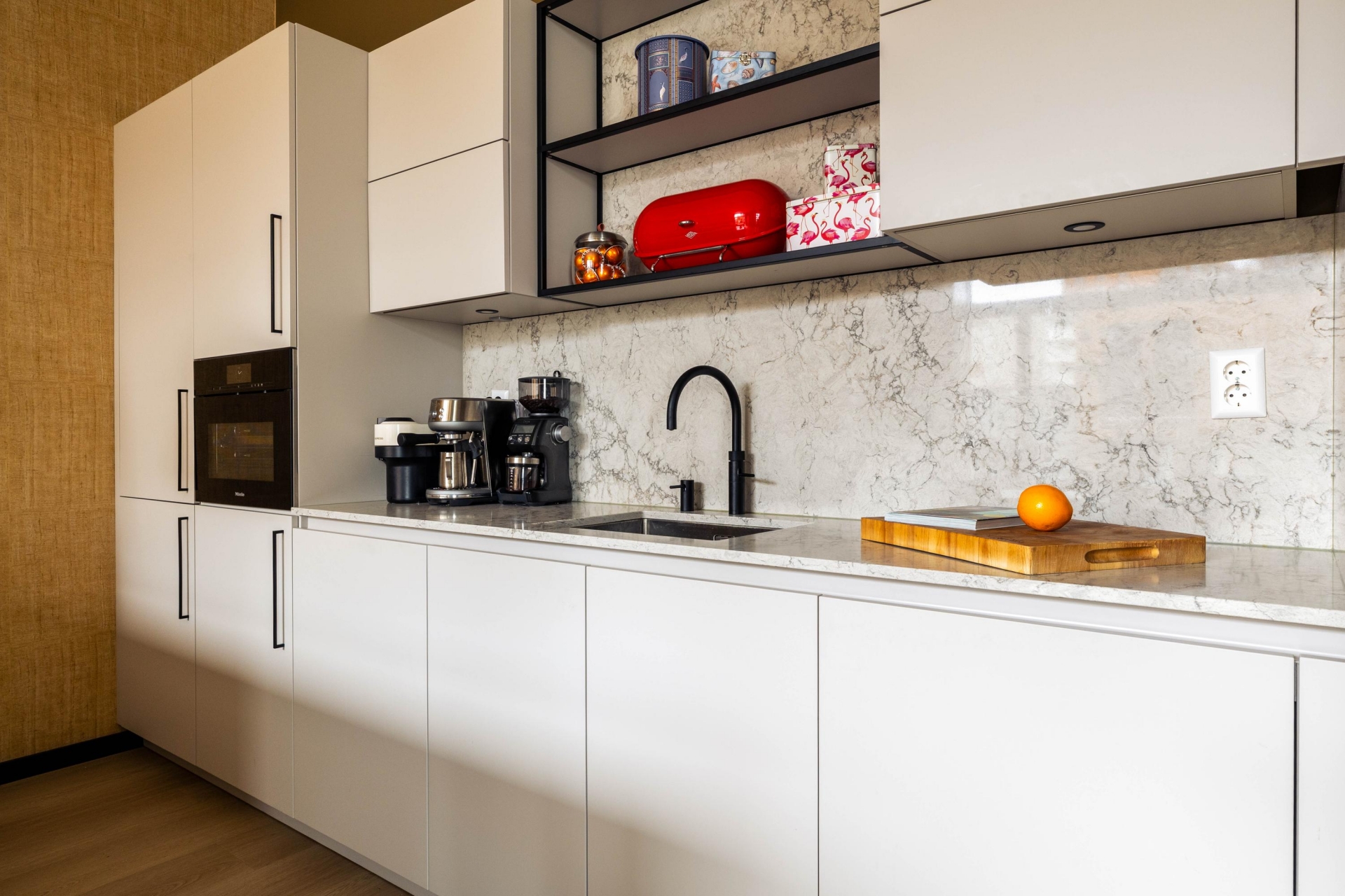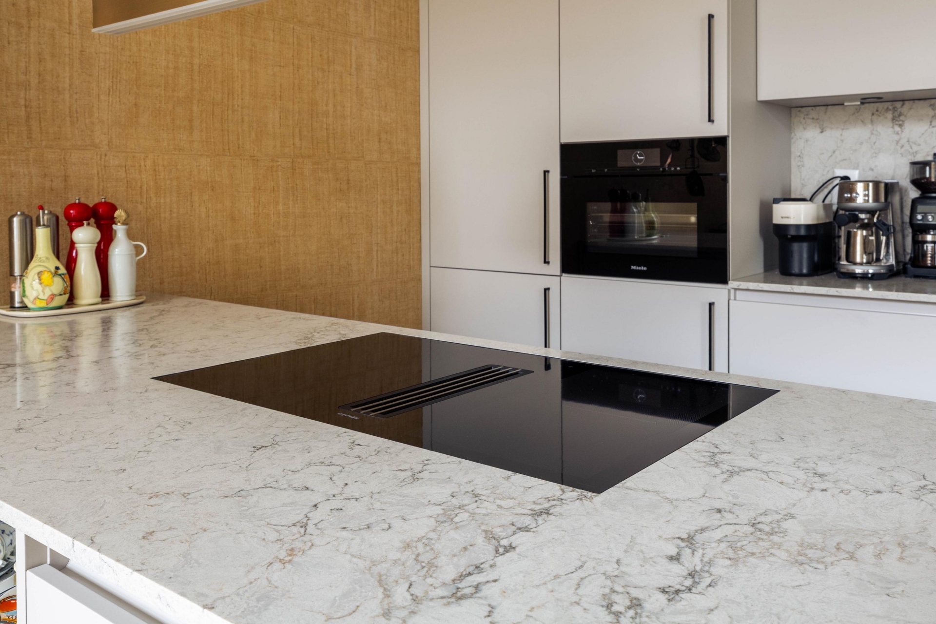 De luxe open keuken vormt het hart van de woning en is uitgevoerd met een stijlvol kookeiland en hoogwaardige inbouwapparatuur (merk Miele), waaronder een inductiekookplaat met geïntegreerde afzuiging, bak- en stoomoven (met geïntegreerde watertoevoer), vaatwasser, koelvries-combinatie en een Quooker. Een keuken die zowel functioneel als esthetisch overtuigt.