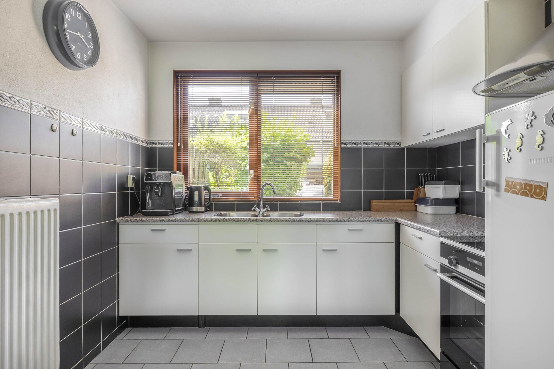 De woonkamer is ruim en prettig ingedeeld, met grote raampartijen aan de achterzijde die uitkijken op de groene tuin. Hier is voldoende plek voor een royale zithoek én eettafel. Via de openslaande deuren stap je direct de tuin in, wat op zonnige dagen voor een fijne verbinding tussen binnen en buiten zorgt. Aan de voorzijde van het huis bevindt zich de open keuken. Deze is eenvoudig, maar functioneel en beschikt over de nodige kastruimte, een dubbel werkblad en diverse apparatuur. Dankzij het raam aan de straatzijde is ook hier sprake van prettig daglicht.