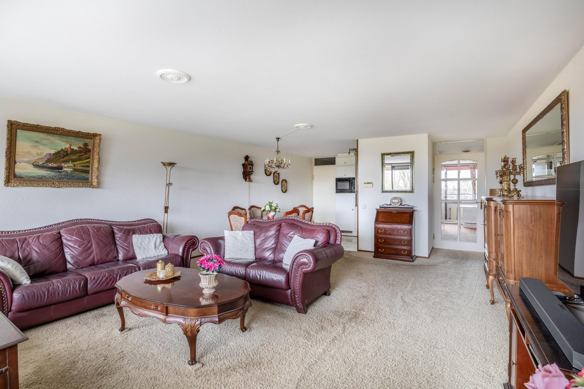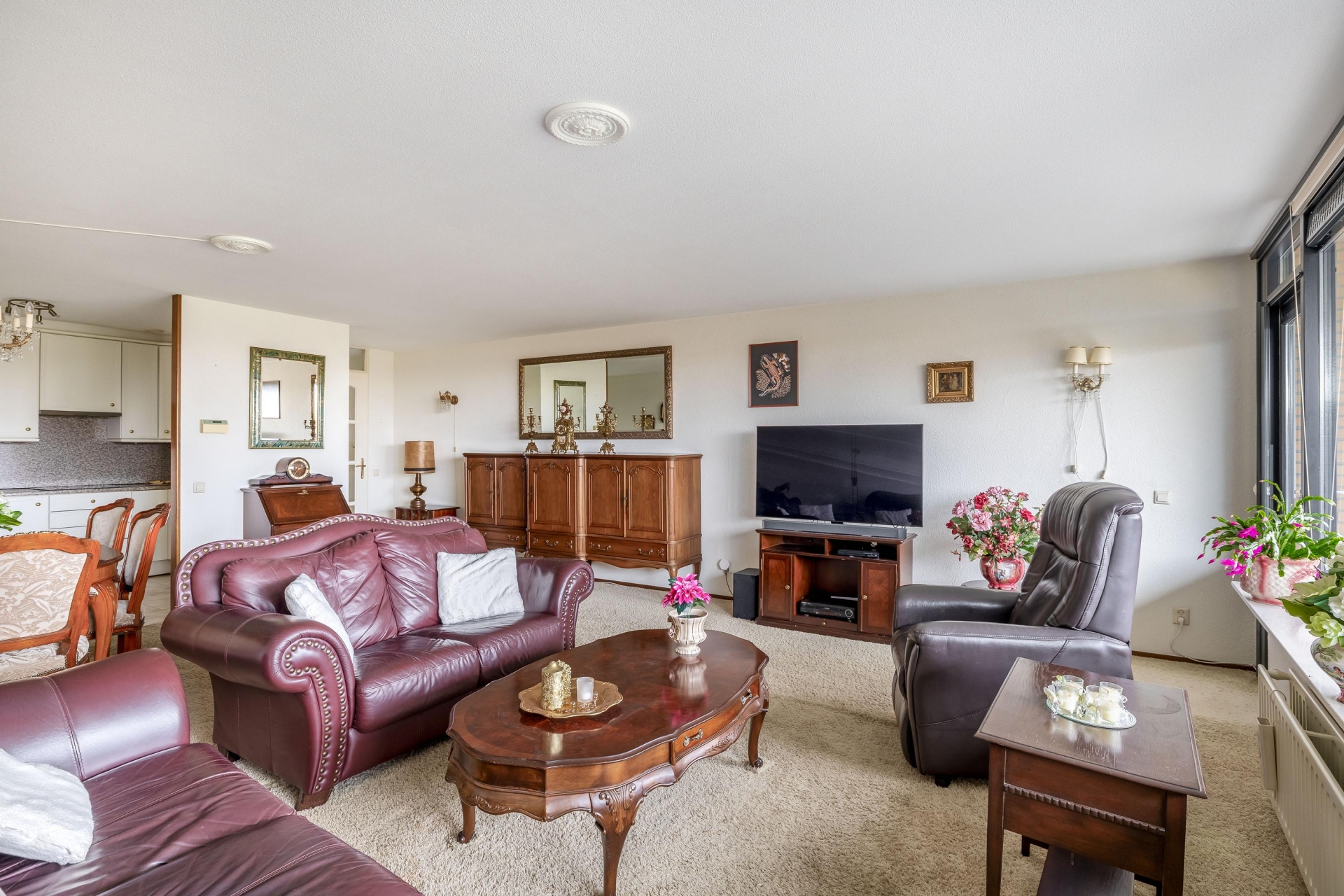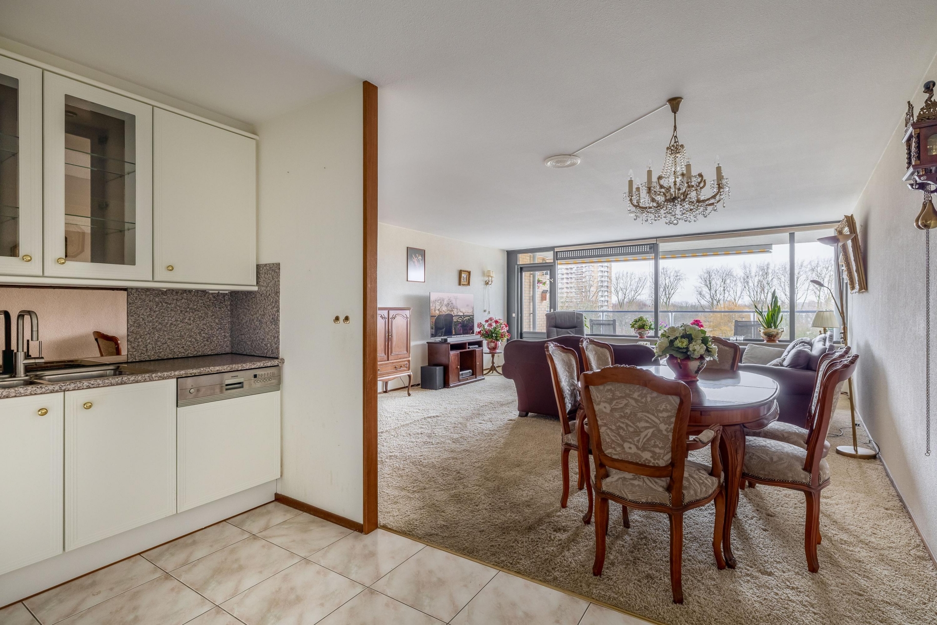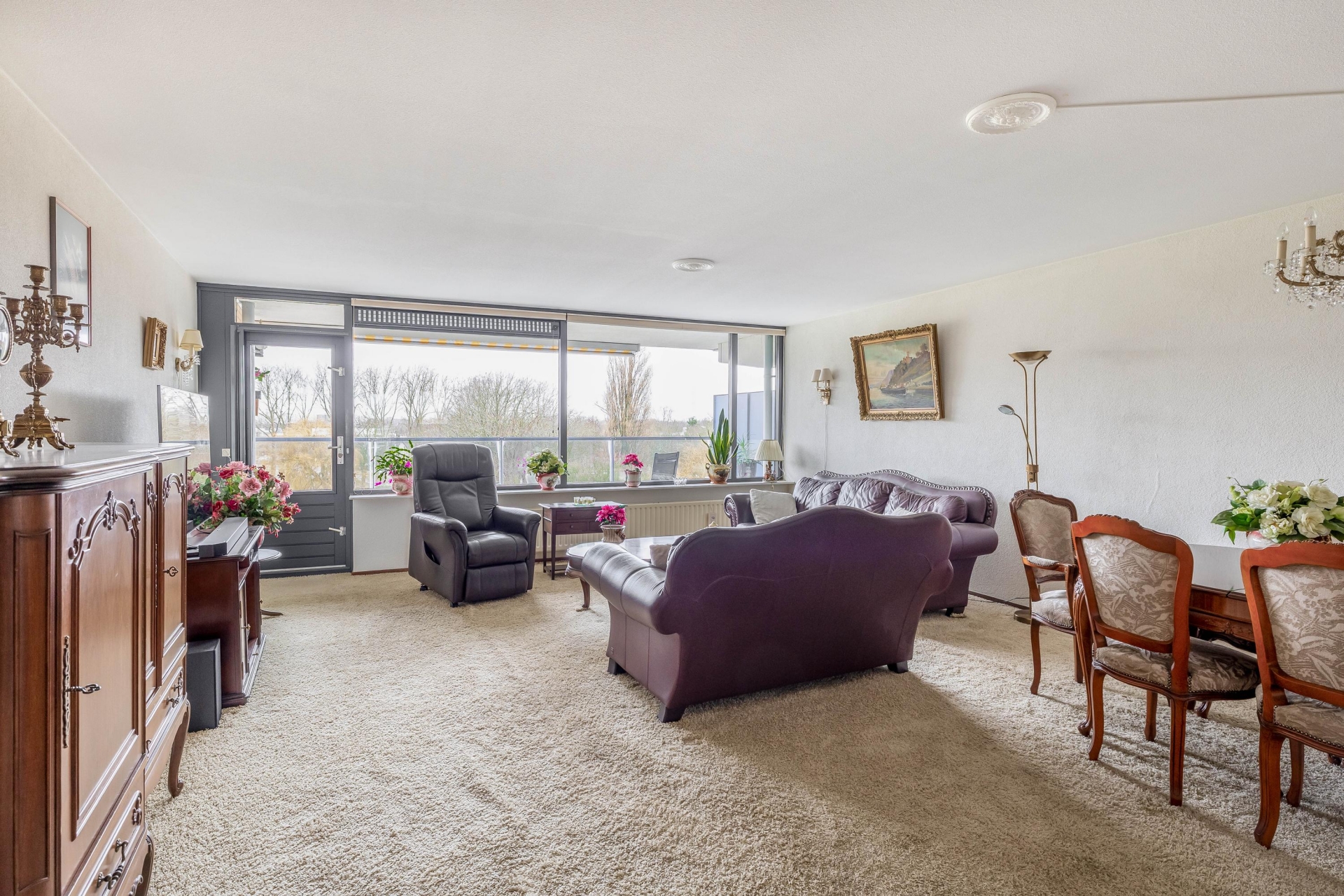 De ruime woonkamer is een heerlijke leefruimte met grote raampartijen en directe toegang tot het royale balkon op het westen. Hier geniet je volop van de middag- en avondzon met een weids uitzicht over het park – een uniek gevoel van vrijheid midden in de stad.