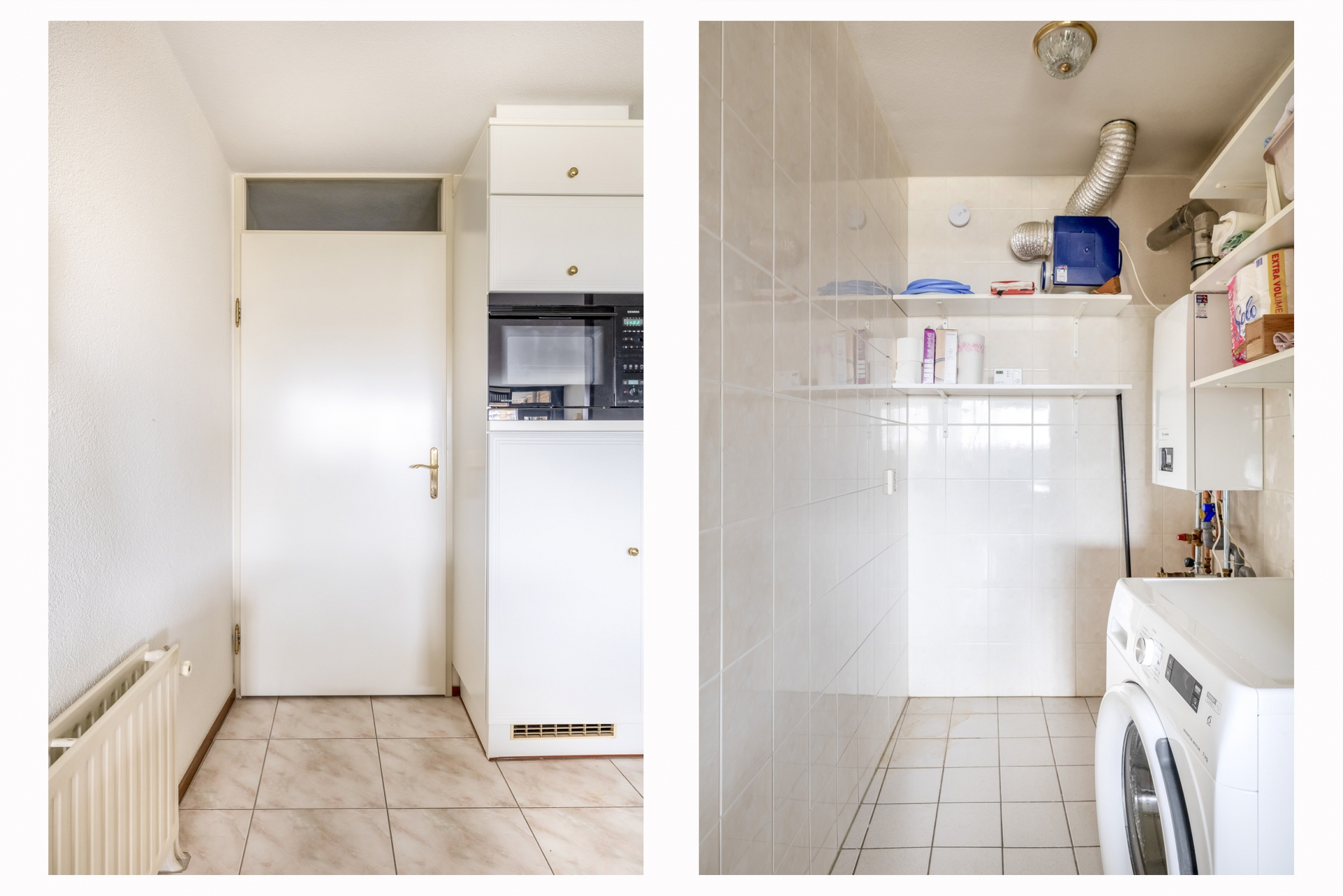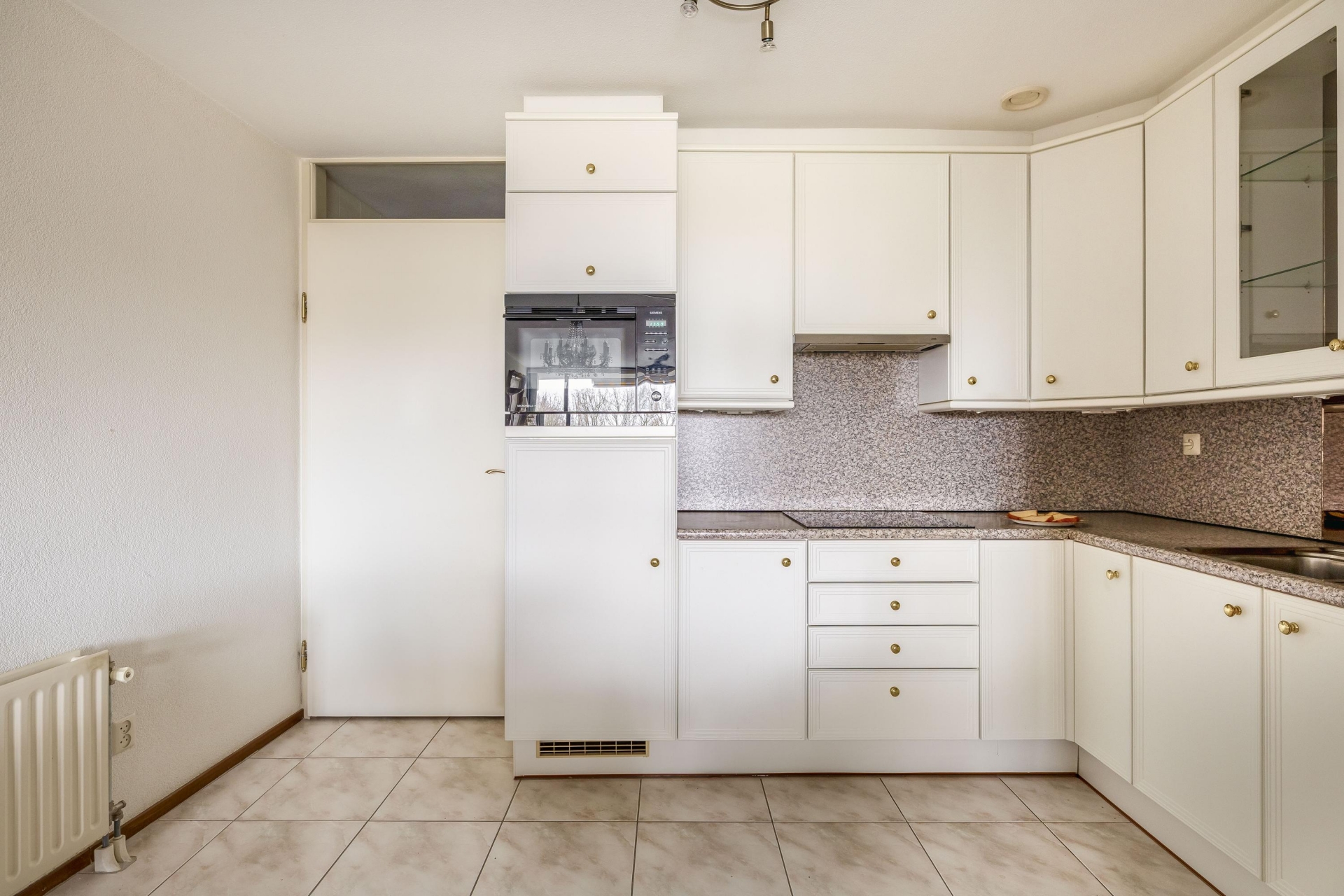De open keuken is opgesteld in een praktische hoekopstelling en voorzien van inbouwapparatuur van Siemens. Aansluitend bevindt zich de bijkeuken/wasruimte met de Remeha CV-combiketel (2022) en de mechanische ventilatie.