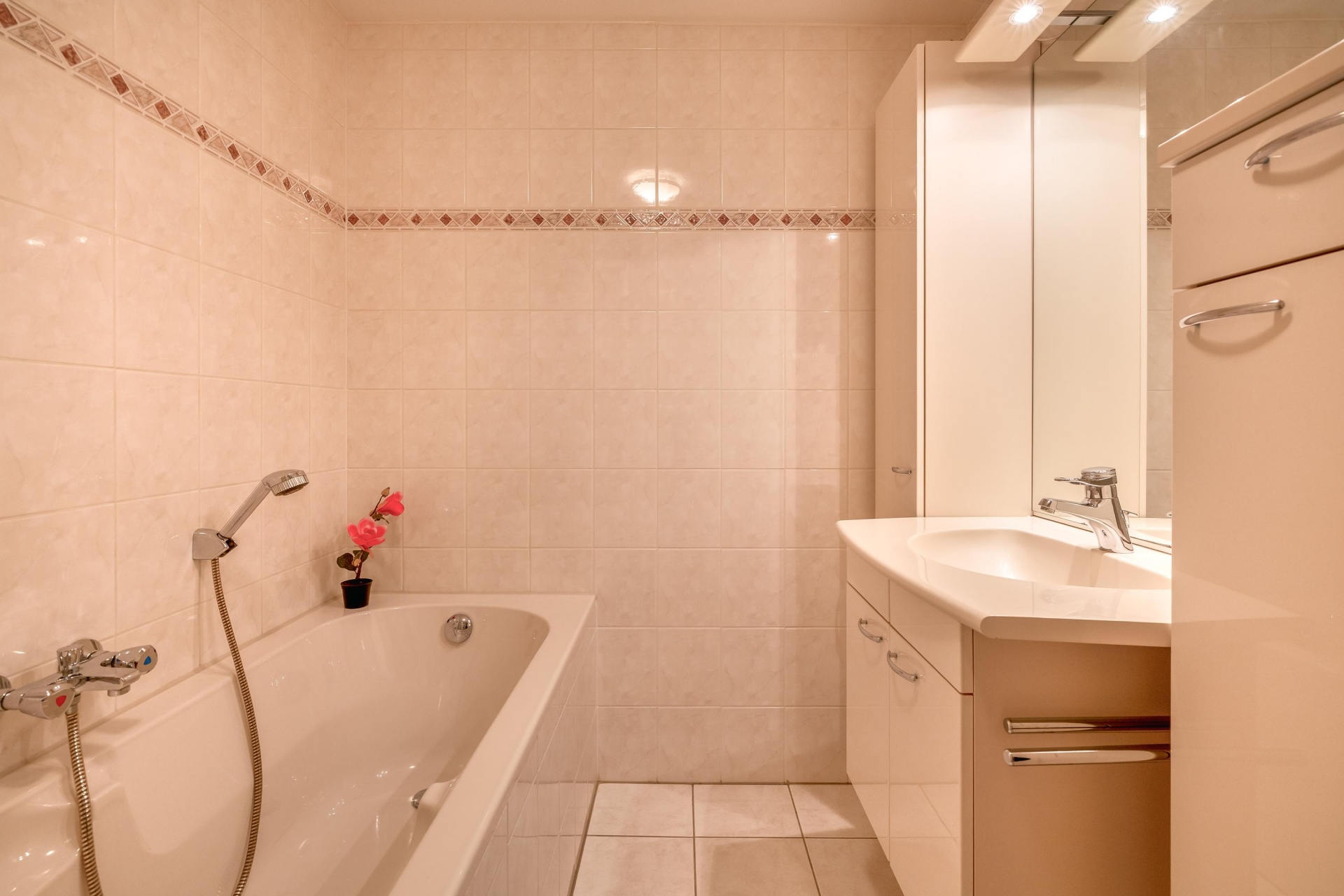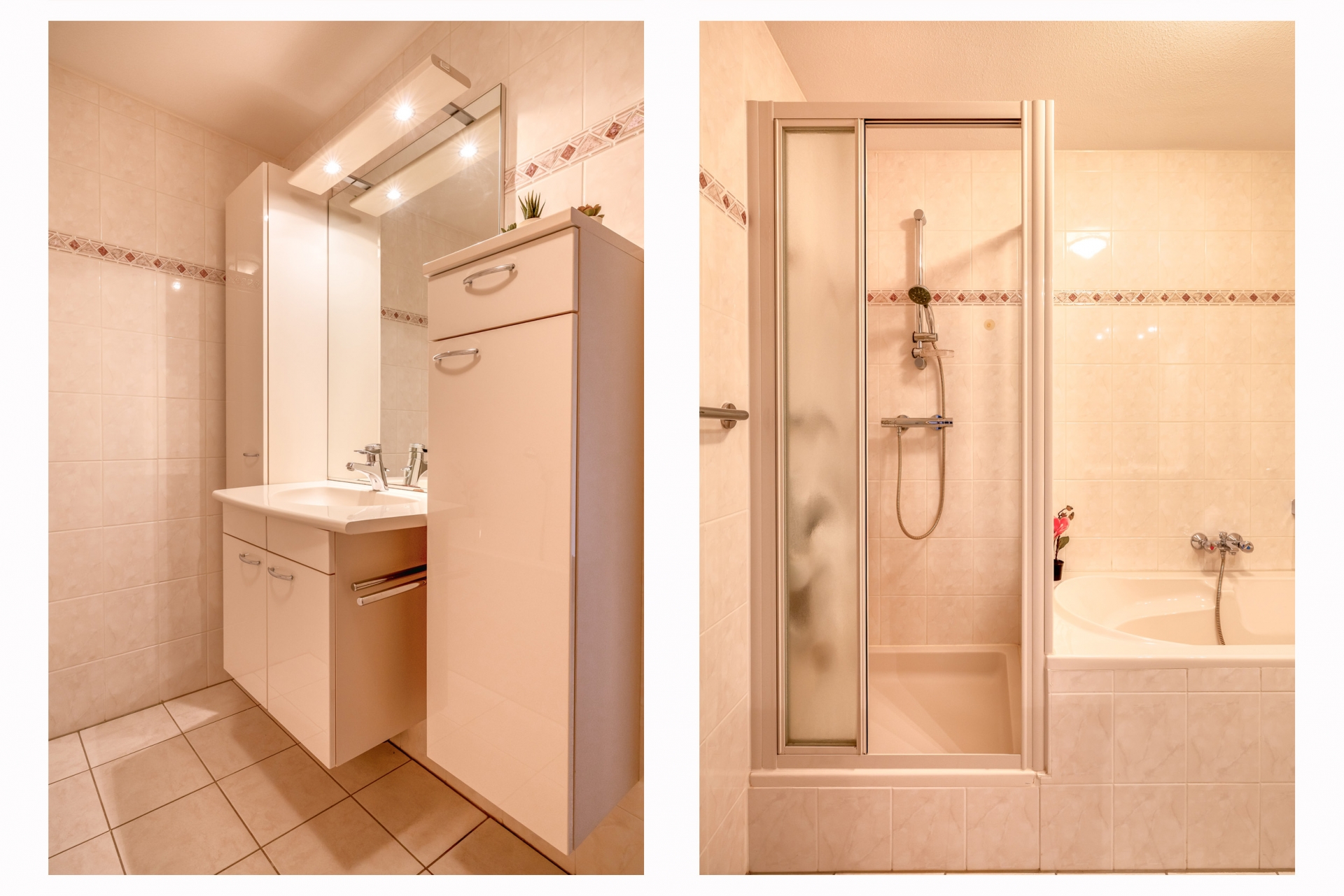 De geheel betegelde badkamer beschikt over een douchecabine, een ligbad en een wastafelmeubel. Het toilet is separaat en eveneens volledig betegeld met een fonteintje.