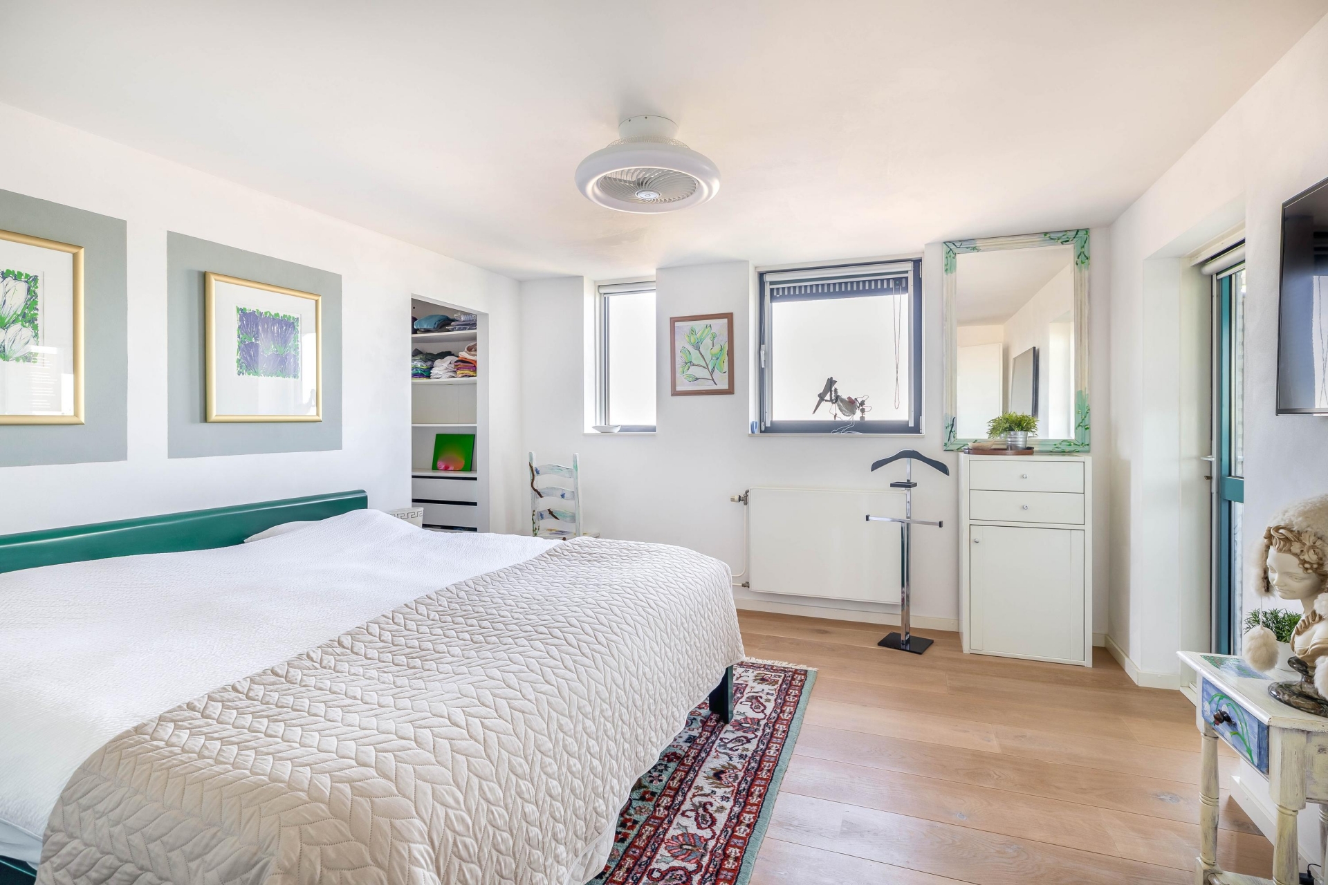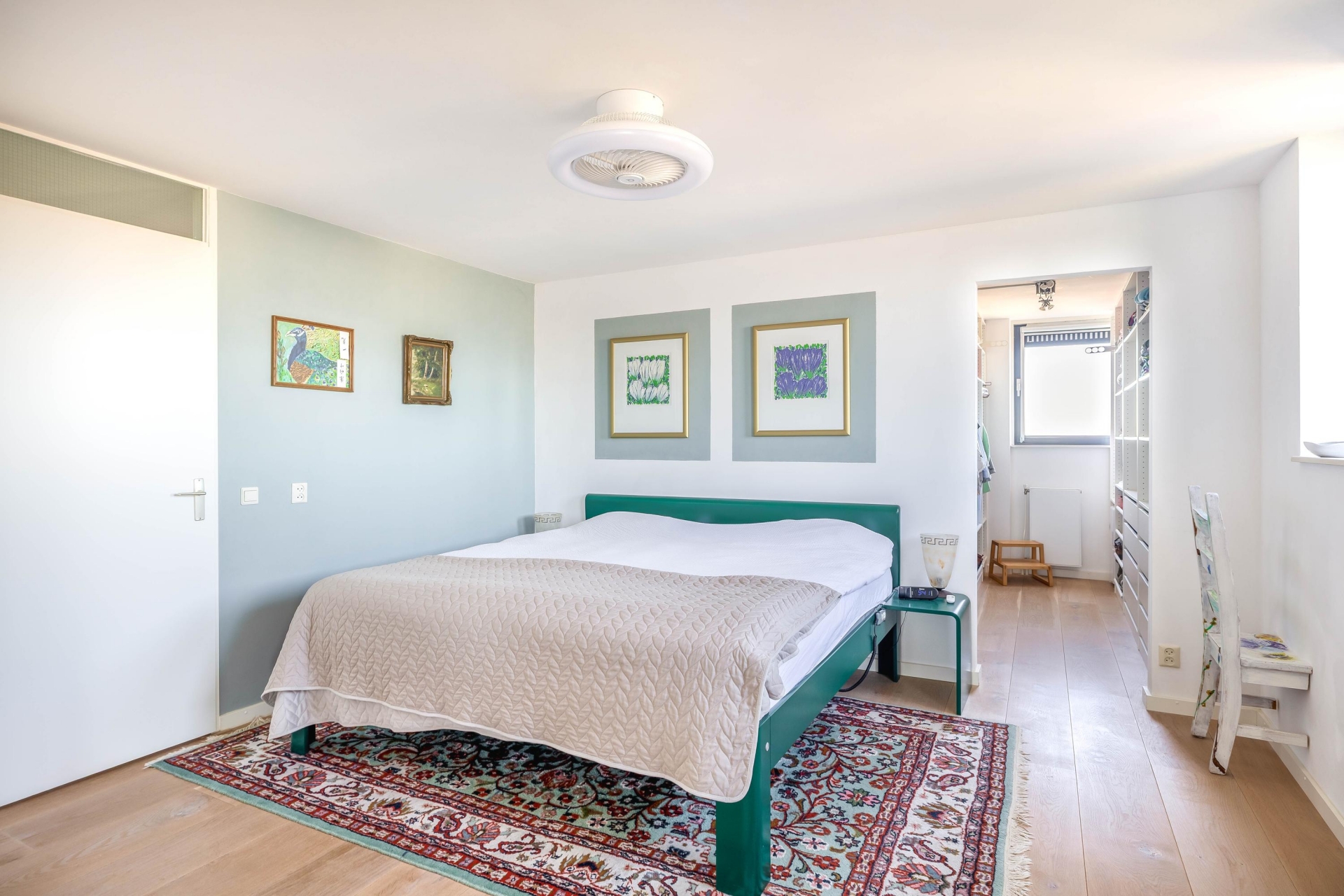 Het appartement beschikt over twee ruime slaapkamers. De hoofdslaapkamer is royaal van formaat en biedt directe toegang tot een praktische walk-in closet. Deze ruimte is ideaal voor het overzichtelijk opbergen van kleding en accessoires en draagt bij aan het comfortabele karakter van de woning.