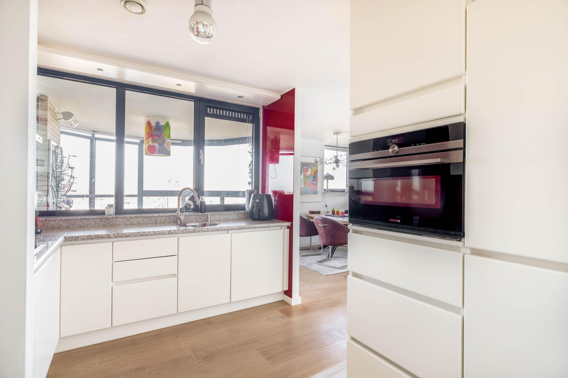 De open keuken sluit perfect aan op de woonruimte en heeft een moderne uitstraling. De keuken is praktisch ingericht en voorzien van diverse inbouwapparatuur, waardoor koken hier een plezier wordt. Dankzij de open opstelling blijft u tijdens het koken in contact met de woonkamer en het uitzicht naar buiten.
