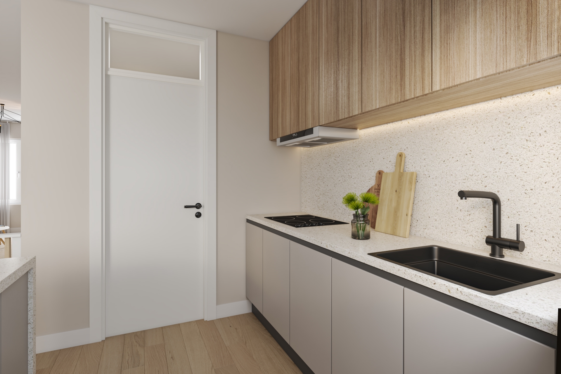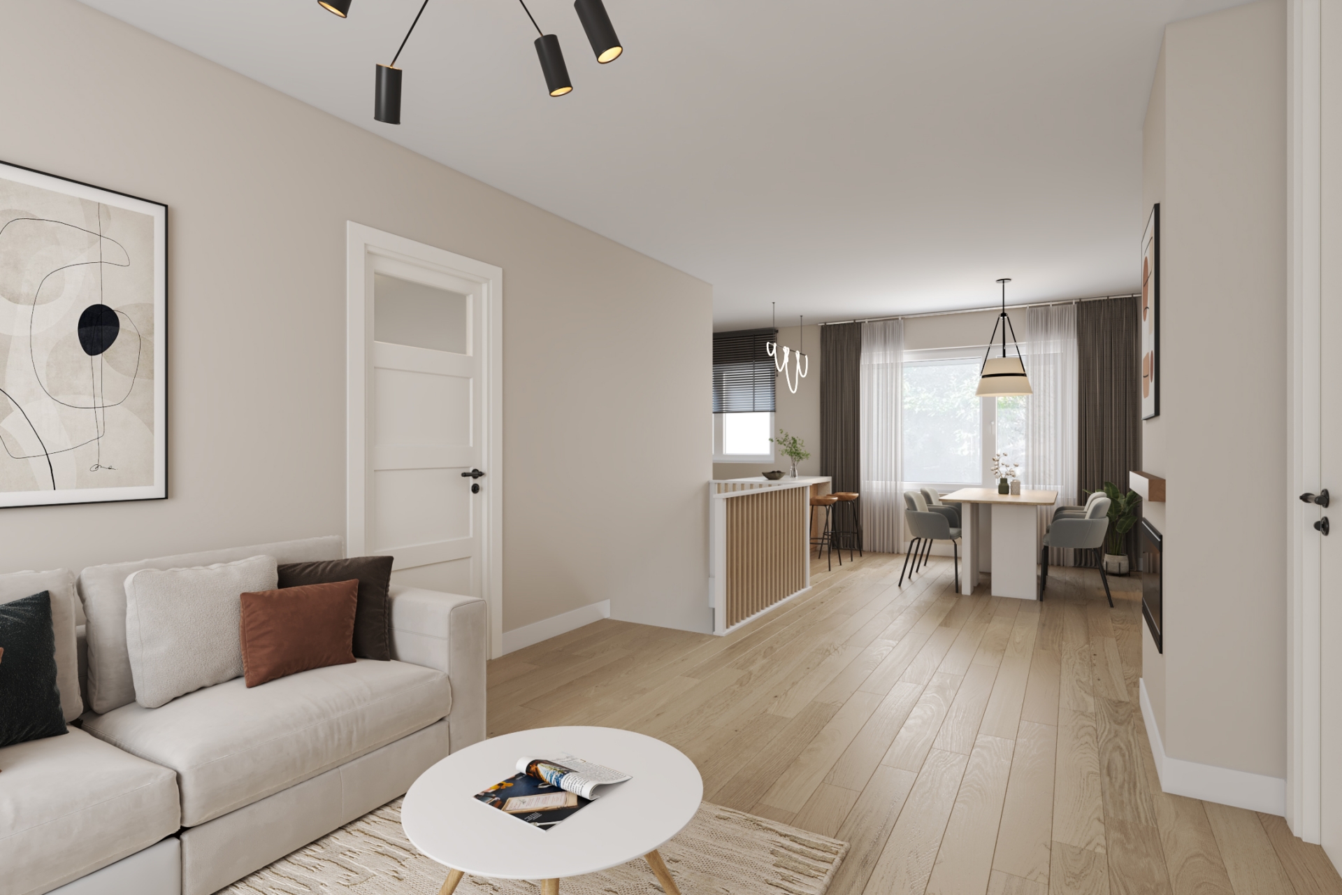 Via de entree bereik je de woning op de eerste woonlaag. De woonkamer vormt het centrale punt van het appartement en biedt voldoende ruimte voor zowel een comfortabele zithoek als een eethoek.