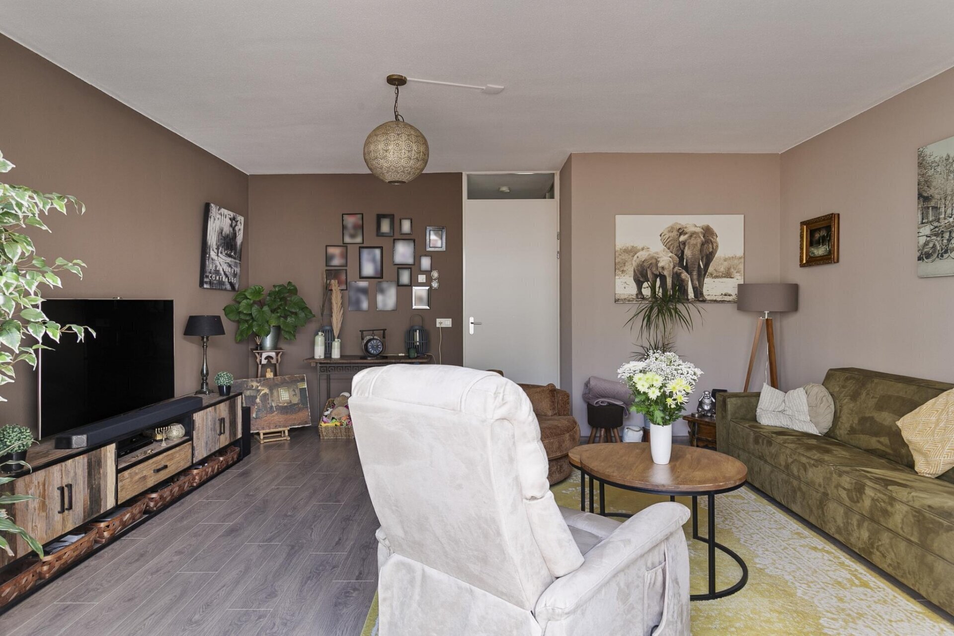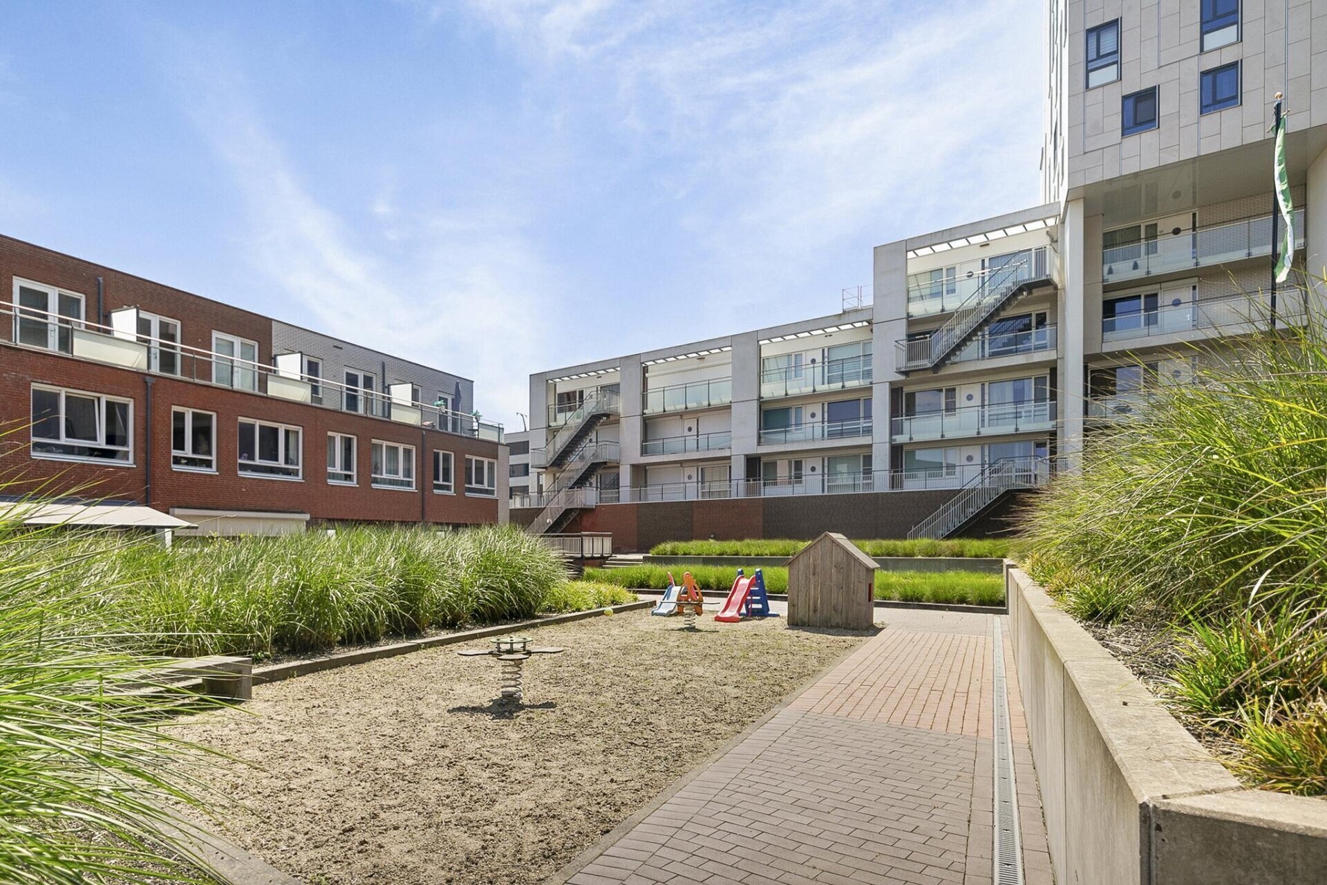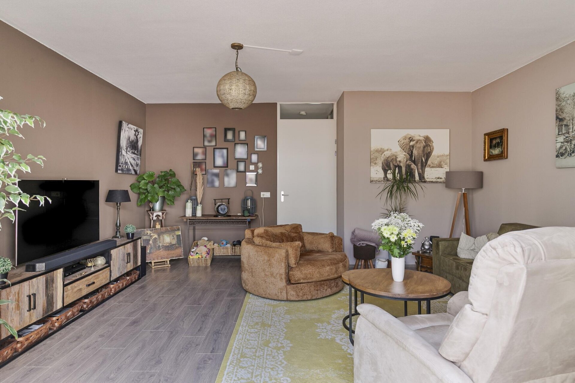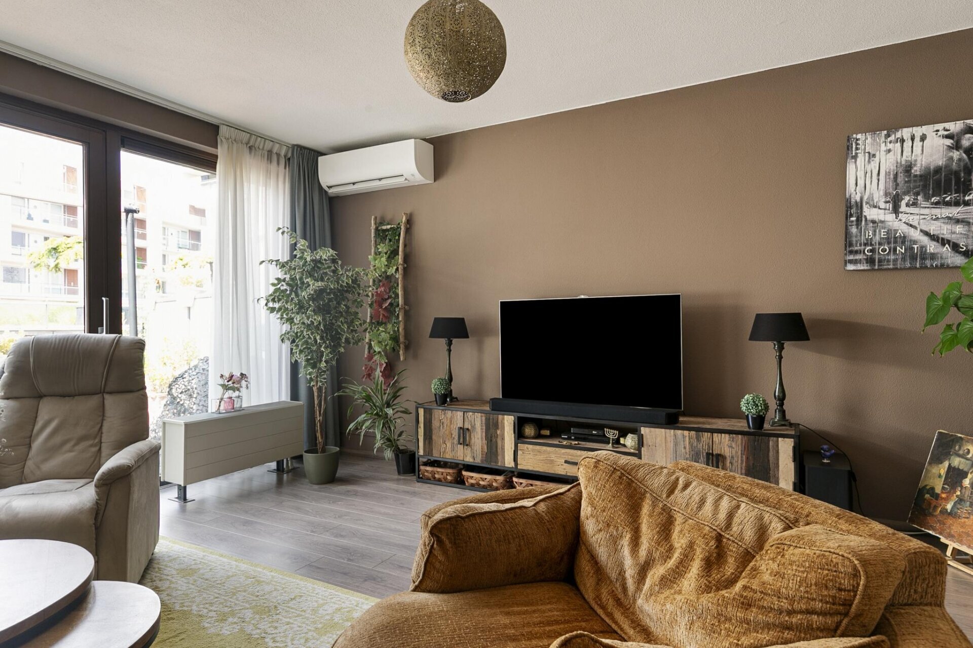 De woonkamer ligt aan de achterzijde van het appartement en heeft een sierhaard en een schuifpui naar het terras van ruim 30 m², gelegen op het zonnige westen en grenzend aan de gezellige binnentuin met een speeltuin voor kinderen.