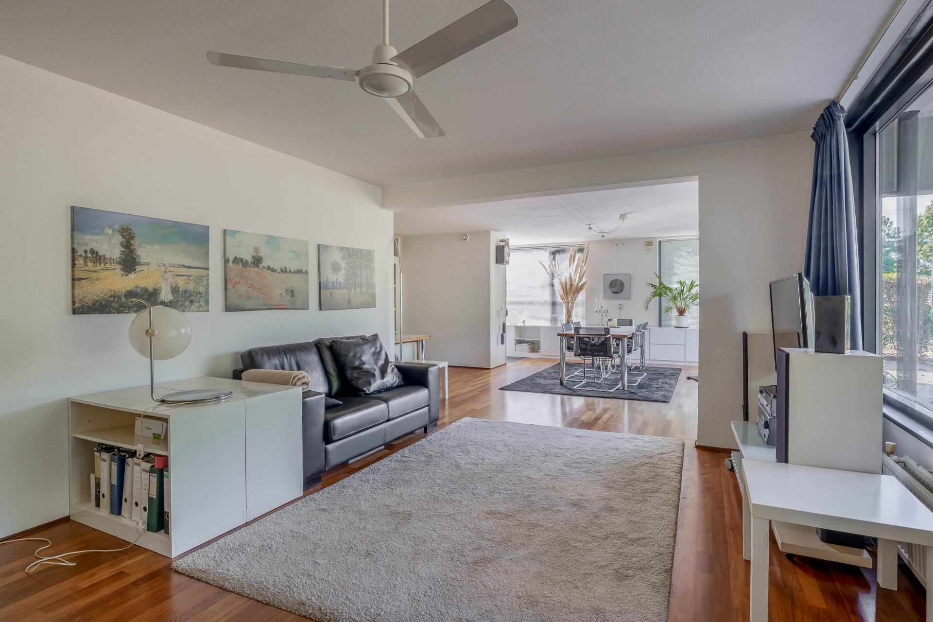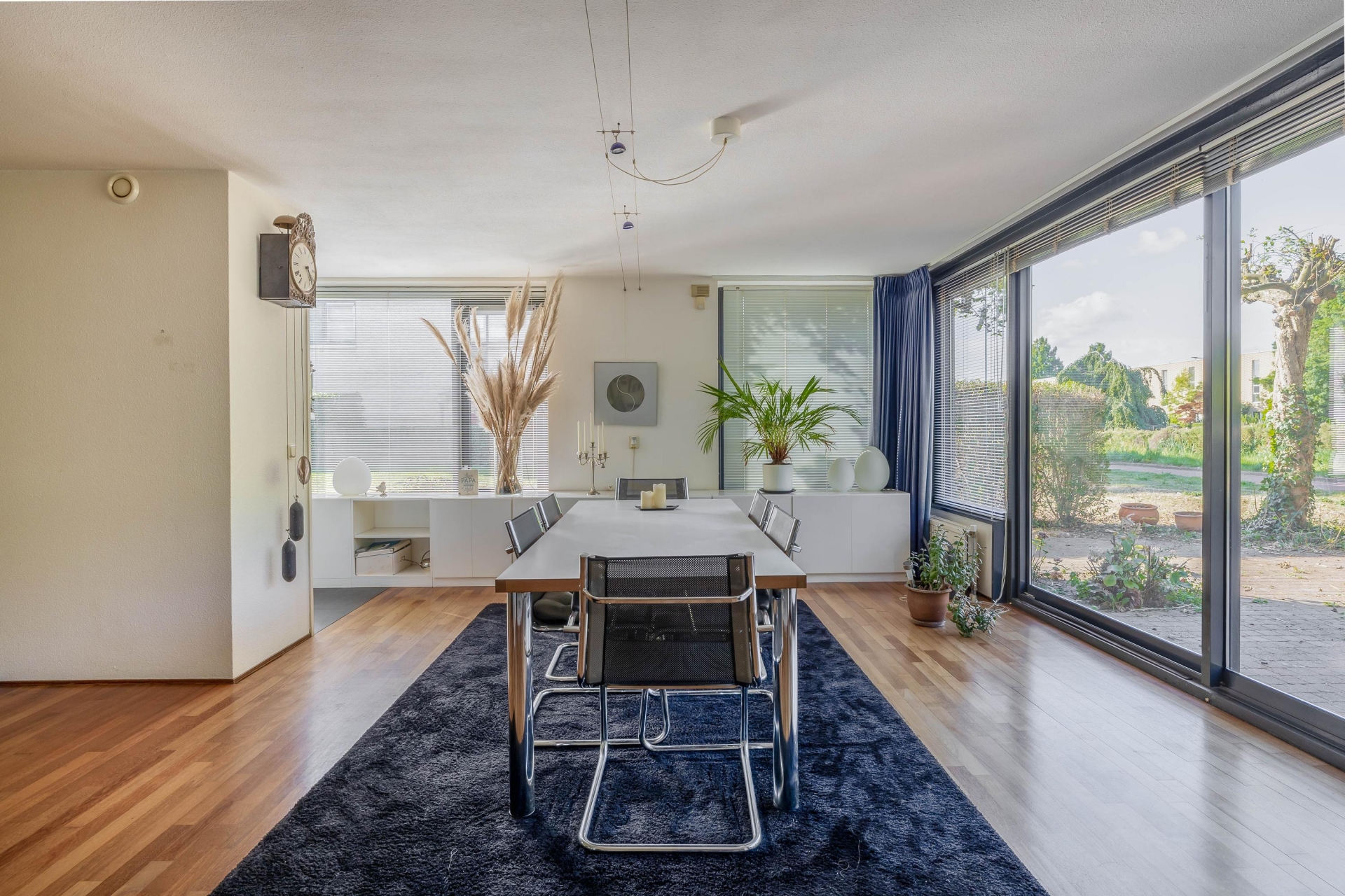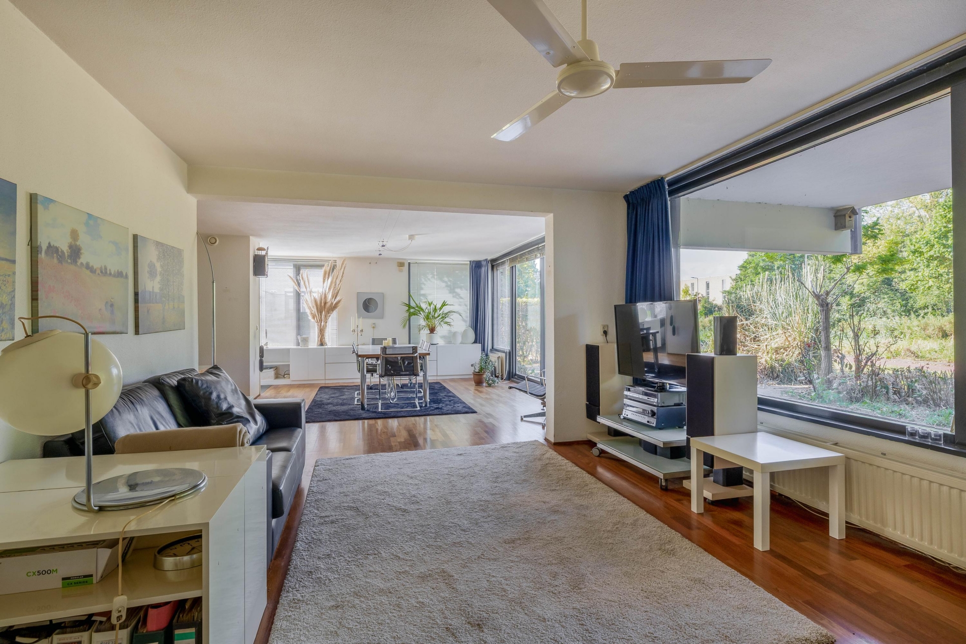 De woonkamer is aangenaam ruim en licht dankzij de grote schuifpui naar de zonnige achtertuin op het zuidwesten. Hier zit je ’s middags en ’s avonds heerlijk in de zon.