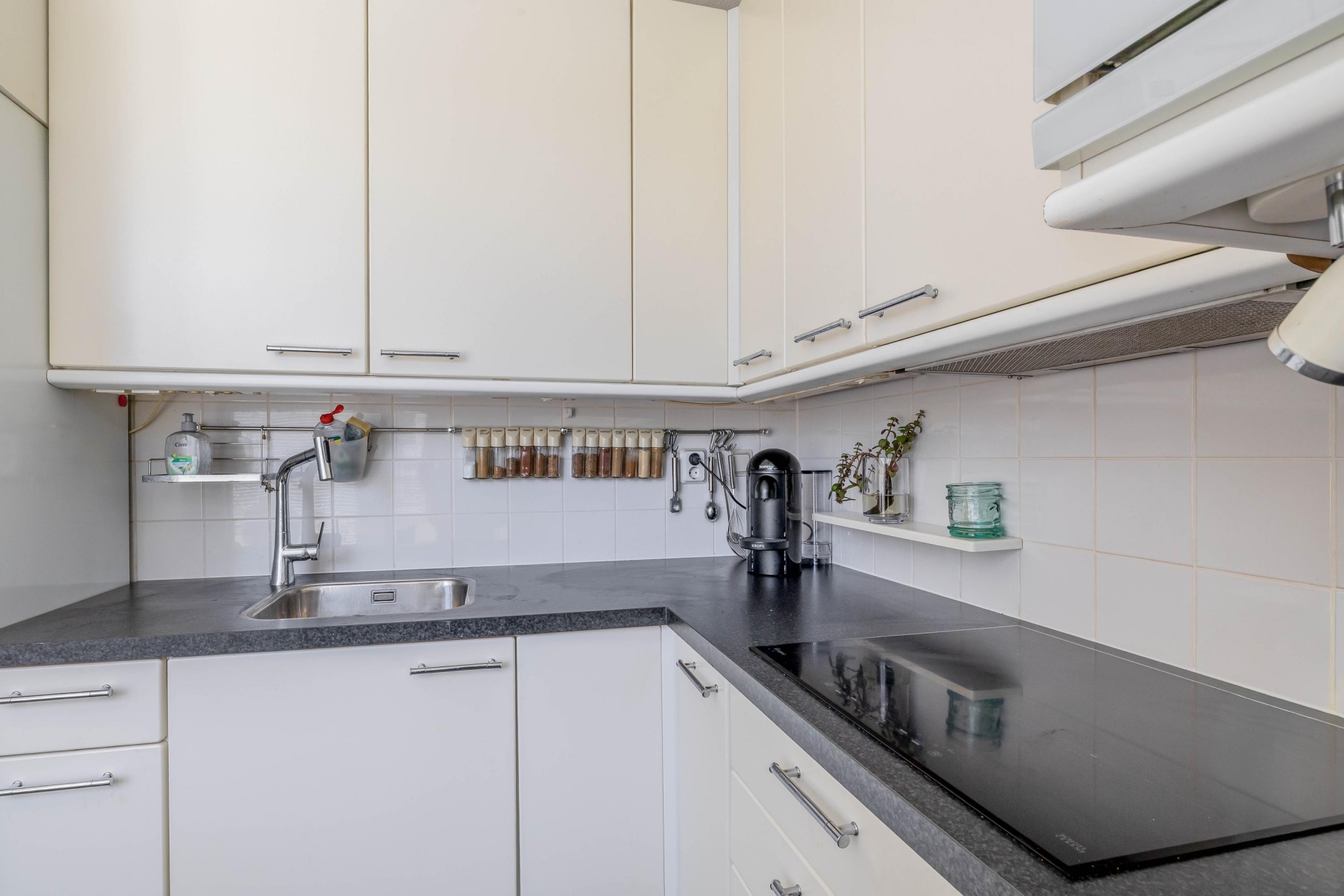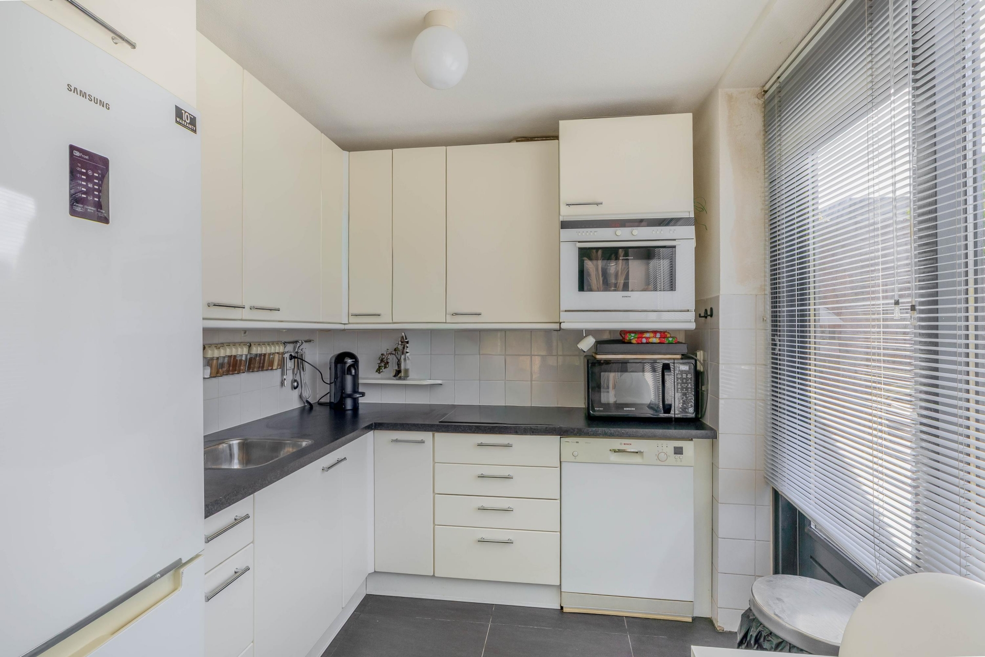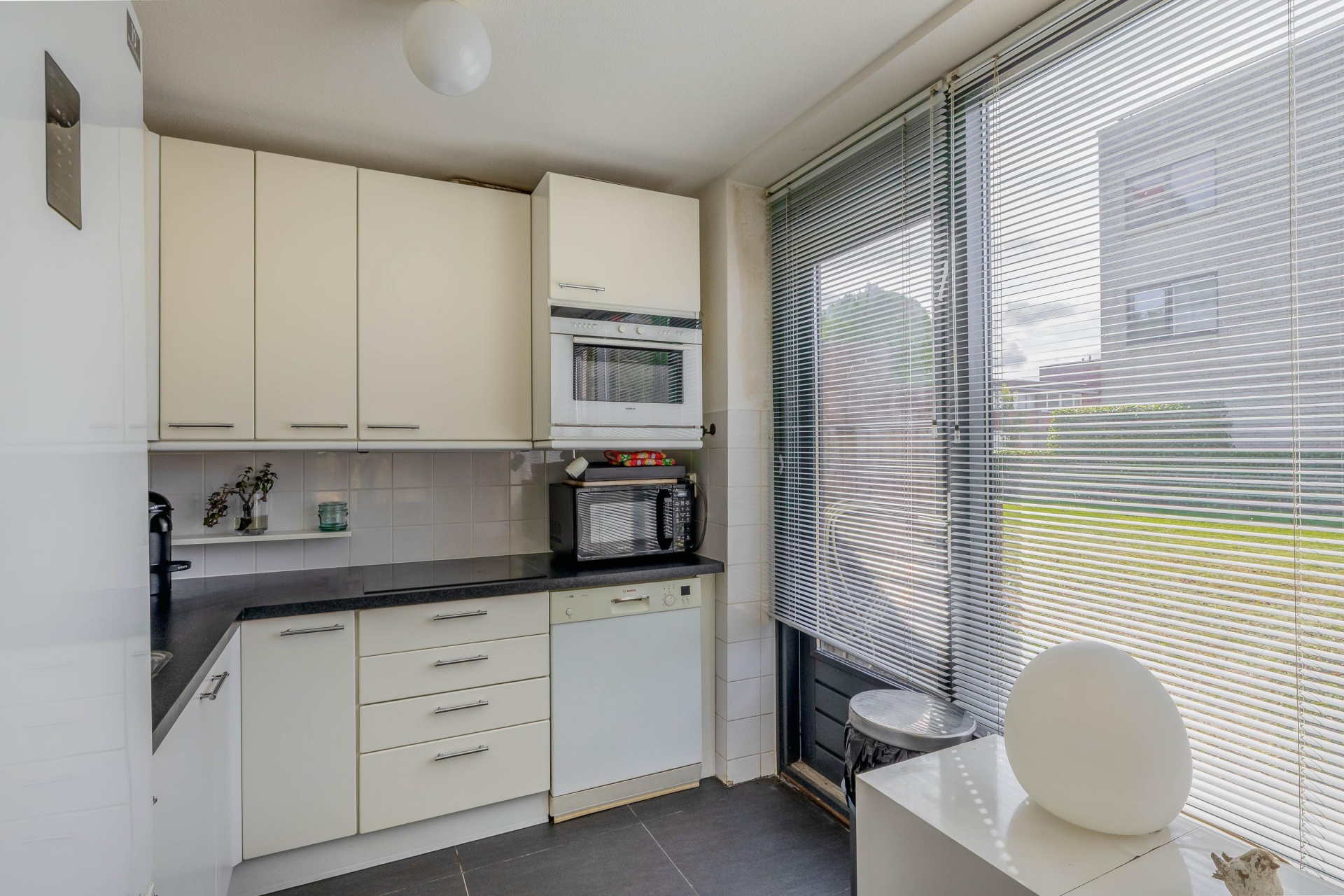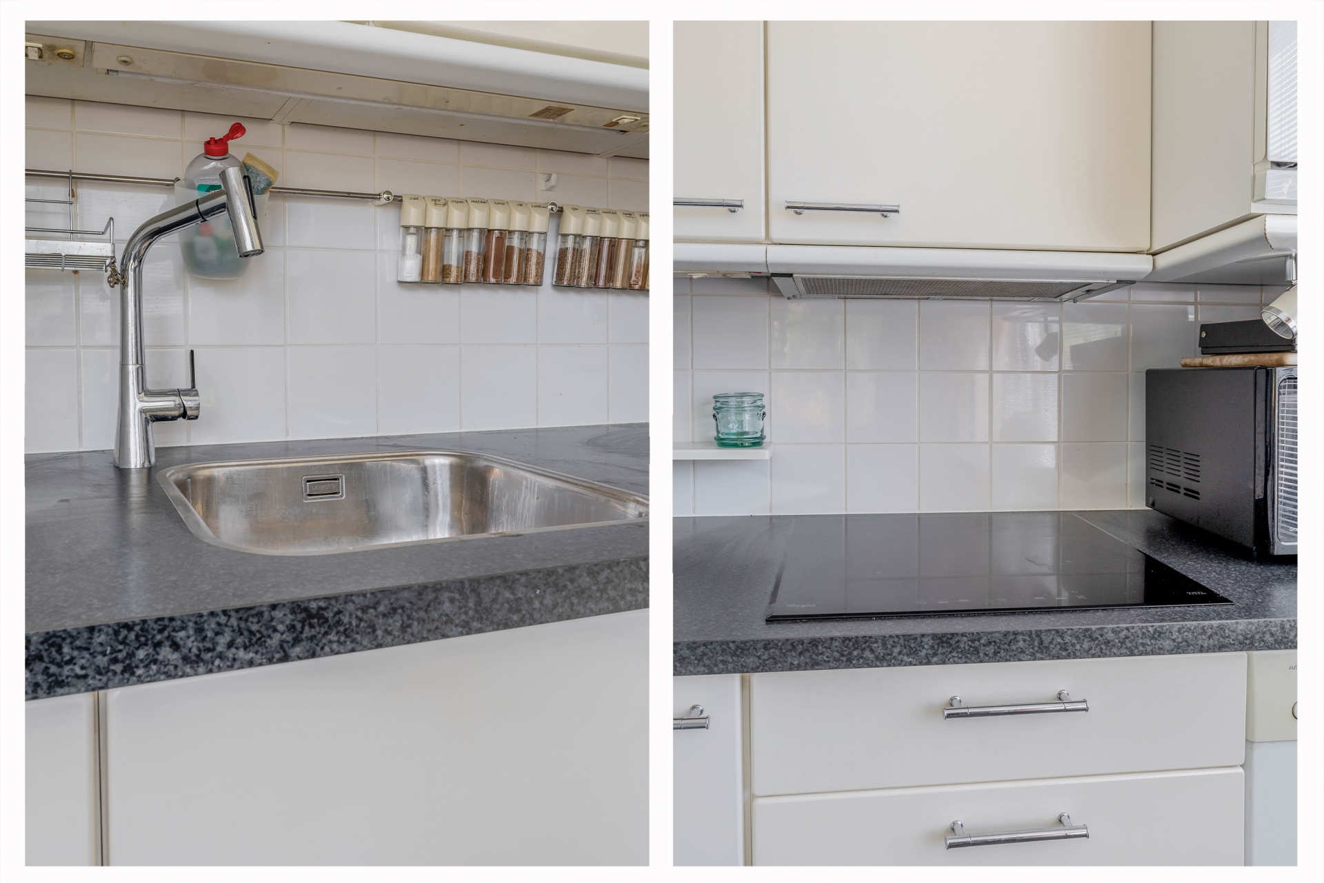 De halfopen keuken in L-opstelling is praktisch ingedeeld en beschikt over een nieuwe inductiekookplaat, een koel-vriescombinatie, vaatwasser en magnetron. Via de keuken heb je toegang tot een extra terras aan de zijkant van de woning, een fijne plek voor je ochtendkoffie of om even buiten te zitten.