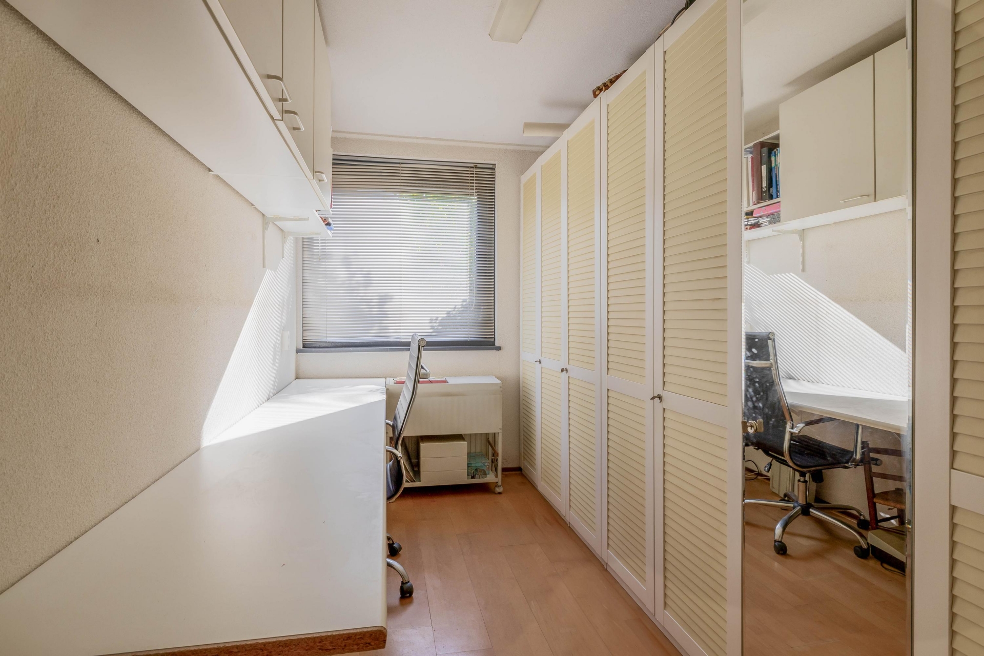 Aan de voorzijde van het huis bevinden zich twee slaapkamers. De grootste slaapkamer beschikt over een badkamer en-suite, voorzien van een ligbad met douche, een wastafelmeubel en een tweede toilet. De tweede slaapkamer is momenteel ingericht als kastenkamer met een grote schuifkastenwand, ideaal voor extra opbergruimte of als rustige werkplek.