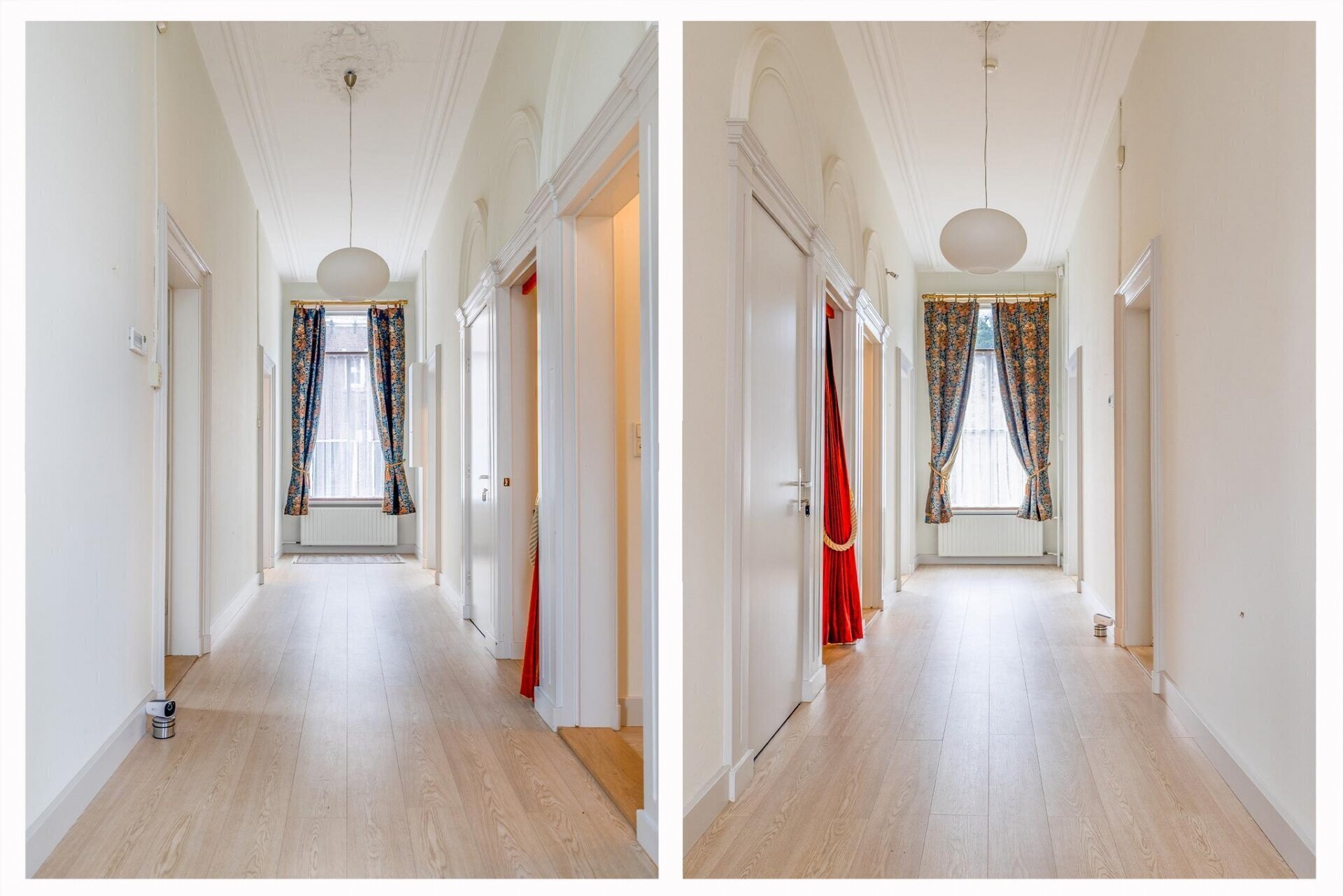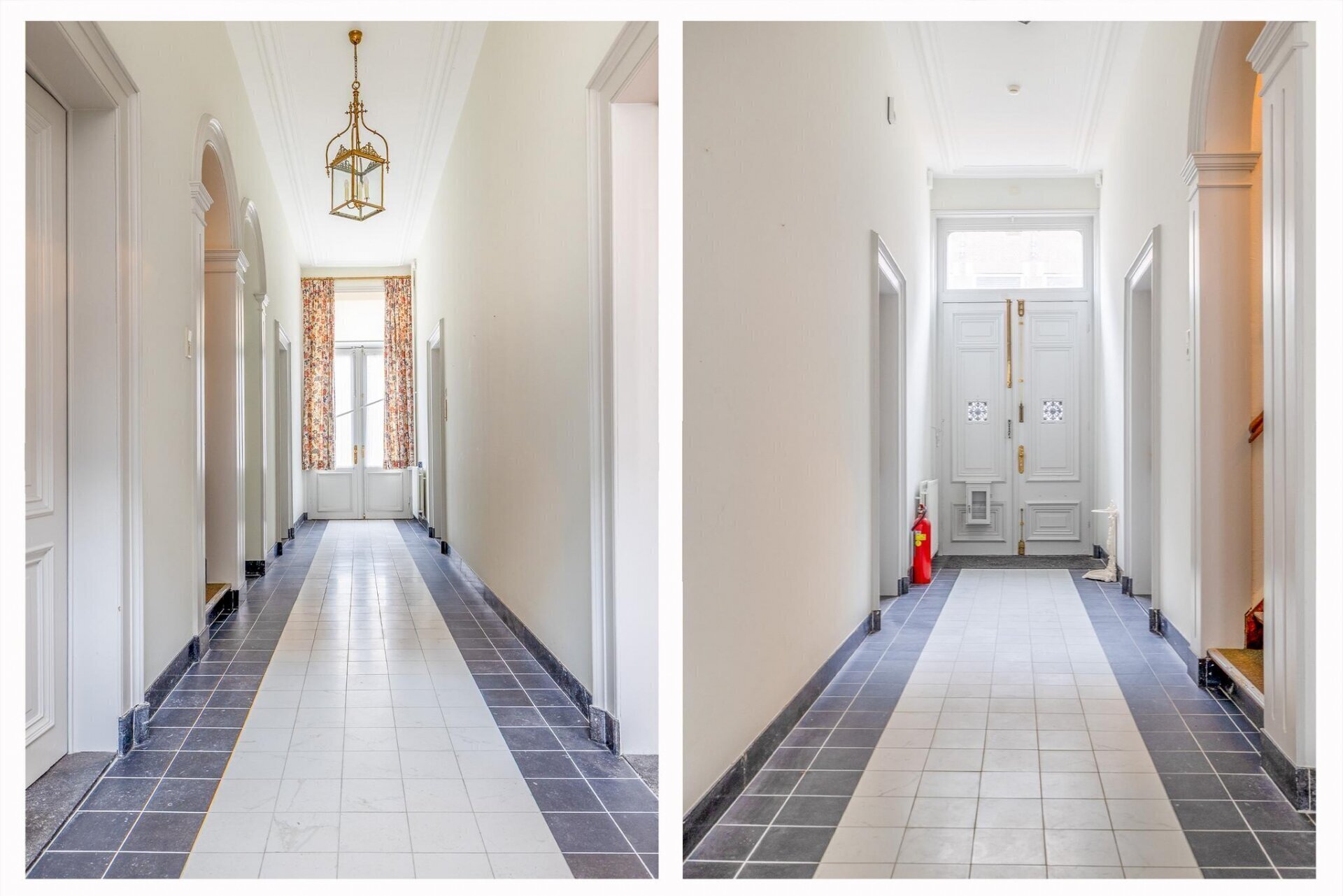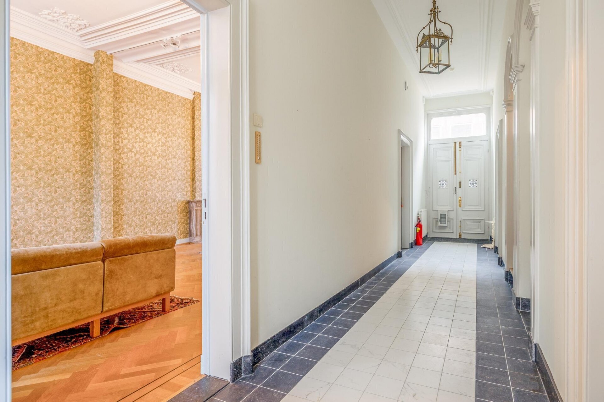 Bij binnenkomst via de karakteristieke dubbele paneeldeur betreedt u een statige en lange hal met marmeren plavuizen, die toegang biedt tot de verschillende vertrekken. Aan de rechterzijde bevindt zich de zeer ruime woonkamer. Deze kamer is voorzien van hoge plafonds, houten visgraat vloer, originele sierlijsten en marmeren schoorstenen, wat bijdraagt aan de grandeur van het pand. Aan de linker-voorzijde van de hal treft u een sfeervolle kamer, ideaal als bibliotheek of studeerkamer. Deze kamer is eveneens uitgerust met een marmeren schouw.