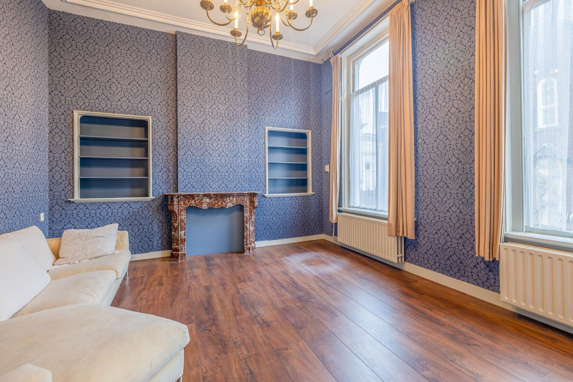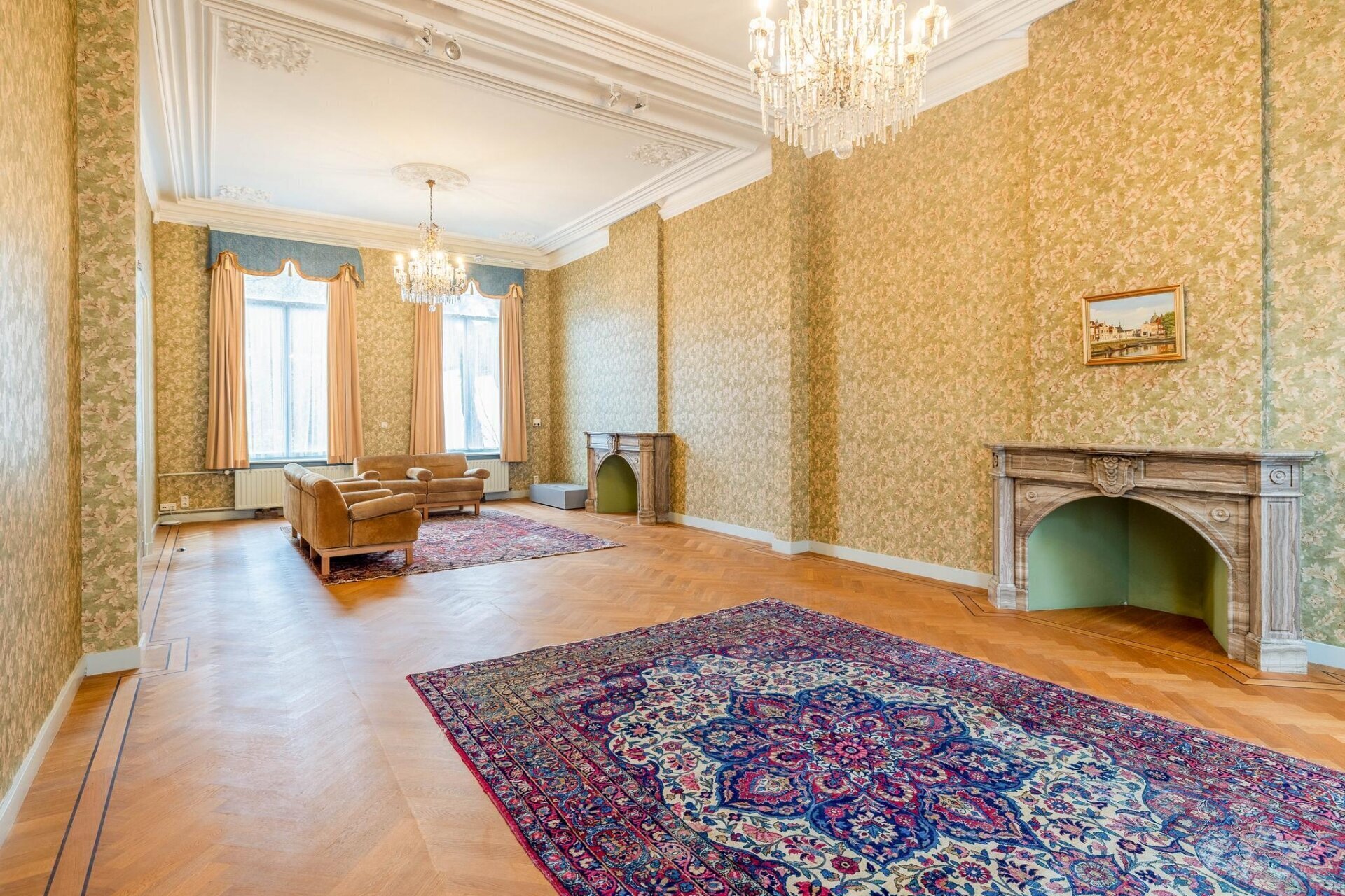 - Woonkamer van 57 m² met sierlijke plafondlijsten, ornamenten en twee marmeren schouwen;