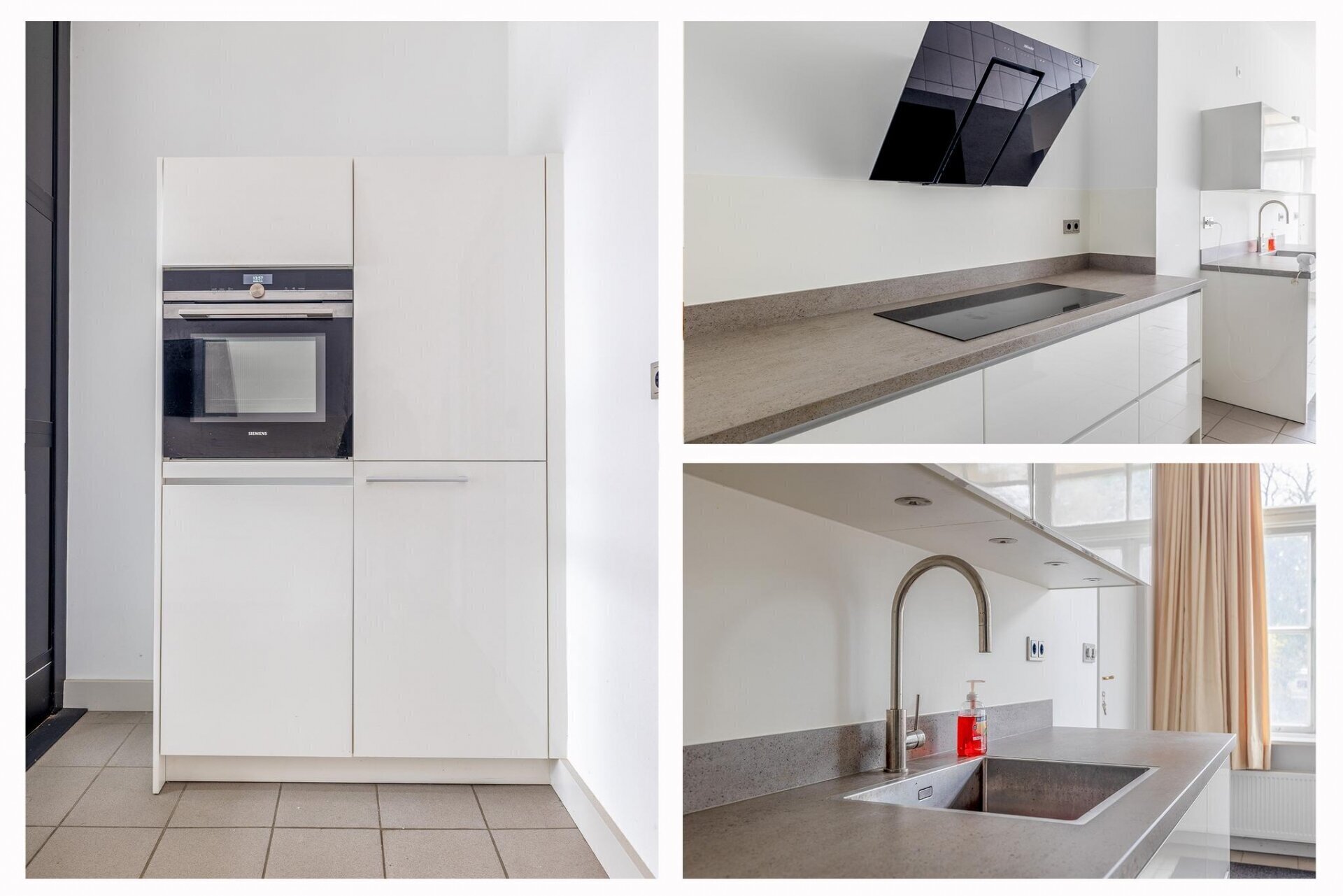 De keuken is gesitueerd in het voormalig koetshuis en is voorzien van een lift die naar de eerste verdieping leidt, een uniek en praktisch element in deze historische woning. Verder is de Goossens keuken van alle gemakken voorzien zoals inbouwapparatuur van het merk Miele en Siemens, waaronder een inductiekookplaat, vaatwasser, combimagnetron en koel-vriescombinatie.
