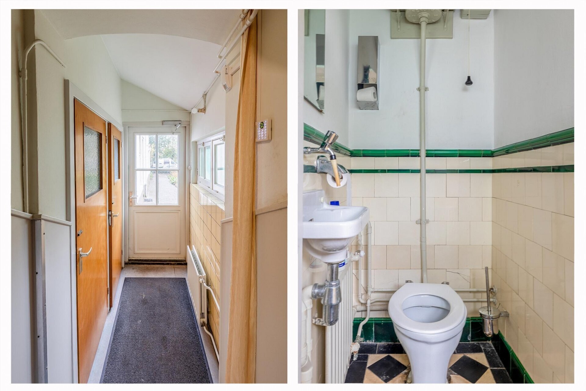 Vanuit de keuken is middels enkele treden van zebranohout toegang tot een tweede entree van het voormalig koetshuis aan de voorzijde waar tevens de meterkast is gesitueerd. Aan de voorzijde van het koetshuis is een berging gesitueerd. De voormalige deuren van het koetshuis zijn van binnenuit dichtgezet maar kunnen weer naar origineel hersteld worden. Aan de achterzijde van de keuken geeft een tussenhal toegang tot de achtertuin, een toiletruimte, vaste kast, bijkeuken alsmede een tweede trap naar de eerste verdieping. De bijkeuken aan de achterzijde van het koetshuis is middels een overloop met wastafel verbonden met de berging aan de voorzijde van het koetshuis.
