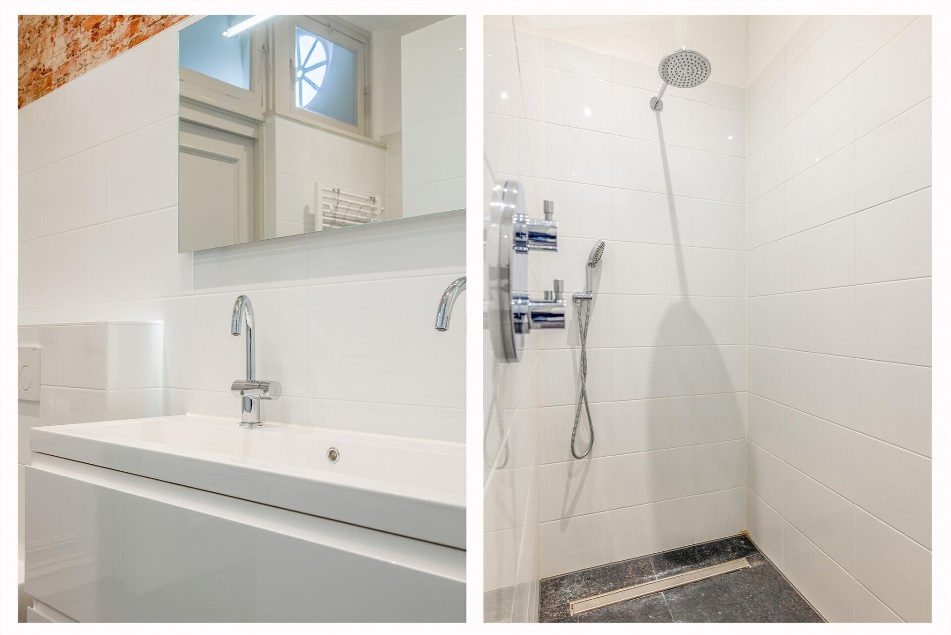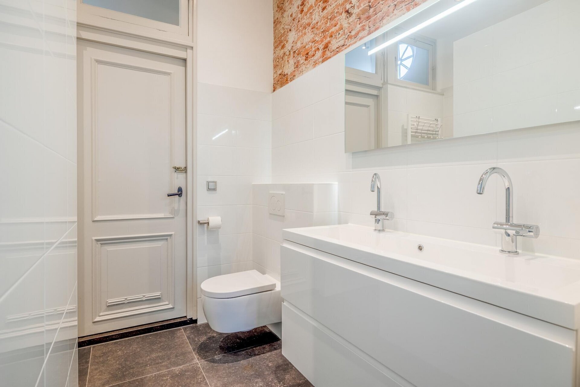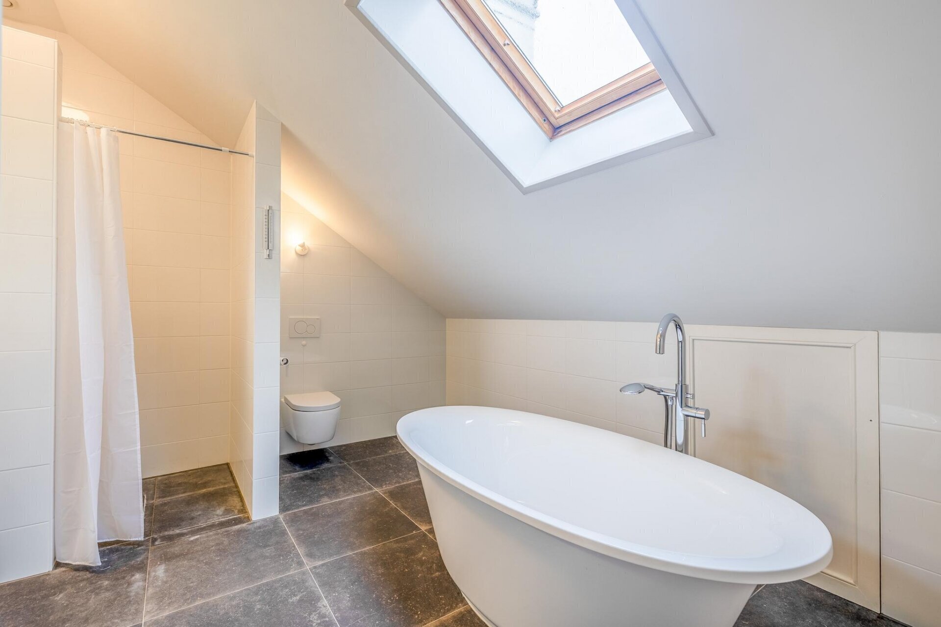 De tweede badkamer van de woning is aan de voorzijde van het koetshuis gesitueerd en beschikt over een ligbad, inloopdouche, zwevend toilet, handdoekenradiator en dubbele wastafelmeubel.