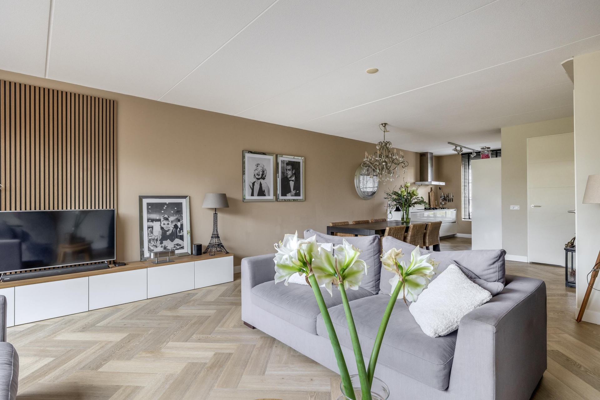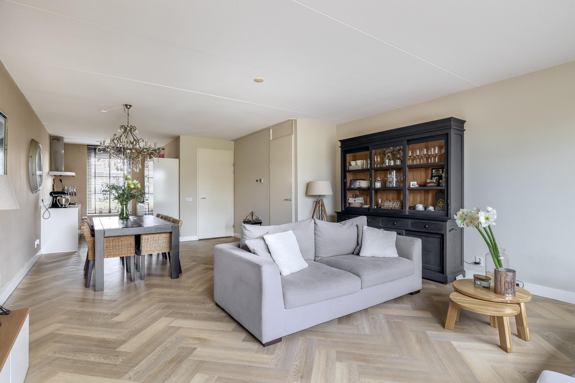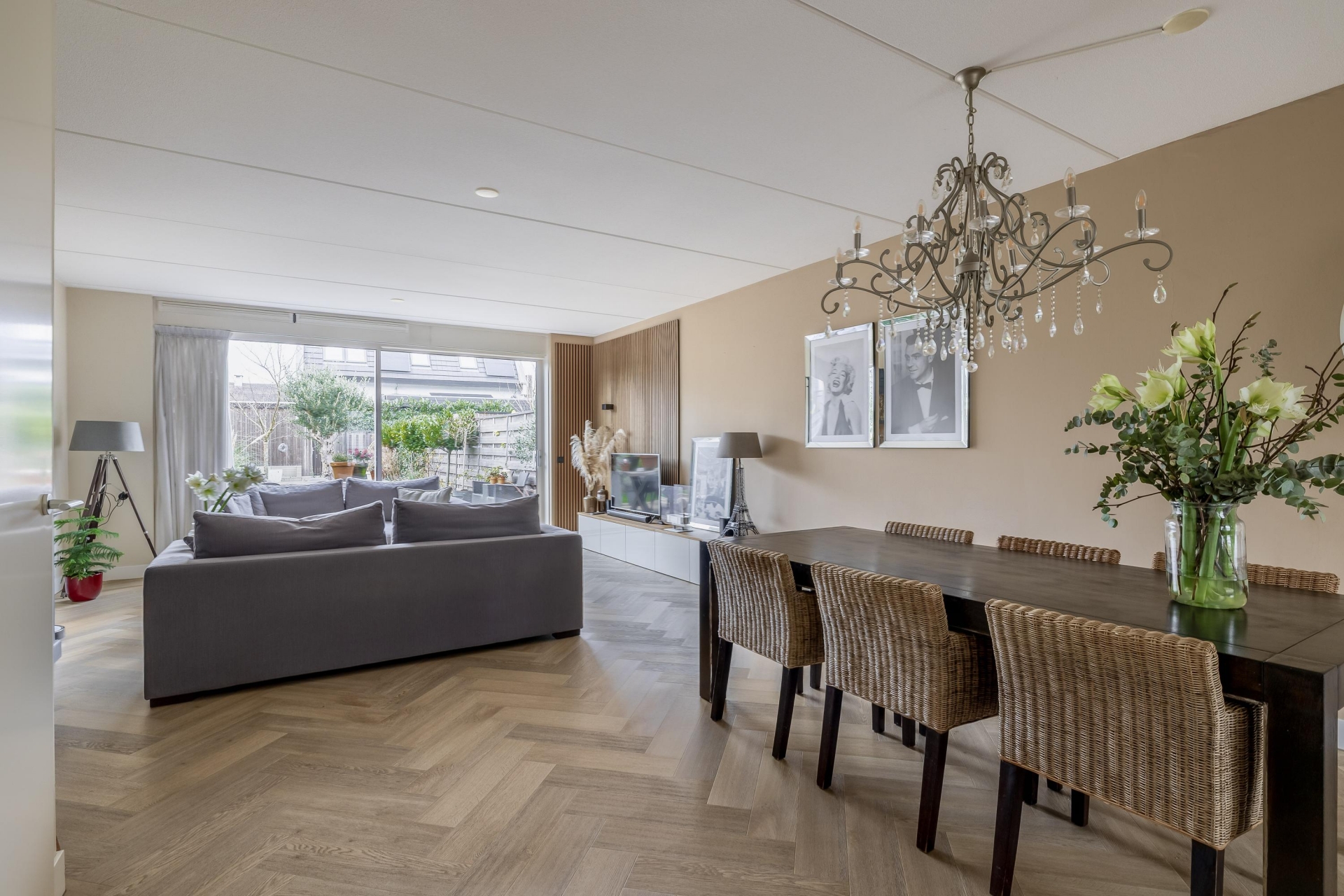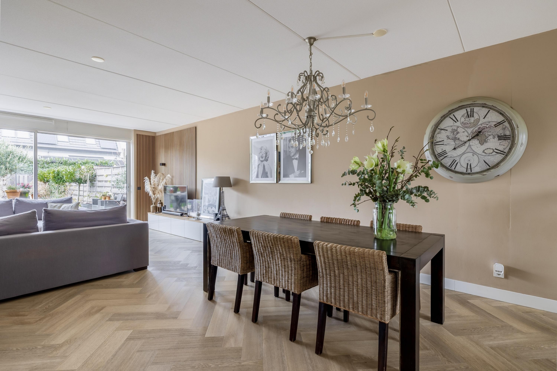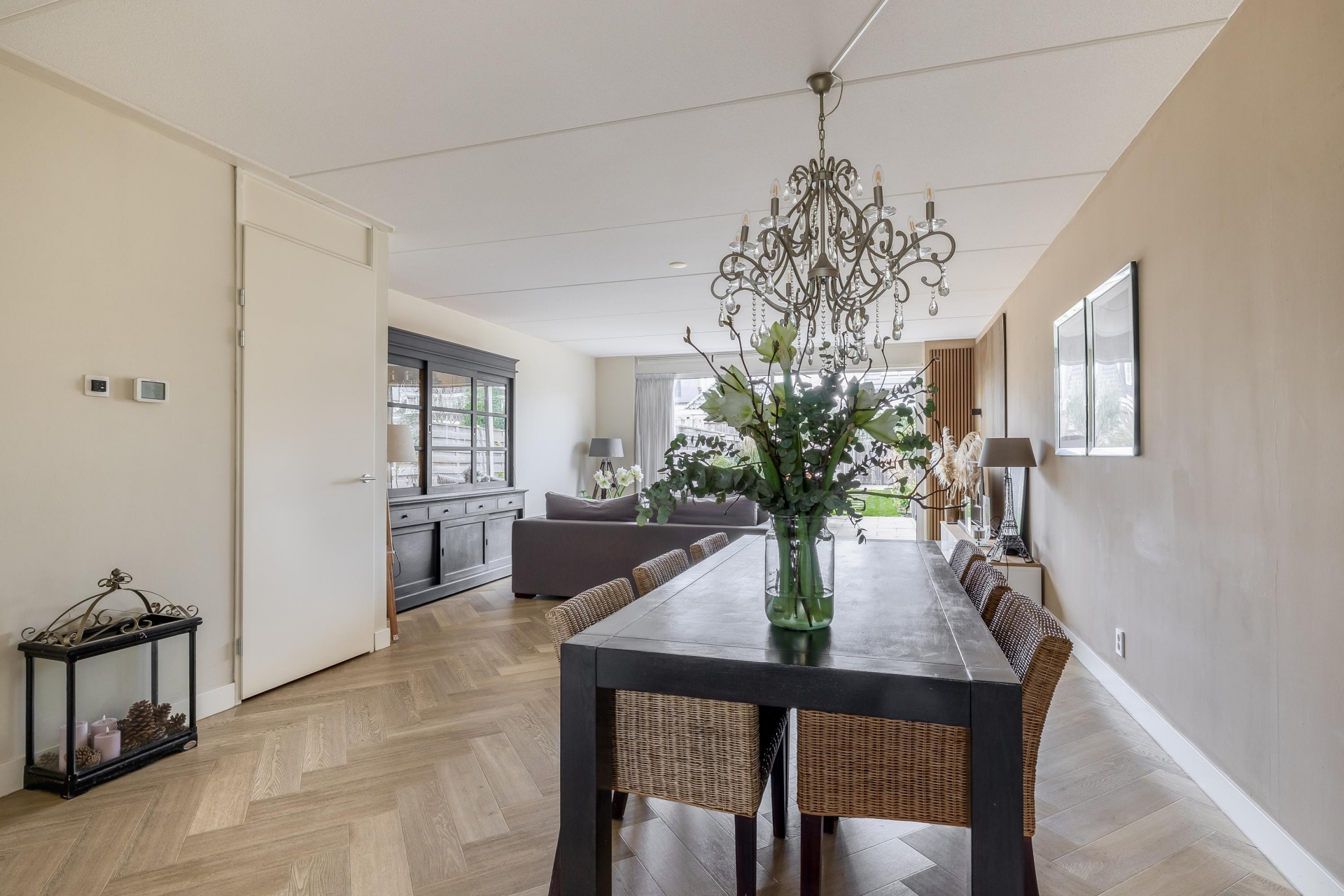 Via de nette voortuin stap je binnen in een sfeervolle en verrassend ruime woonkamer met een warme uitstraling. Dankzij de grote schuifpui aan de achterzijde valt het daglicht mooi naar binnen en heb je vrij zicht op het groen van de diepe achtertuin. De houtlook visgraat PVC vloer en de strakke wandafwerking geven de ruimte een luxe gevoel, terwijl de indeling praktisch en uitnodigend is. De woonkamer loopt naadloos over in het eetgedeelte, waar ruimte is voor een grote eettafel – perfect voor gezellige avonden met vrienden of familie.