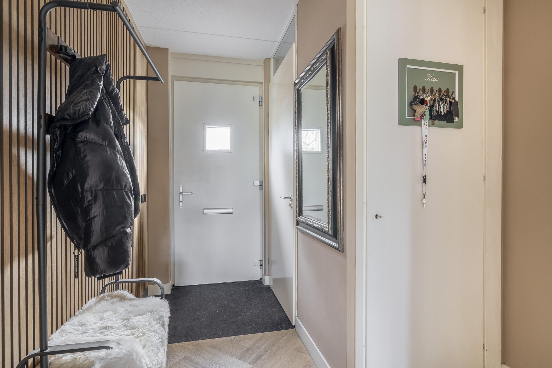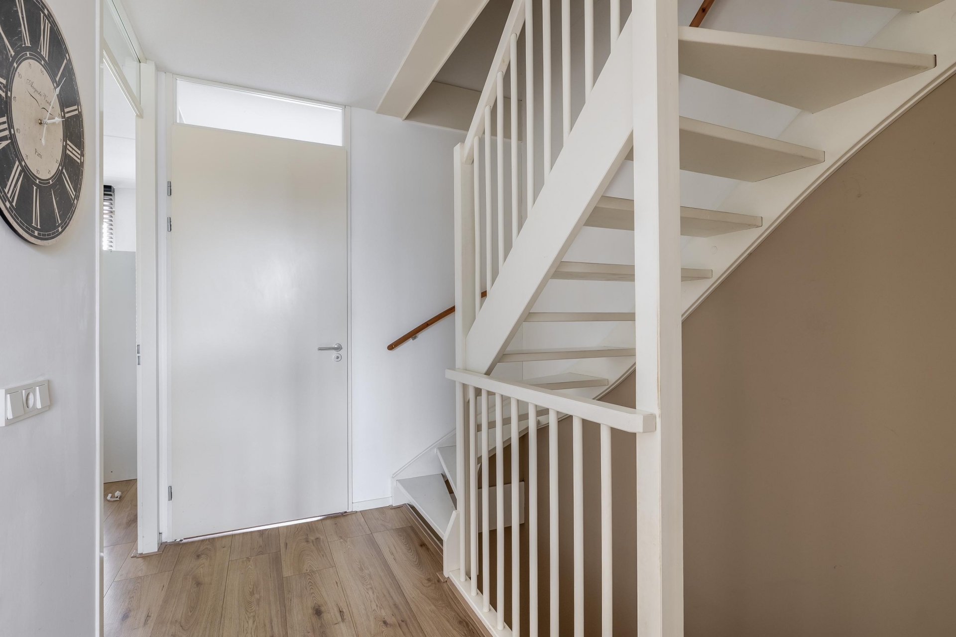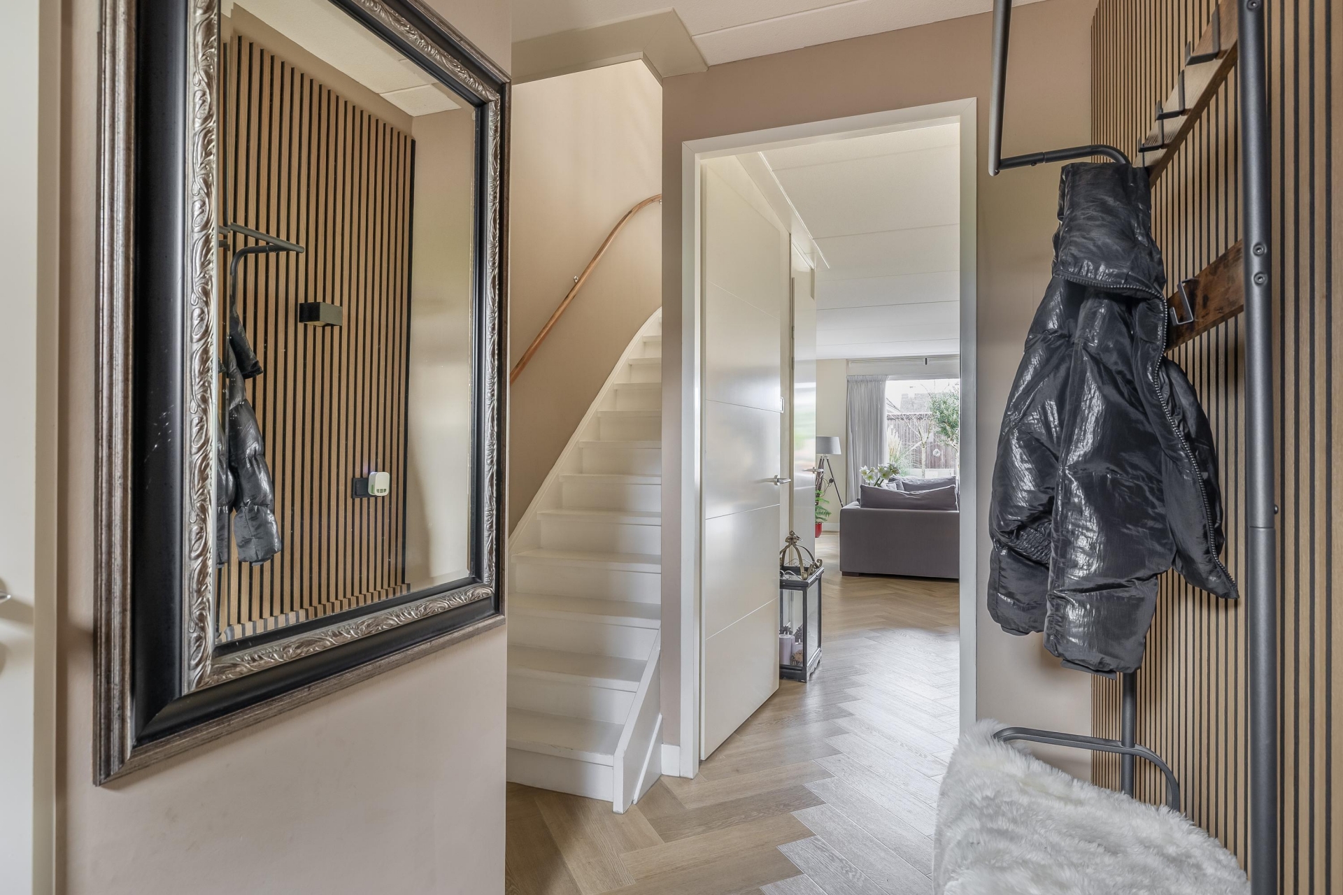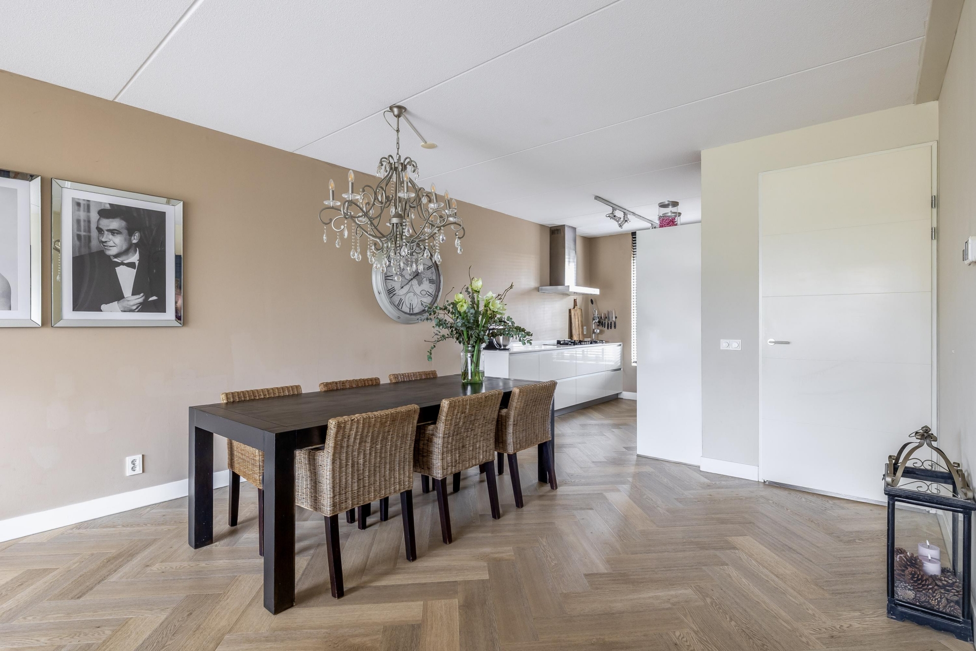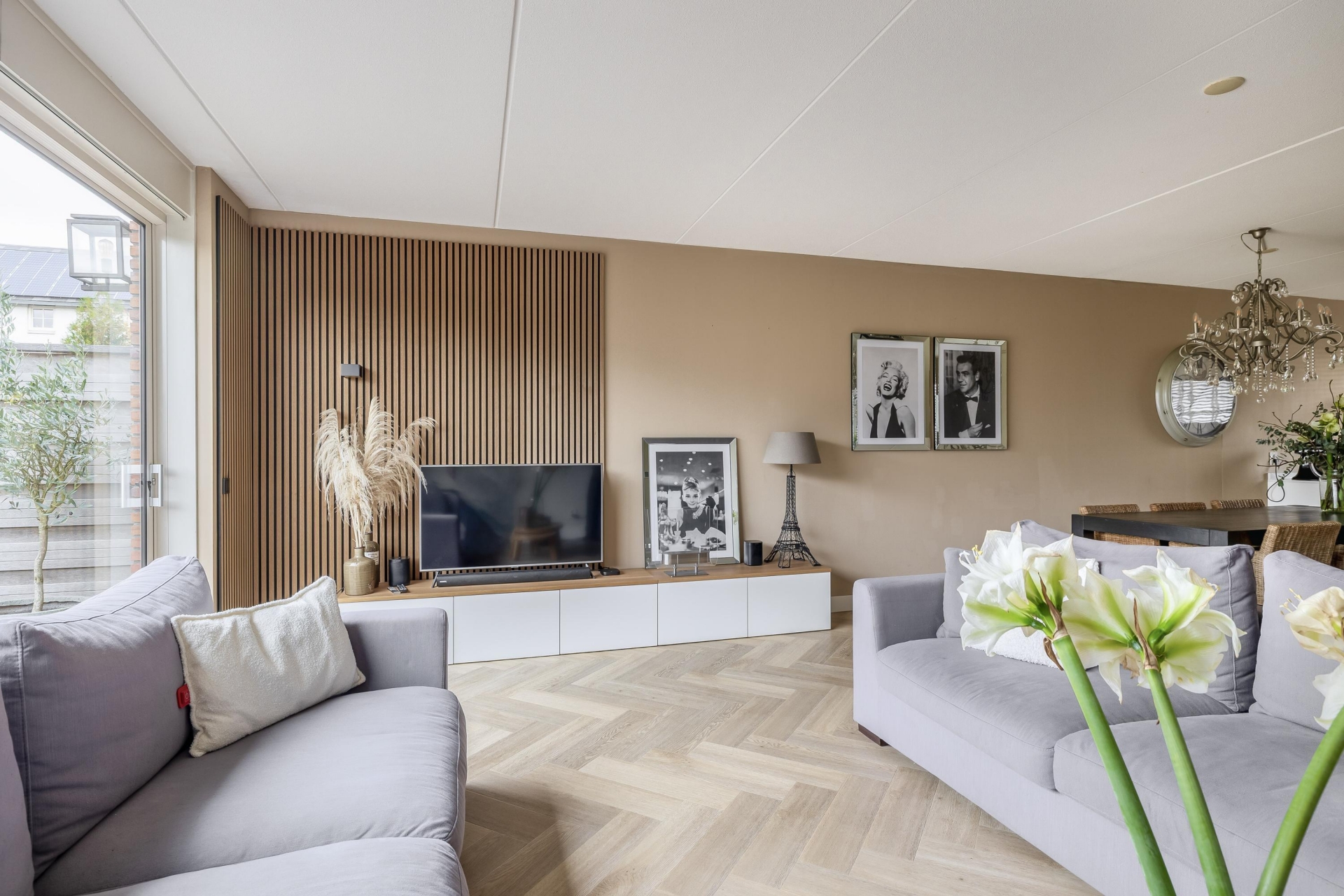 Via de nette voortuin stap je binnen in een sfeervolle en verrassend ruime woonkamer met een warme uitstraling. Dankzij de grote schuifpui aan de achterzijde valt het daglicht mooi naar binnen en heb je vrij zicht op het groen van de diepe achtertuin. De houtlook visgraat PVC vloer en de strakke wandafwerking geven de ruimte een luxe gevoel, terwijl de indeling praktisch en uitnodigend is. De woonkamer loopt naadloos over in het eetgedeelte, waar ruimte is voor een grote eettafel – perfect voor gezellige avonden met vrienden of familie.