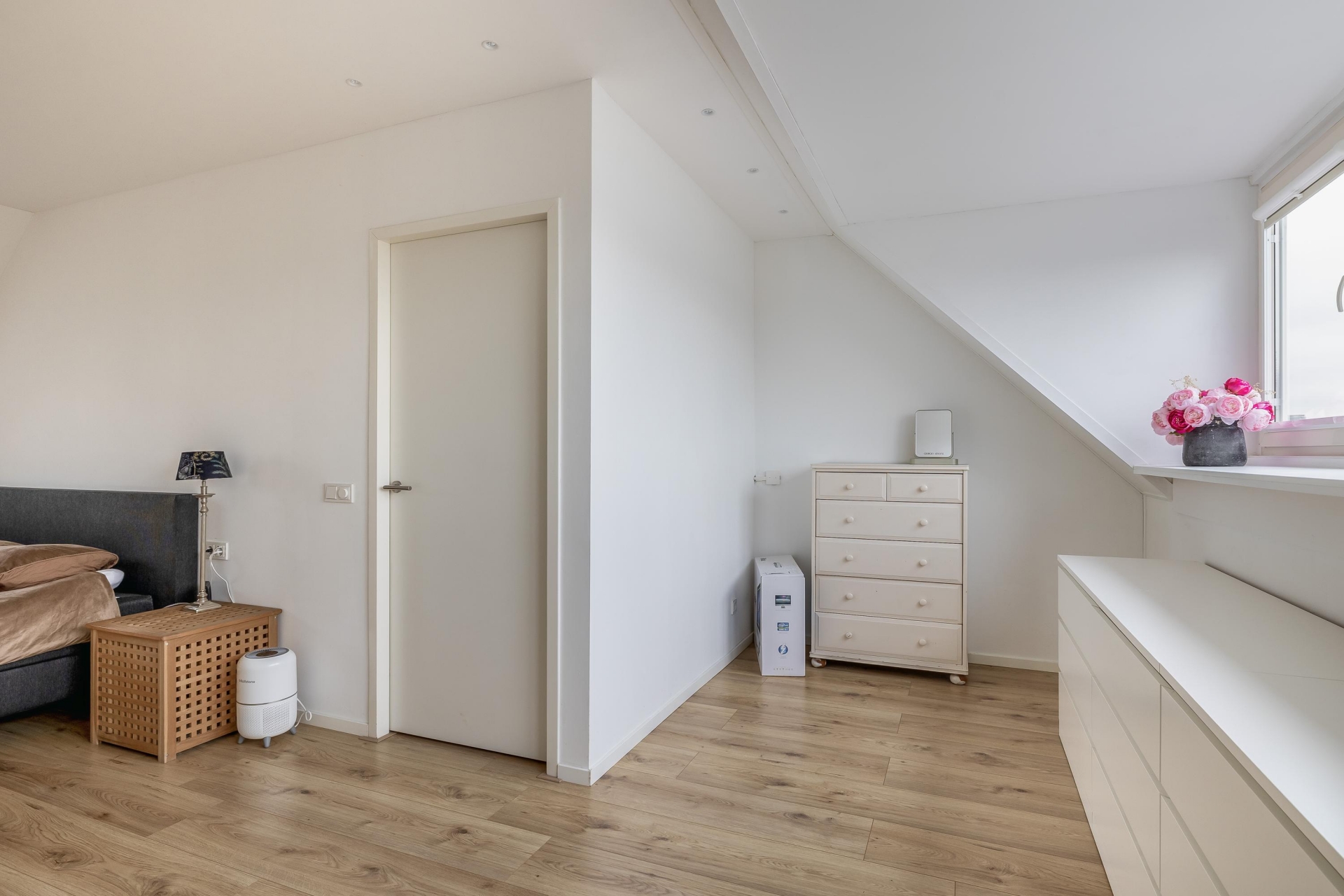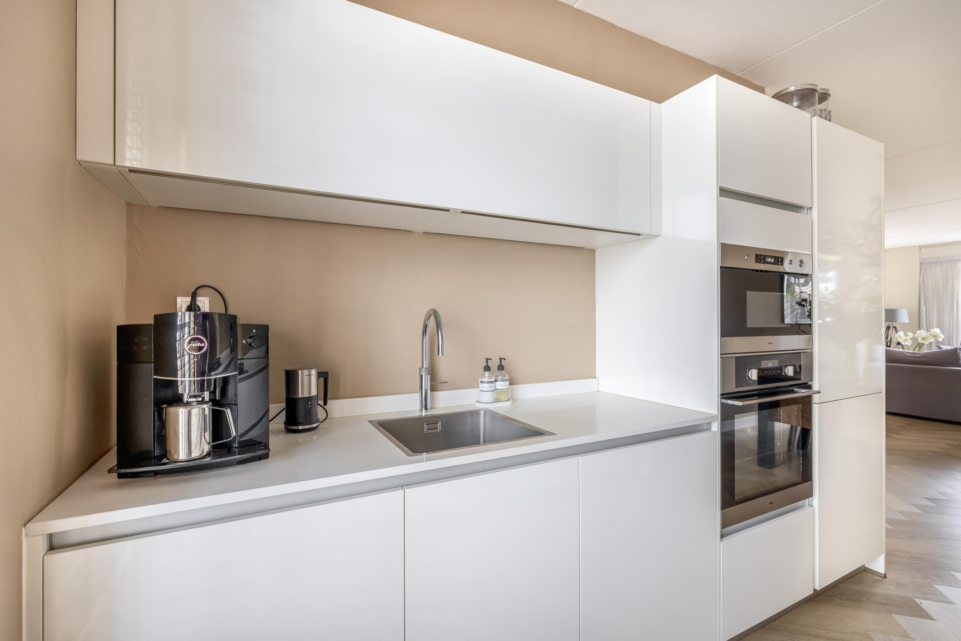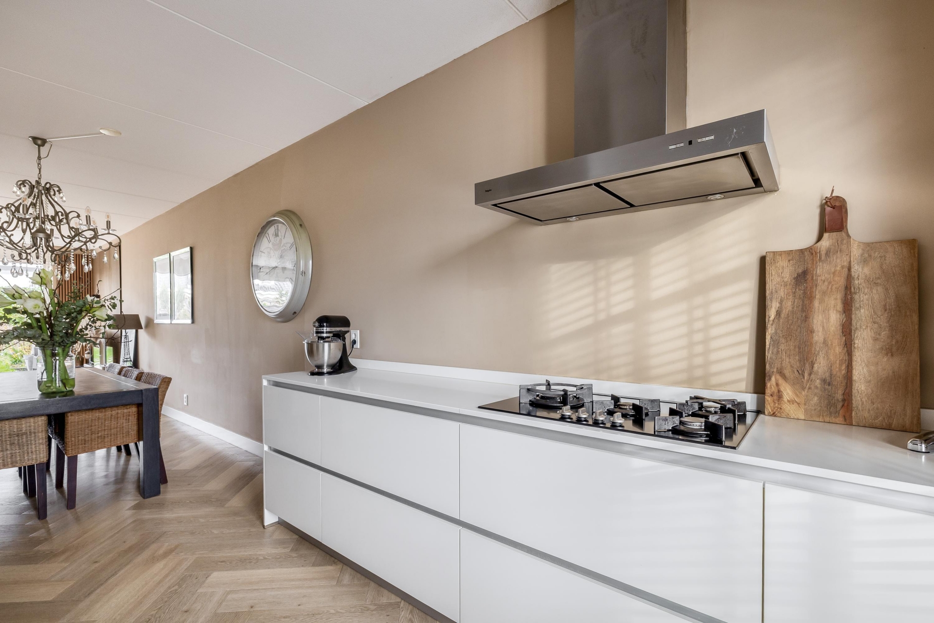 De open keuken aan de voorzijde is een echte blikvanger: strak, wit, greeploos en voorzien van alle benodigde inbouwapparatuur. Je hebt hier alles bij de hand: een oven, magnetron, Quooker, koelkast, vaatwasser, gaskookplaat met afzuigkap en meer dan voldoende kastruimte. Door het open karakter van de keuken blijf je altijd in contact met de rest van het gezin of je gasten.