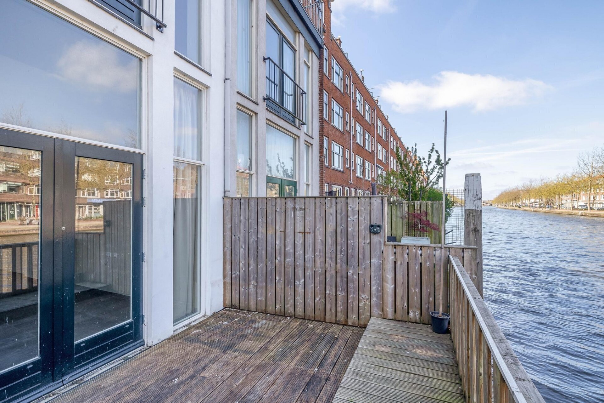 Een van de mooiste plekken van dit huis is het terras aan het water. Gelegen op het oosten, geniet je hier van de ochtendzon en het kabbelende geluid van de langsvarende bootjes. Het is een verlengstuk van de woonkamer en dé plek voor een rustig ontbijt, een goed boek of een avond met vrienden.