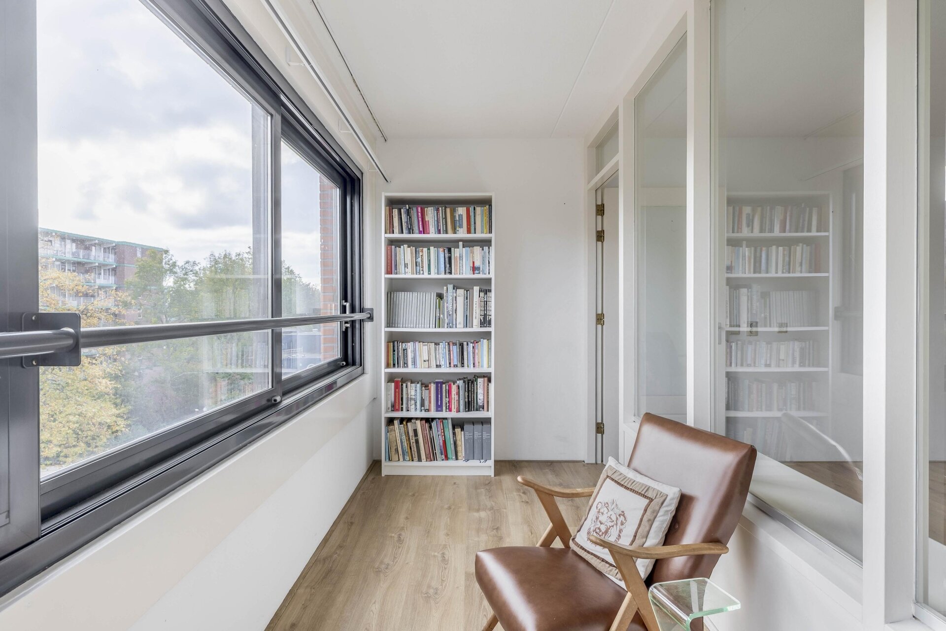 Zodra je binnenkomt, valt de ruime indeling direct op. De woonkamer is royaal opgezet en heeft dankzij de grote raampartijen een fijne lichtinval. De loggia aan de achterzijde, bereikbaar via de woonkamer, is een heerlijk verlengstuk van de leefruimte. Deze is voorzien van grote schuiframen waardoor je ook bij minder weer comfortabel zit, met een prettig vrij uitzicht over de groene omgeving en bebouwing in de verte. De vloer is netjes afgewerkt en de wanden zijn in neutrale kleurstelling gehouden, wat een rustige basis geeft aan de ruimte.