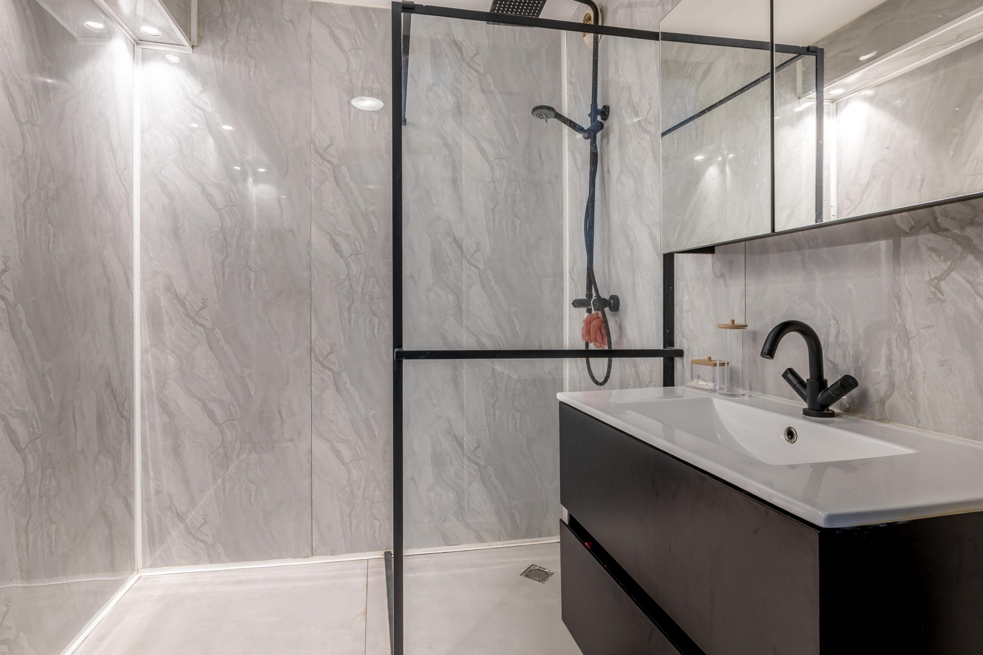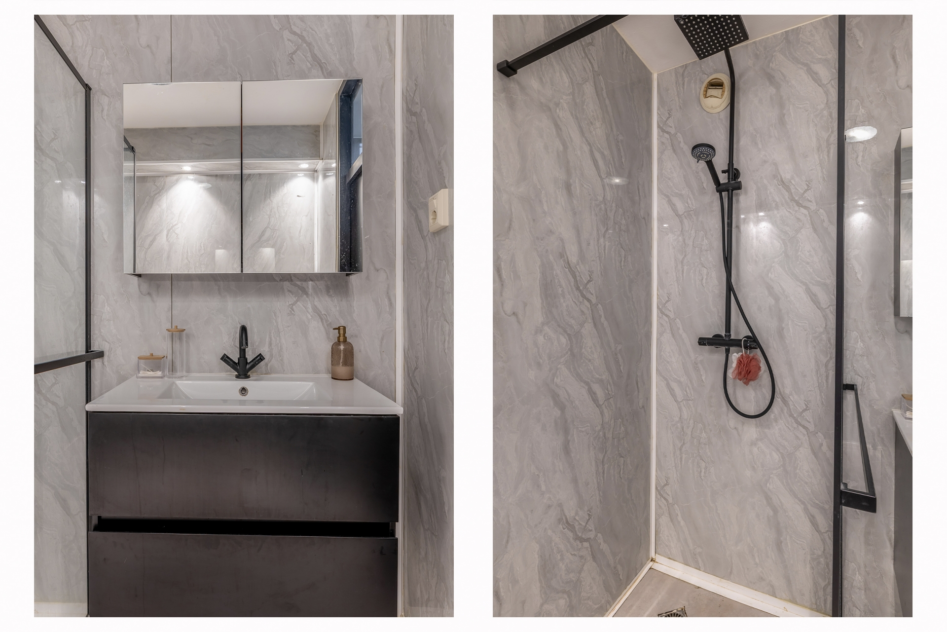 De badkamer is modern en volledig betegeld, voorzien van een douche en wastafelmeubel. Het toilet is apart en uitgerust met een fonteintje.
