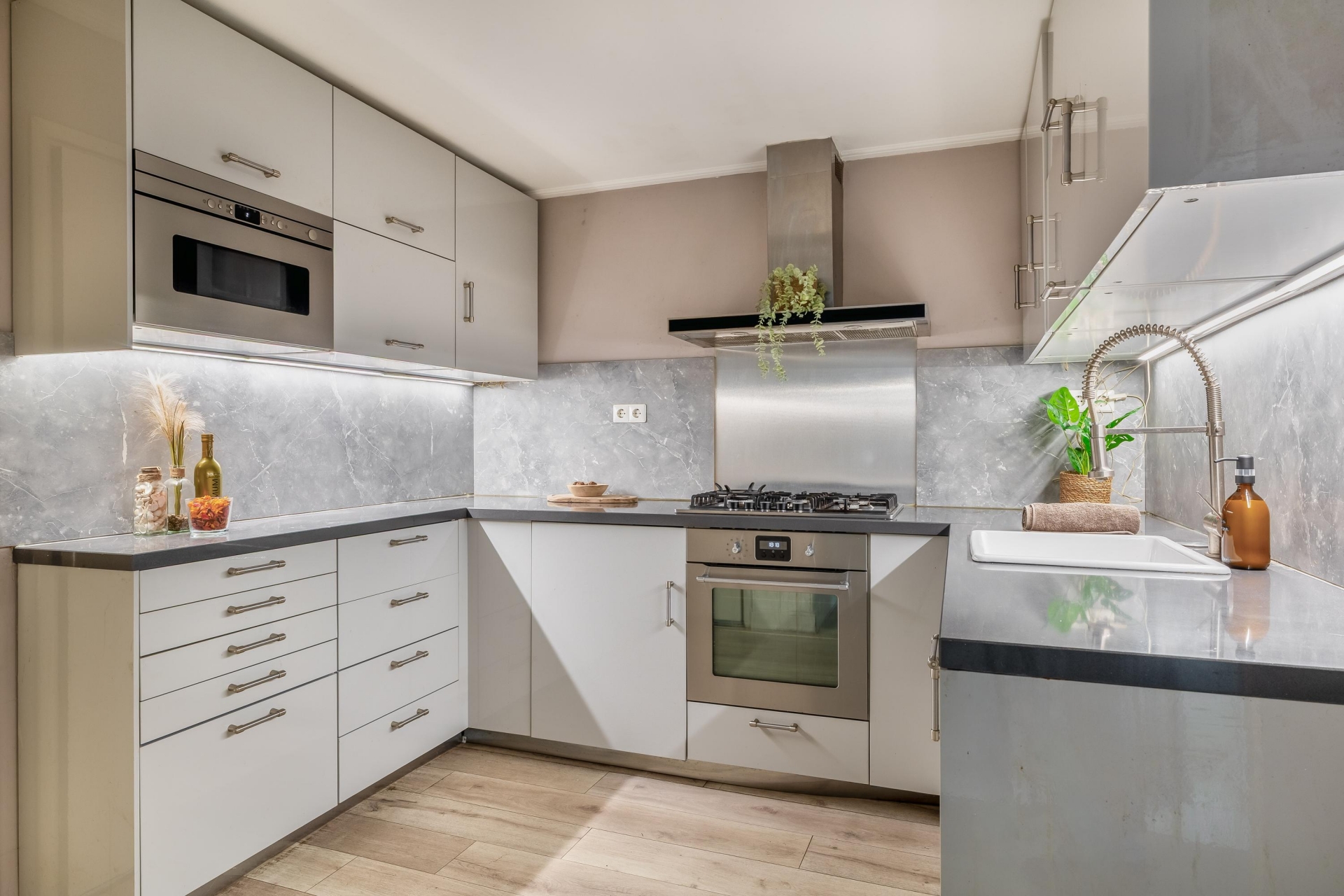 Grenzend aan de eetkamer ligt de moderne keuken in U-opstelling. Hier beschik je over alles wat je nodig hebt: een 5-pits gaskookplaat, oven, magnetron, RVS-afzuigkap en vaatwasser. Dankzij de vele kasten is er volop bergruimte.