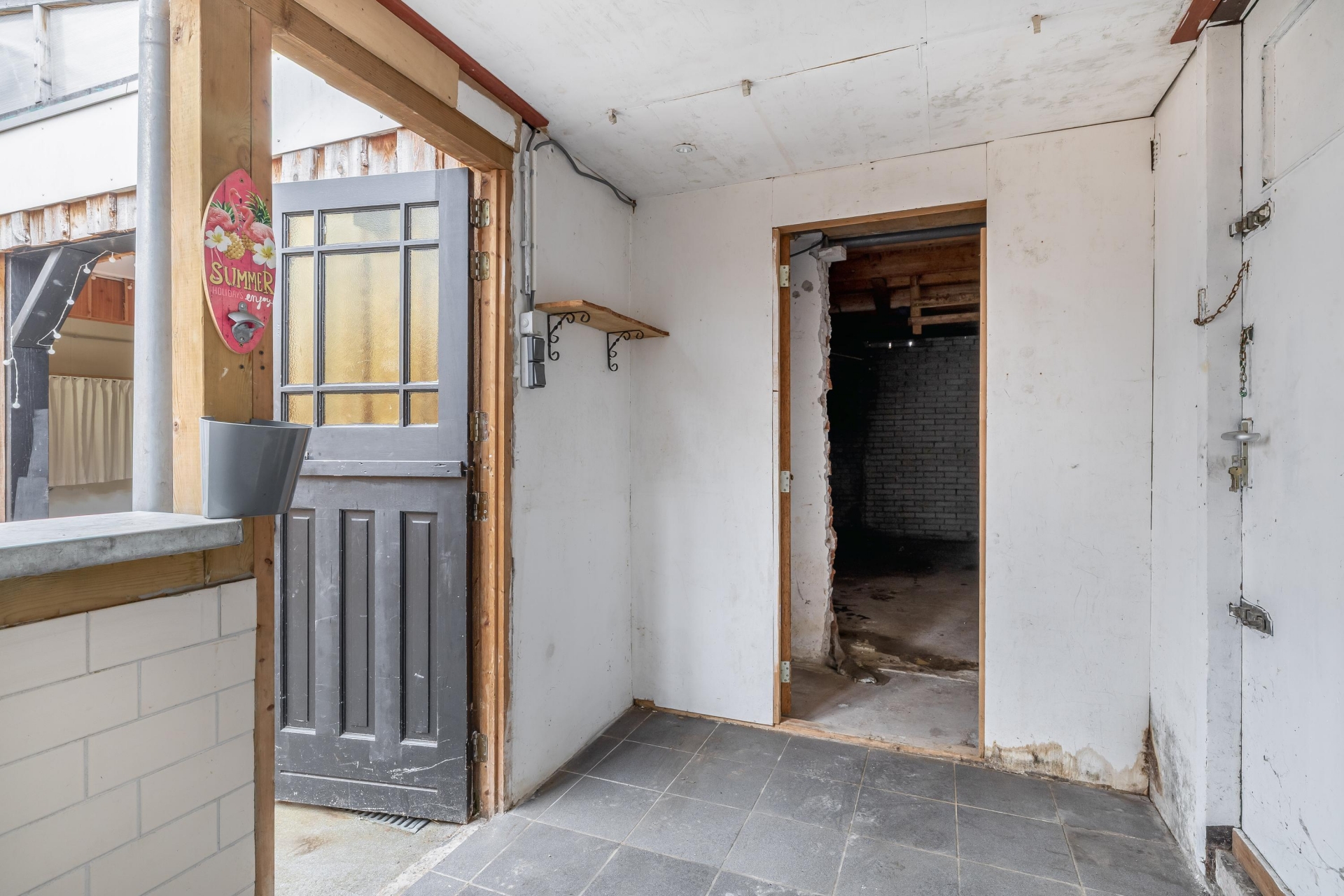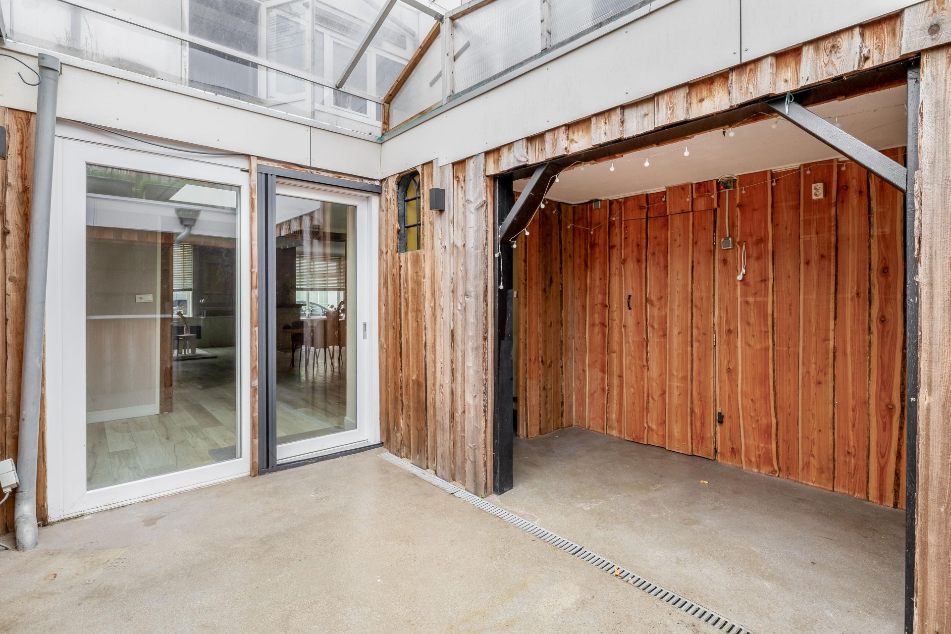 Vanuit de woonkamer stap je de achtertuin/patio in. Deze is voorzien van een overkapping en een gezellige ‘man cave’ met zitruimte, een fijne plek om te ontspannen of met vrienden te borrelen. De brede achterom maakt de tuin ook praktisch bereikbaar.