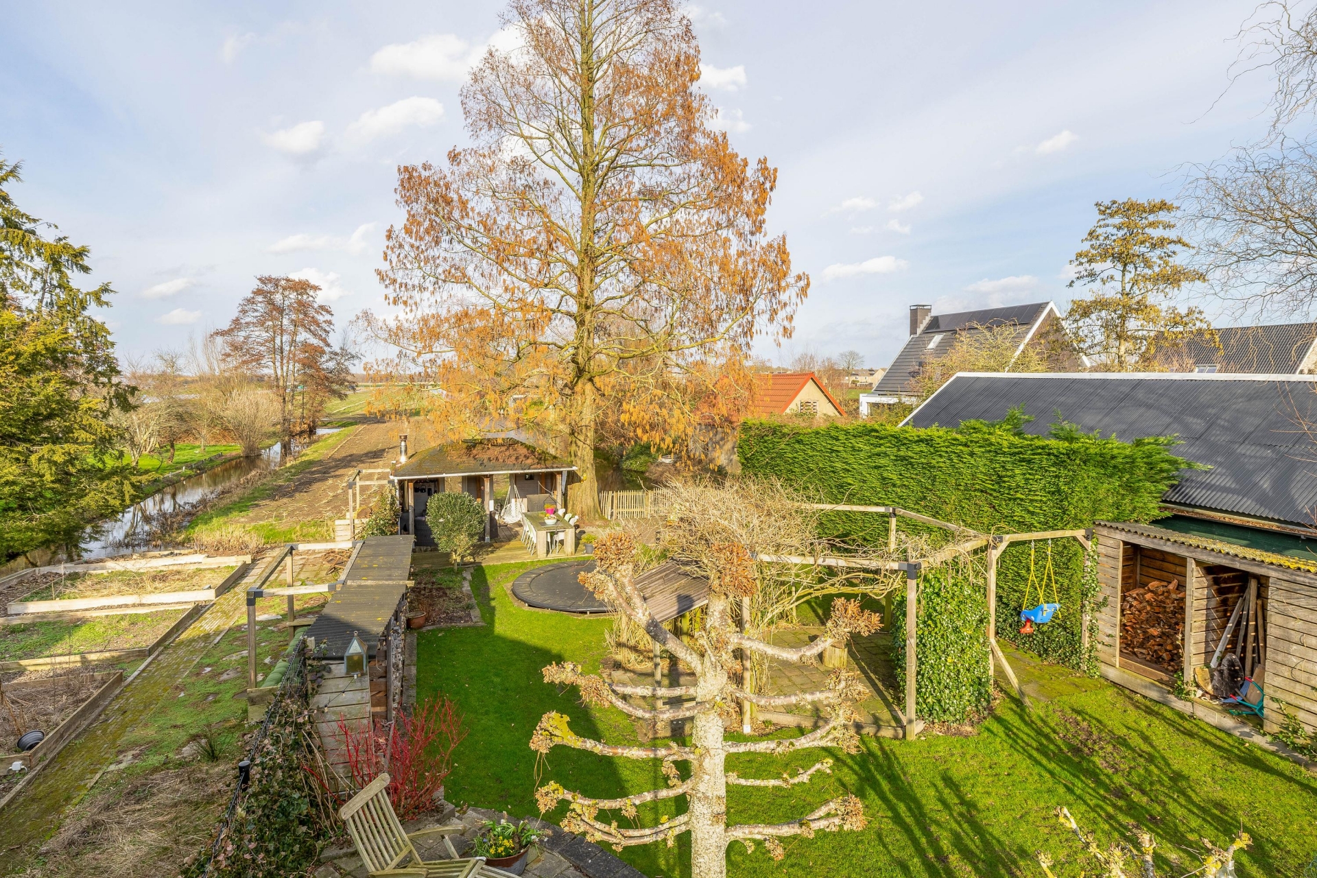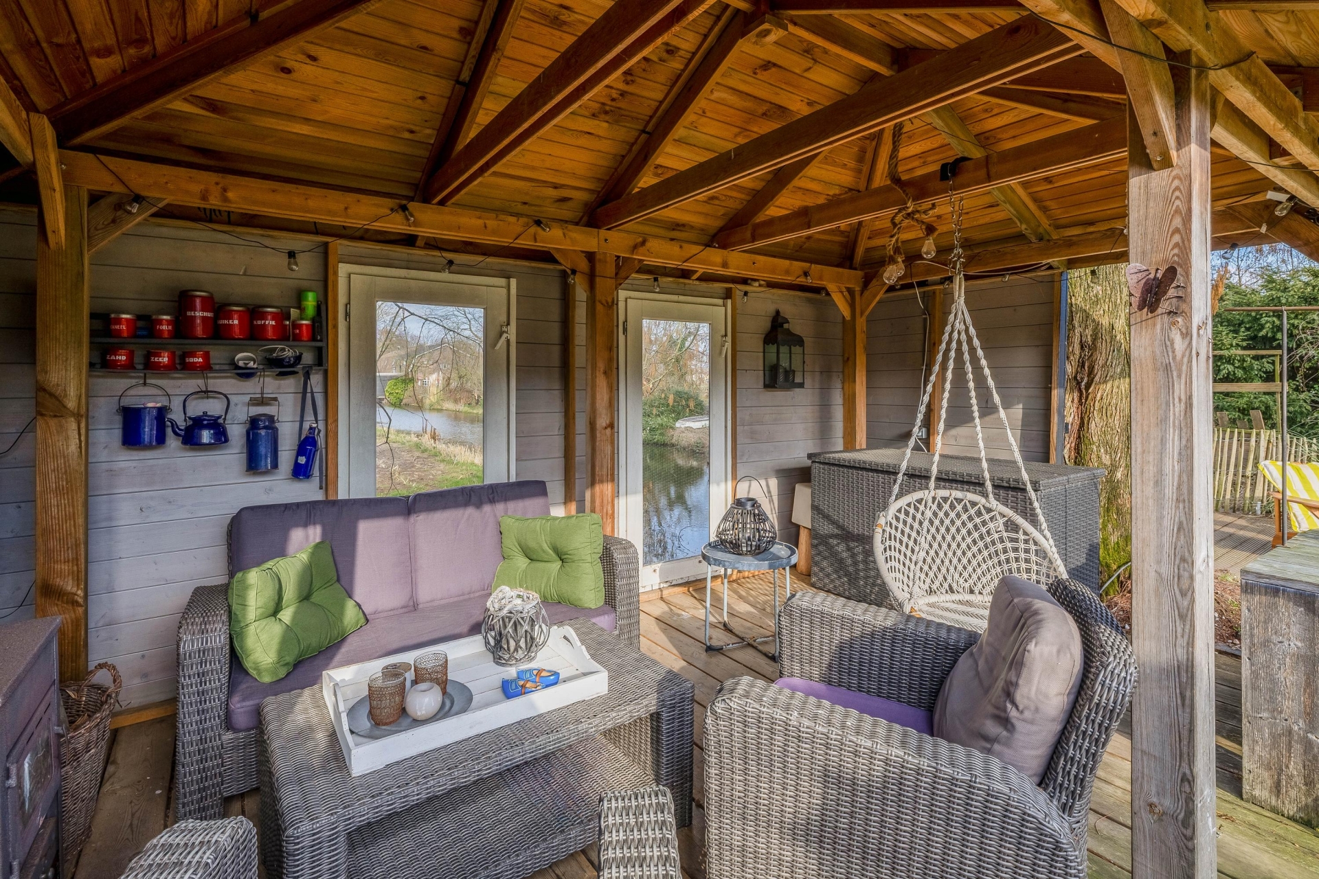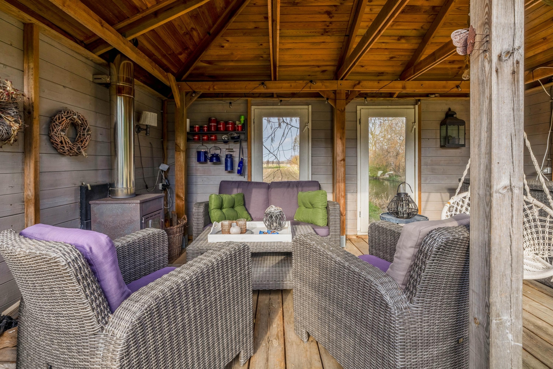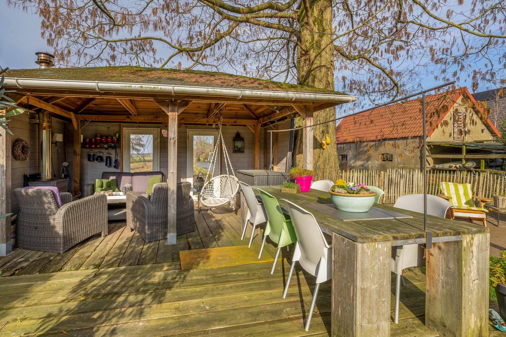 Achter in de tuin staat een sfeervol prieel met houtkachel. Dit is een heerlijke plek waar je tot in de late uurtjes kunt genieten van lange zomeravonden met vrienden en familie. Vanaf hier kijk je uit over de polder en ervaar je de rust en vrijheid van het buitenleven.