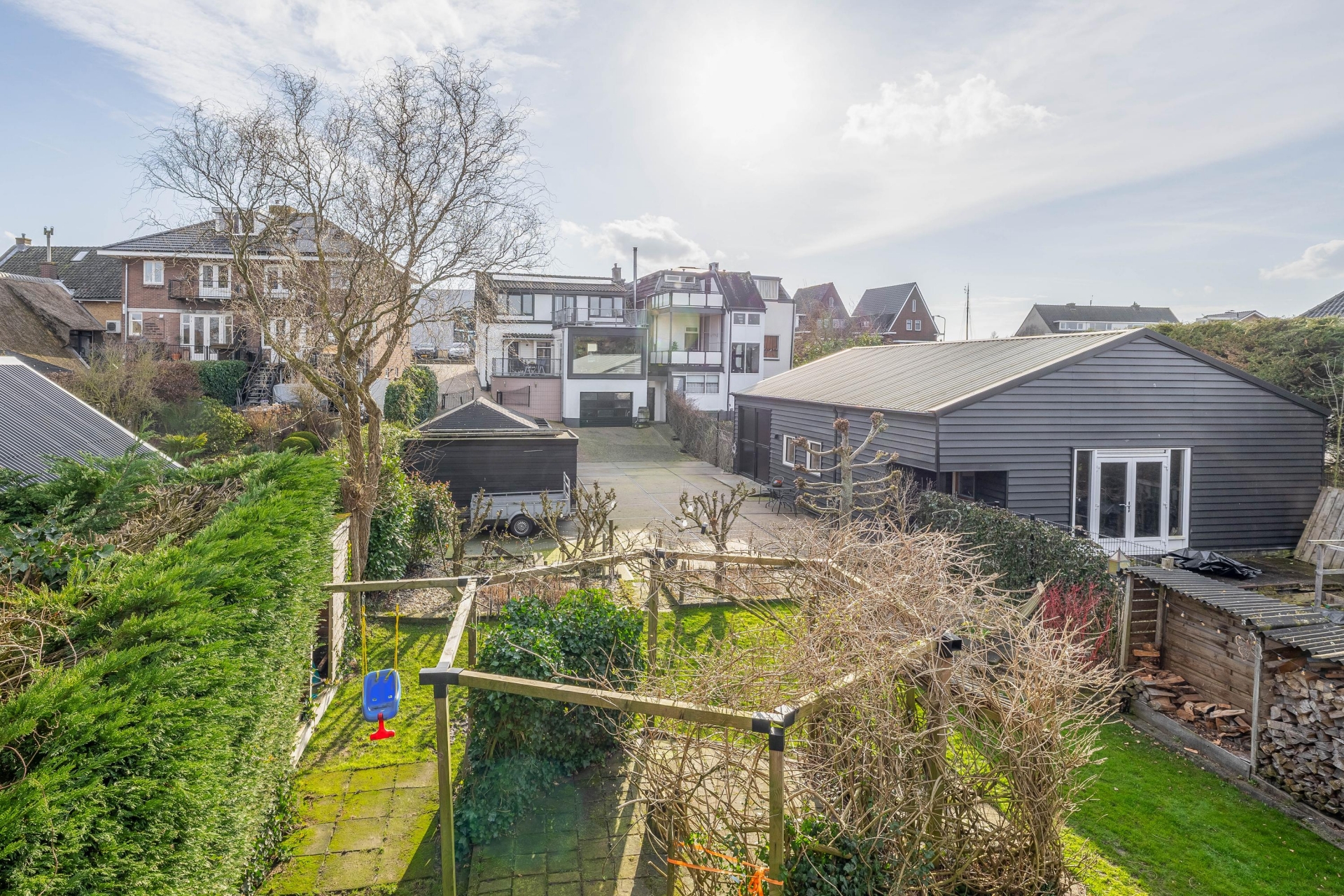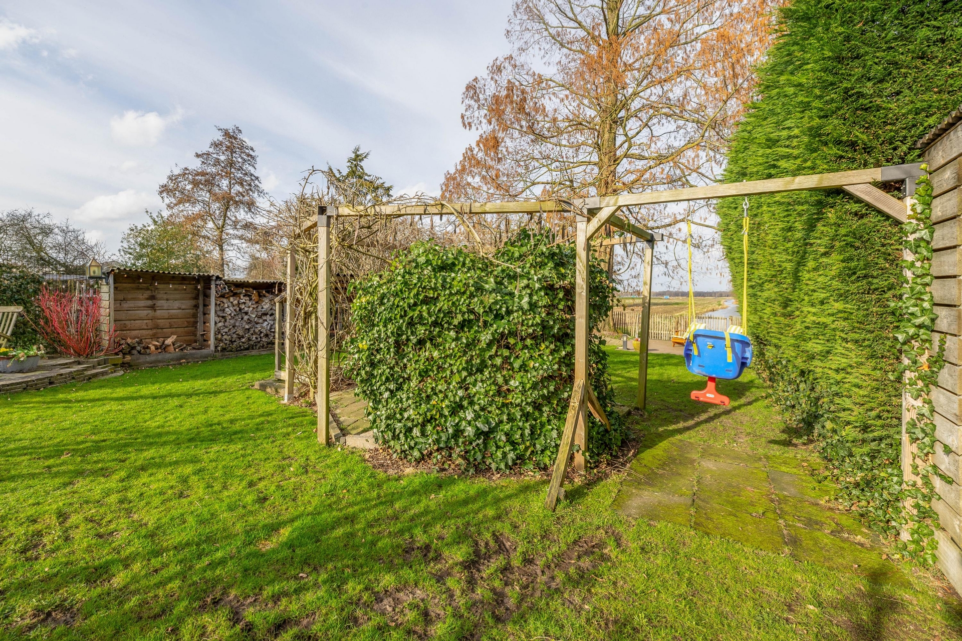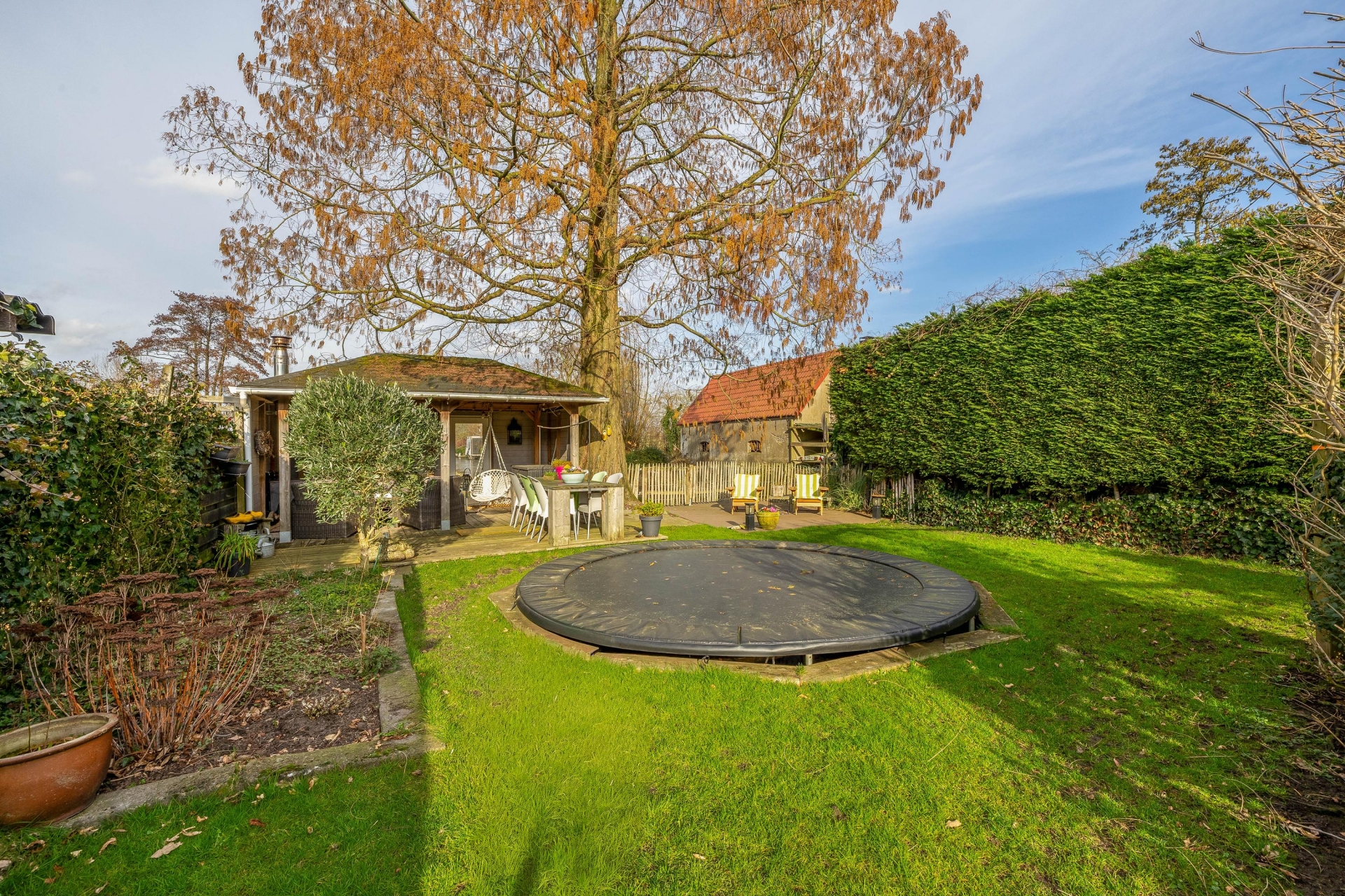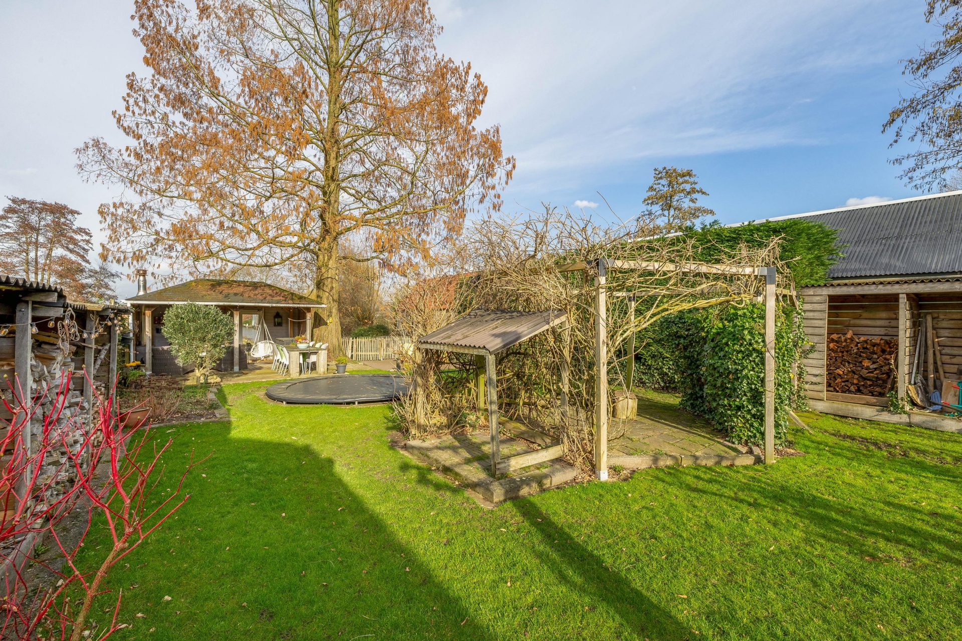 Achter in de tuin staat een sfeervol prieel met houtkachel. Dit is een heerlijke plek waar je tot in de late uurtjes kunt genieten van lange zomeravonden met vrienden en familie. Vanaf hier kijk je uit over de polder en ervaar je de rust en vrijheid van het buitenleven.