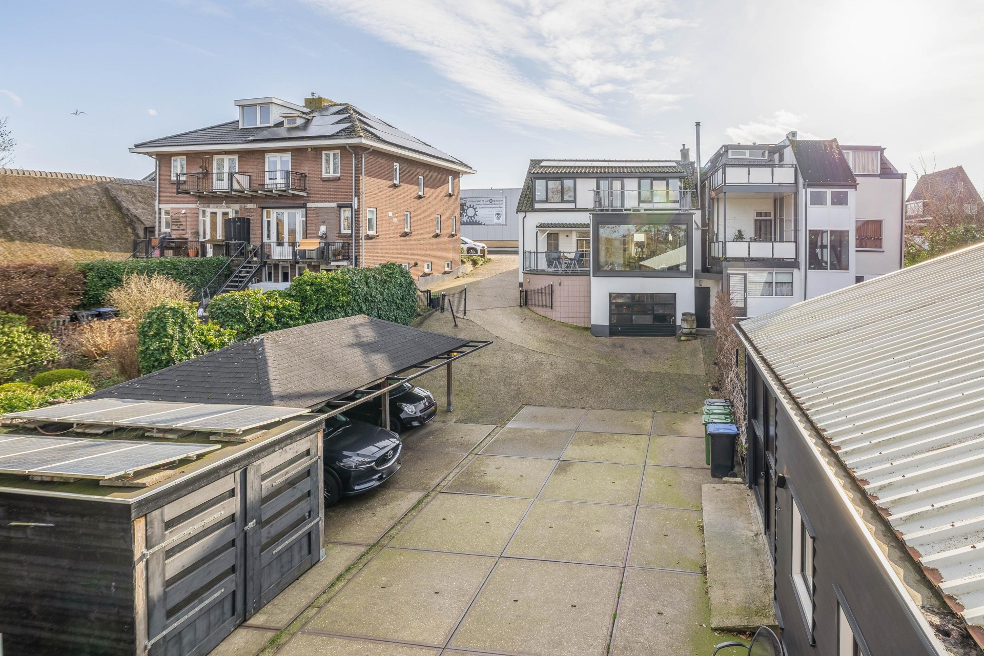 Daarnaast is er op het perceel ook nog een carport aanwezig met ruimte voor twee auto's en een aanpandige garage (met omvormer voor de zonnepanelen op de garage en voorbereiding voor elektrisch laden). De eigen afrit en het ruime erf zorgen ervoor dat parkeren op eigen terrein geen enkel probleem is.