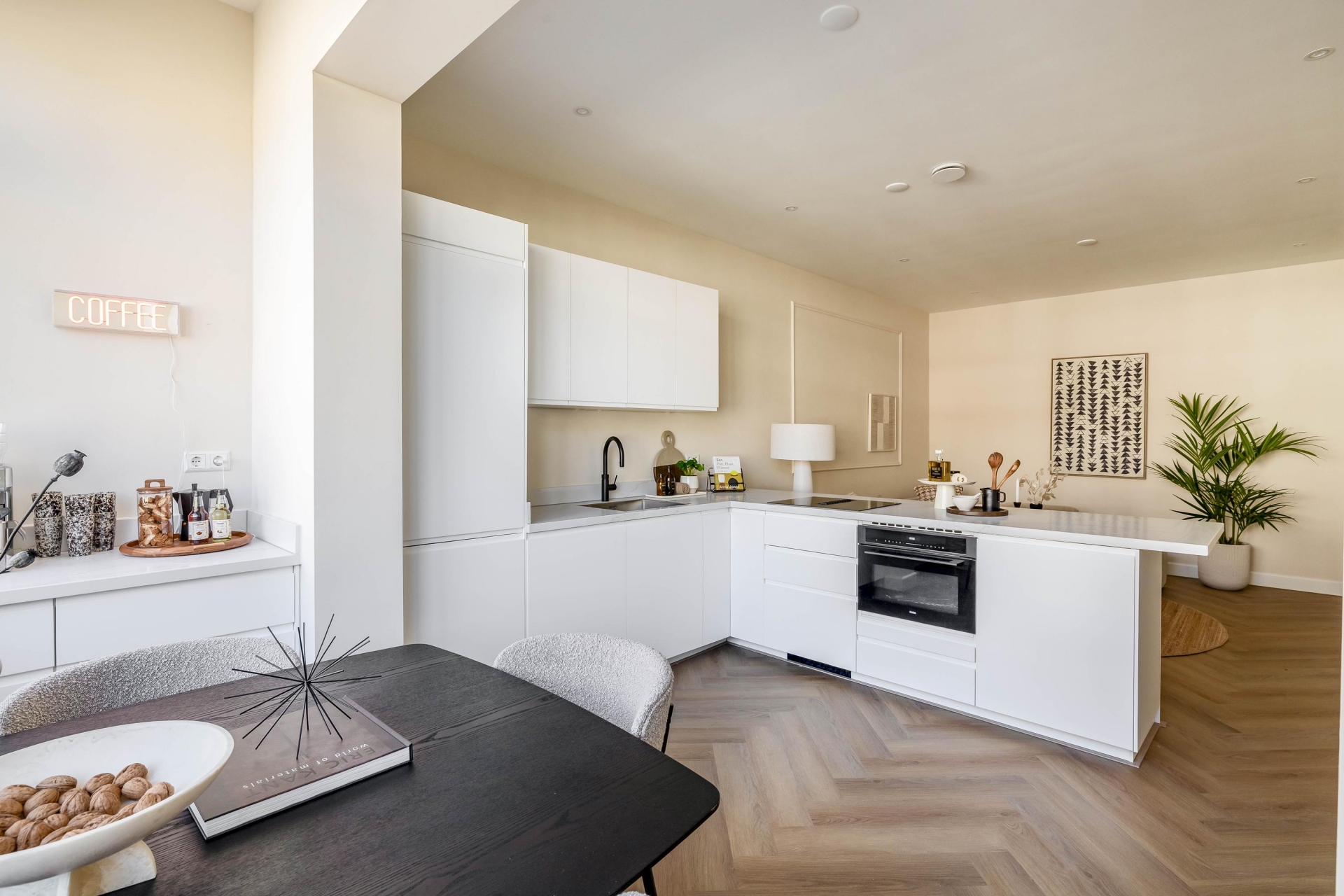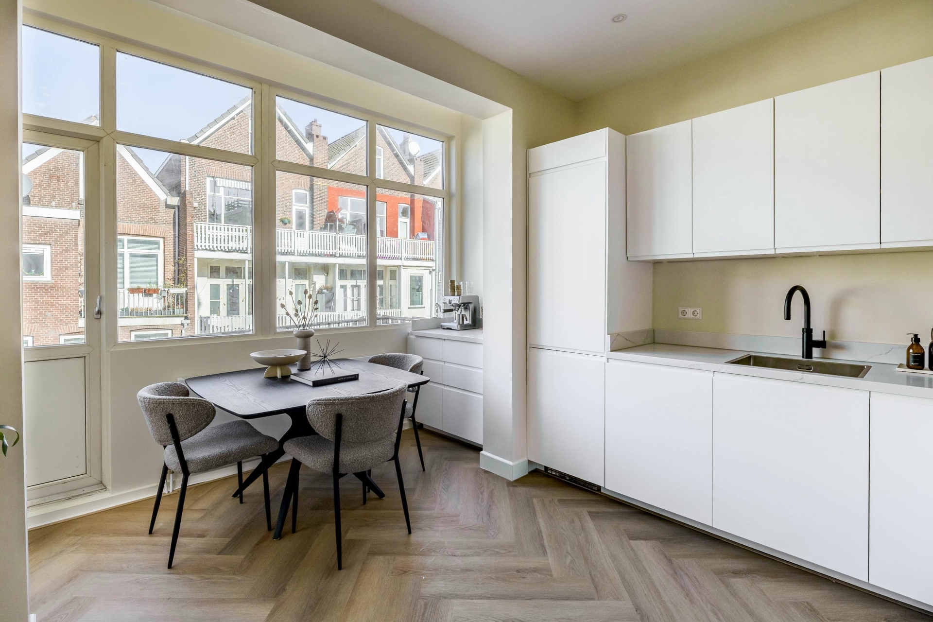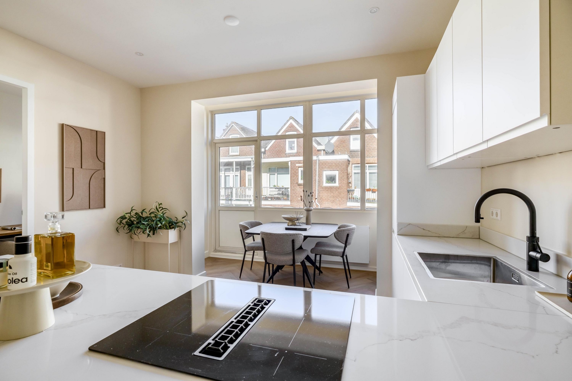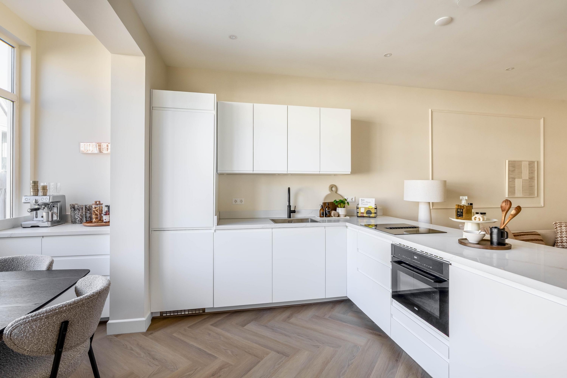 De keuken is voorzien van een Quooker, kookplaat met geïntegreerde afzuiging en hoogwaardige inbouwapparatuur. De strakke belijning en rustige kleurstelling sluiten naadloos aan bij de warme visgraatvloer en het lichte interieur. De directe verbinding met het balkon aan de achterzijde zorgt voor extra lichtinval en een prettige ruimtelijke beleving.