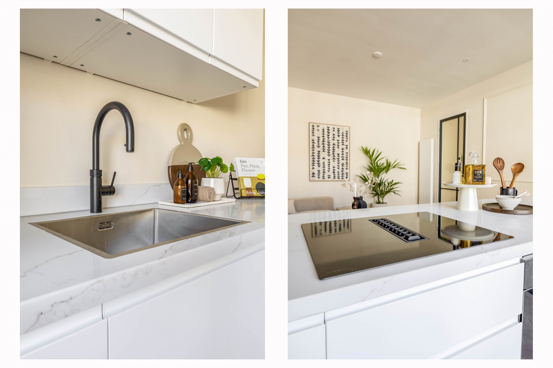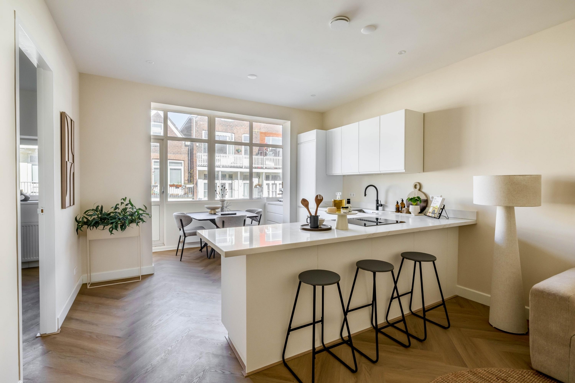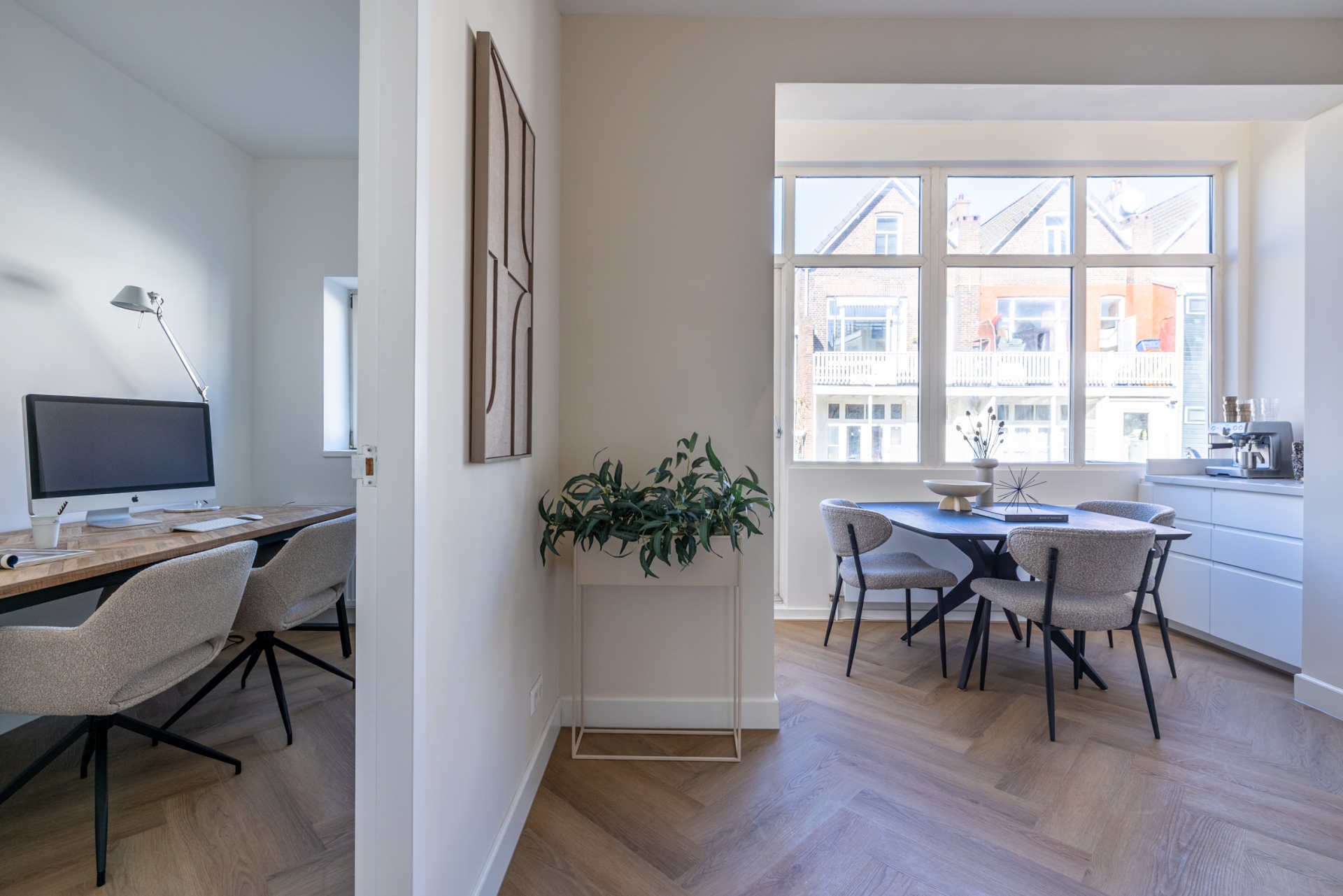 De keuken is voorzien van een Quooker, kookplaat met geïntegreerde afzuiging en hoogwaardige inbouwapparatuur. De strakke belijning en rustige kleurstelling sluiten naadloos aan bij de warme visgraatvloer en het lichte interieur. De directe verbinding met het balkon aan de achterzijde zorgt voor extra lichtinval en een prettige ruimtelijke beleving.
