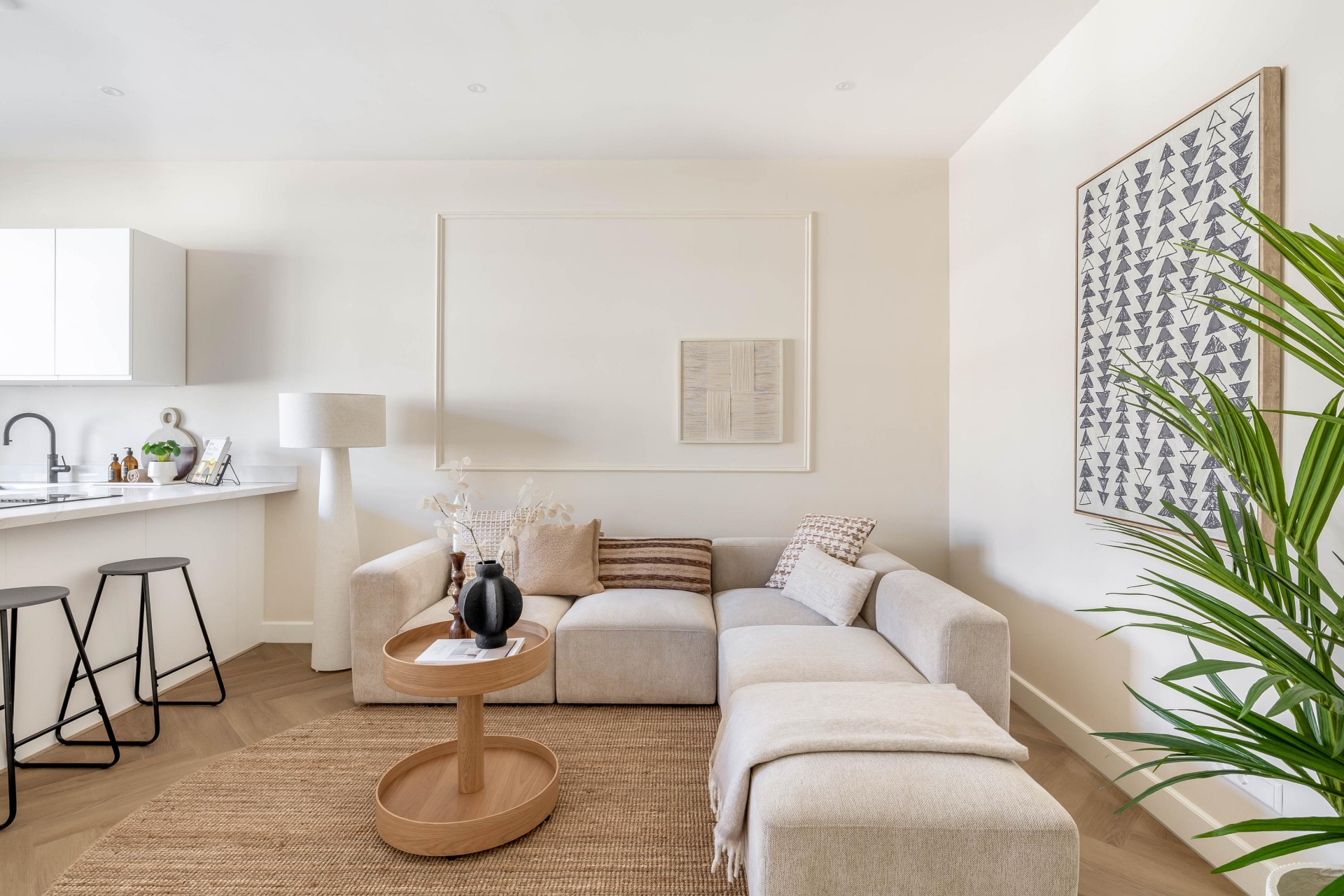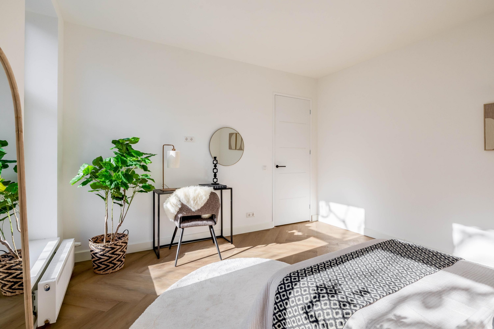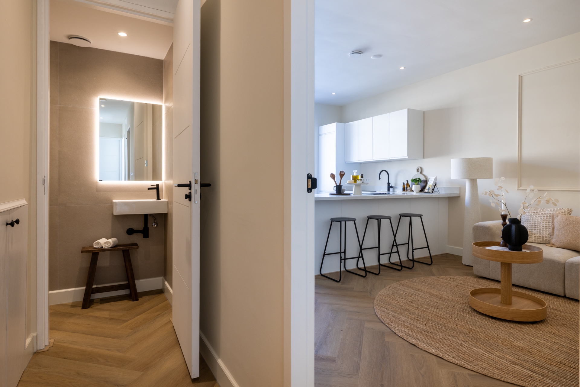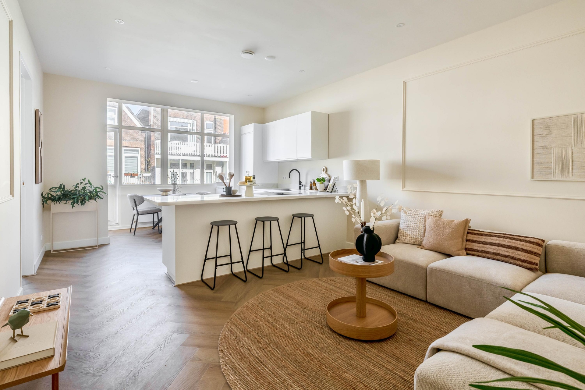 De keuken is voorzien van een Quooker, kookplaat met geïntegreerde afzuiging en hoogwaardige inbouwapparatuur. De strakke belijning en rustige kleurstelling sluiten naadloos aan bij de warme visgraatvloer en het lichte interieur. De directe verbinding met het balkon aan de achterzijde zorgt voor extra lichtinval en een prettige ruimtelijke beleving.