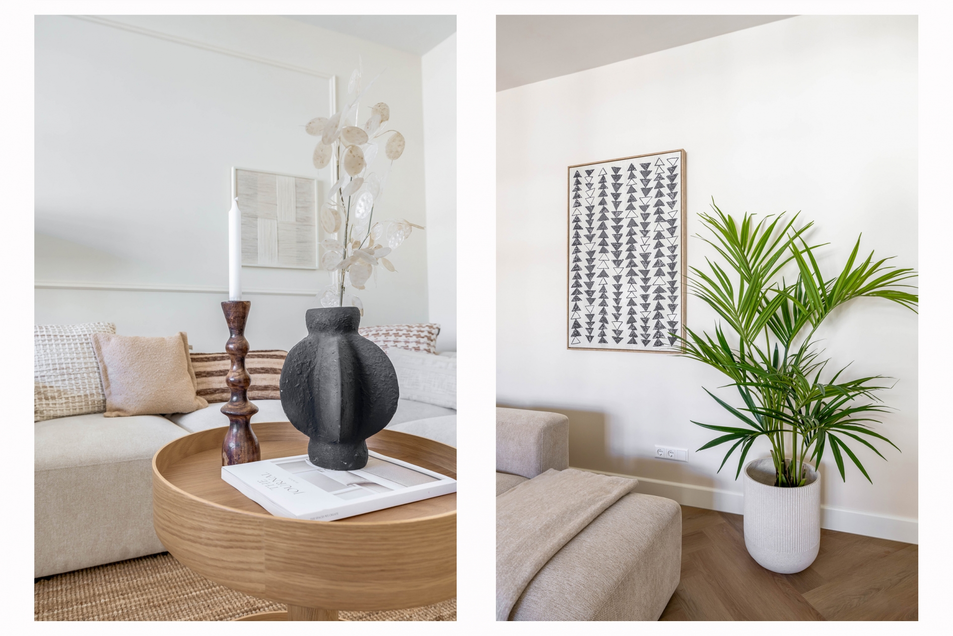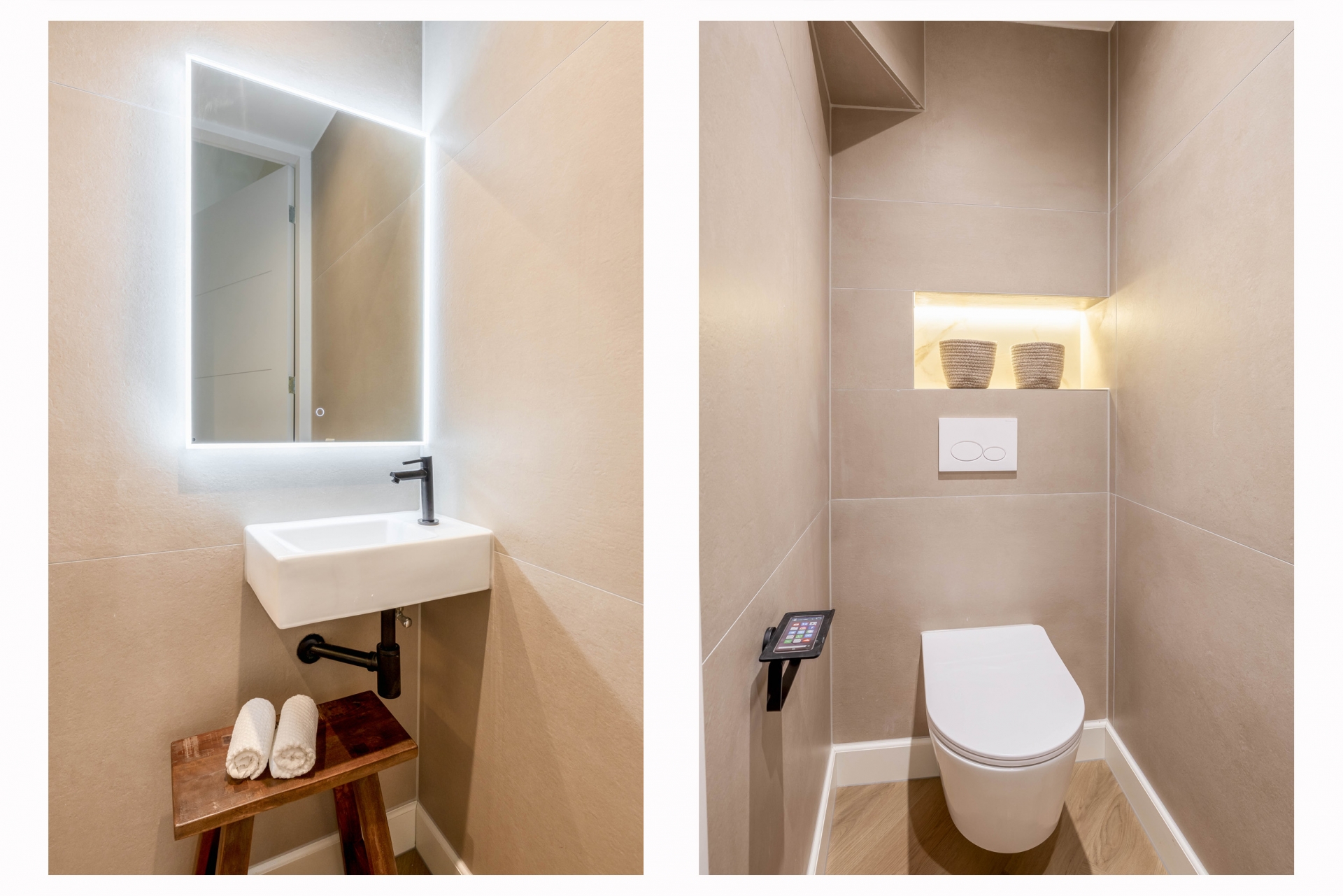 De combinatie van warme wandafwerking, natuursteenlook tegels en zwarte accenten zorgt voor een rustige, moderne uitstraling. Een ruimte die comfort en design moeiteloos combineert.