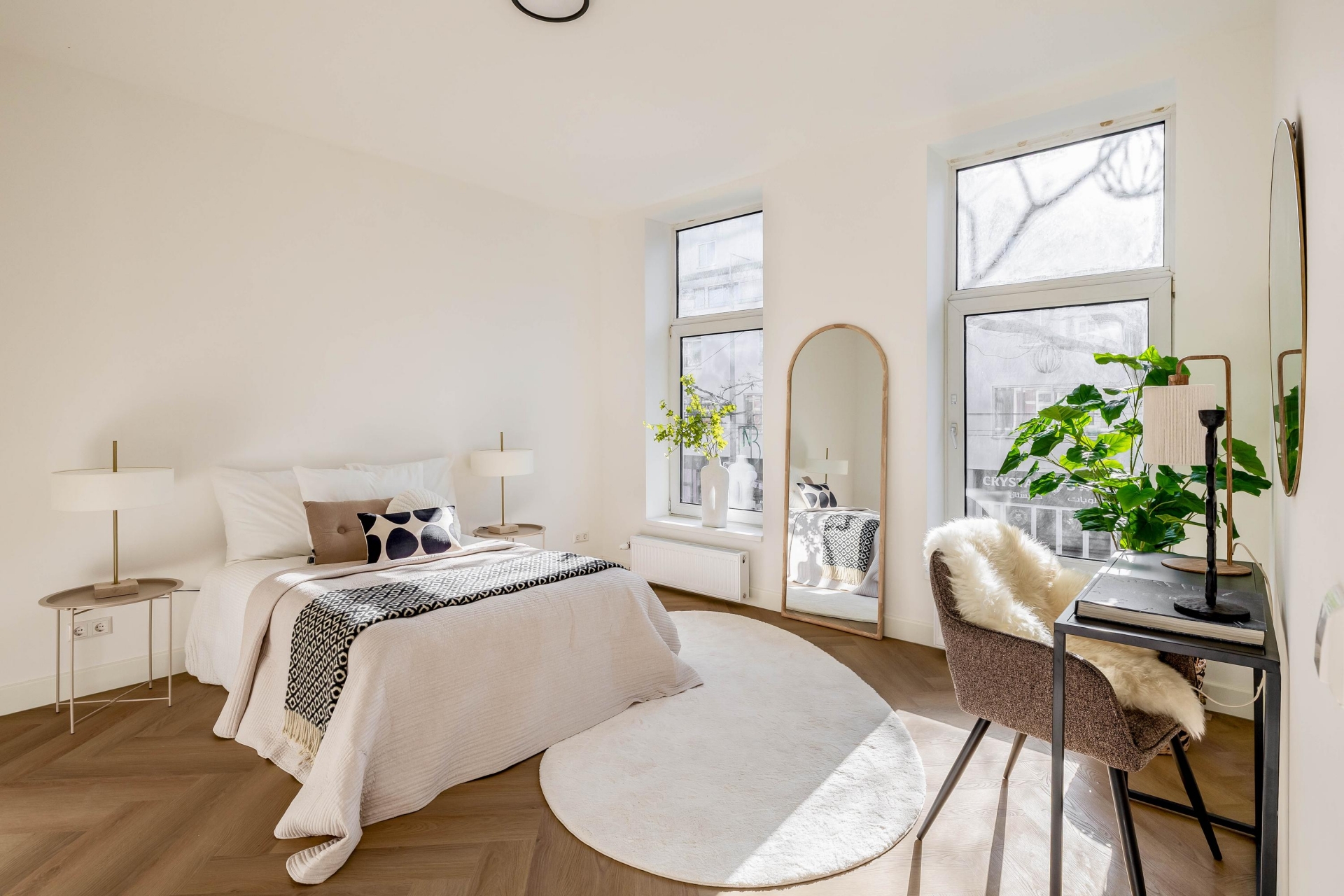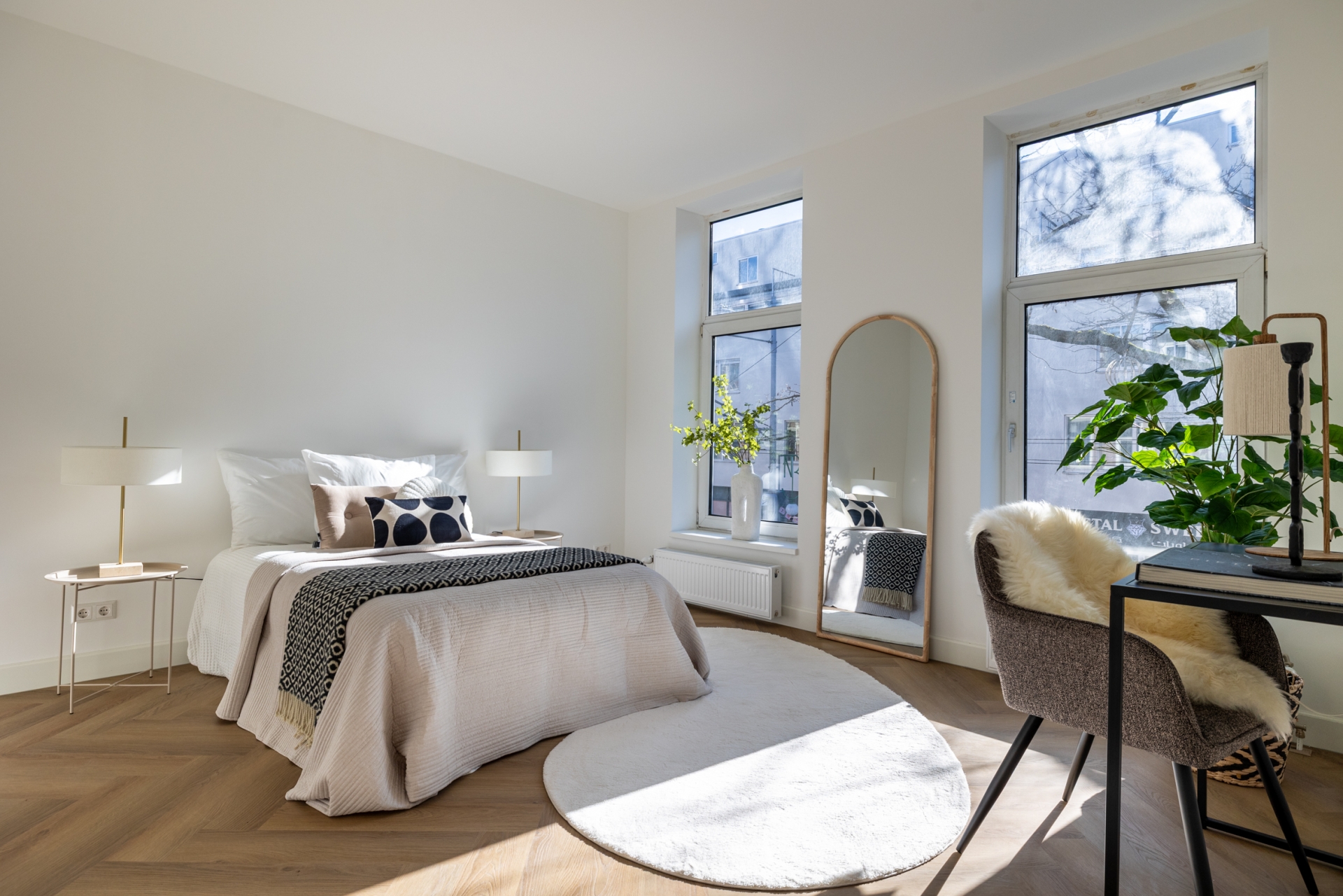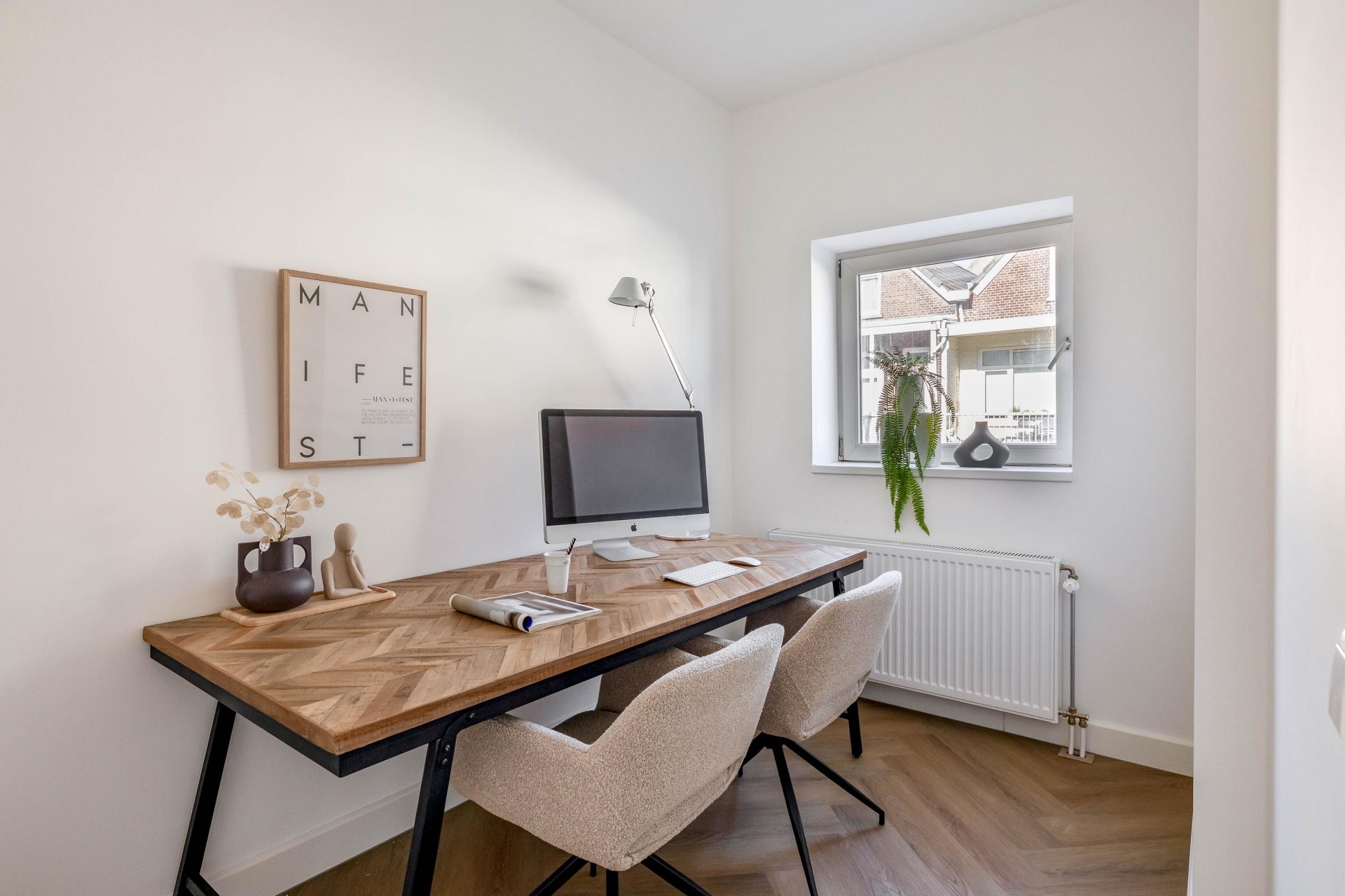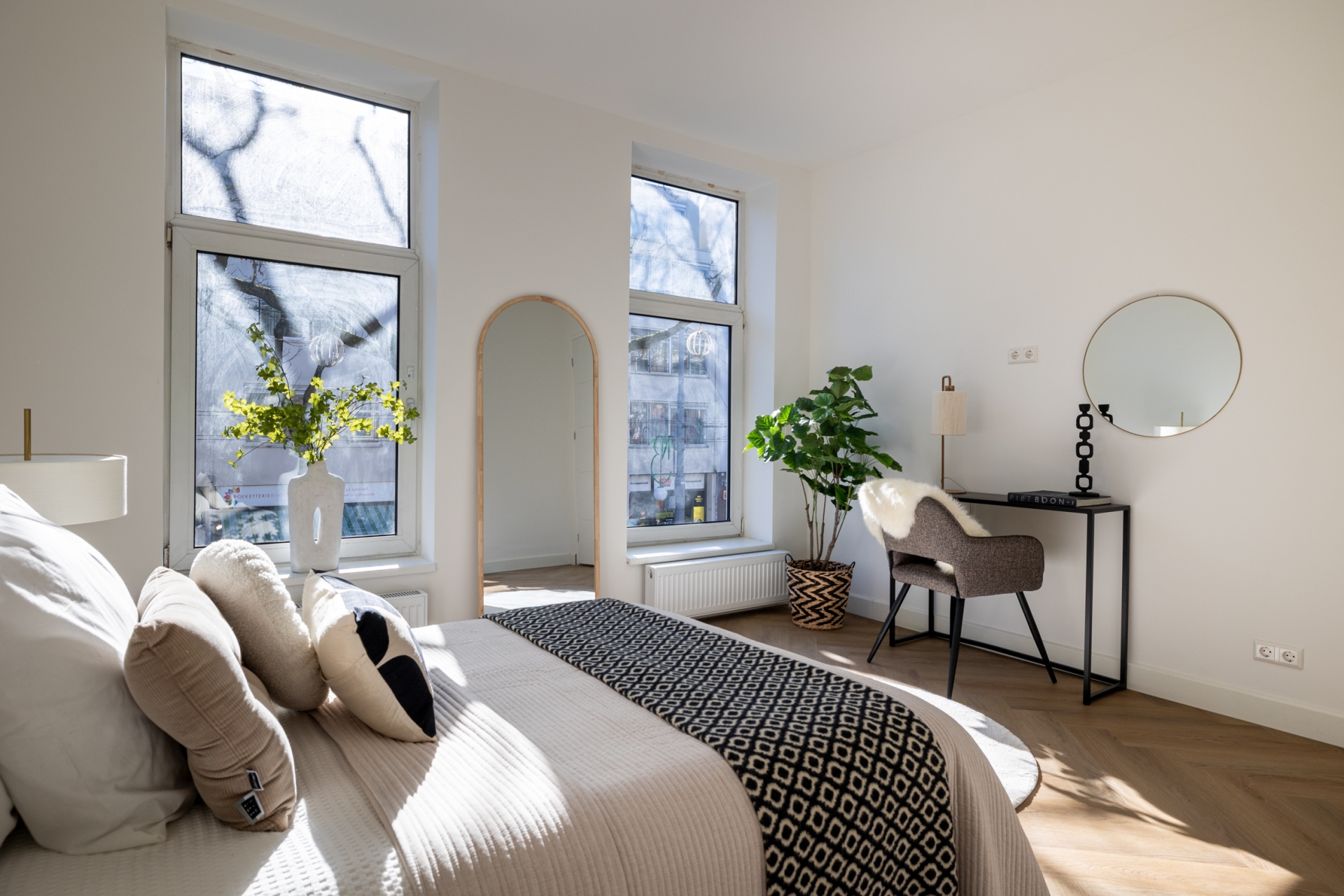 Aan zowel de voor- als achterzijde bevinden zich kamers, flexibel in te richten als hoofdslaapkamer, werkkamer of logeerkamer.