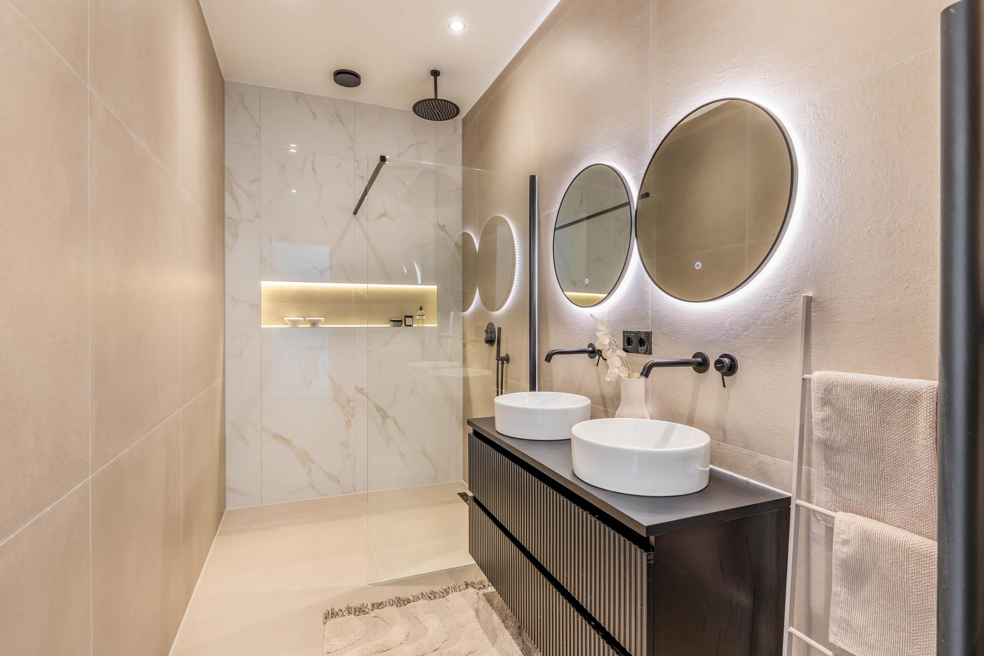 De badkamer is modern afgewerkt en voorzien van een ruime inloopdouche, dubbele wastafel met meubel en verlichte spiegels.