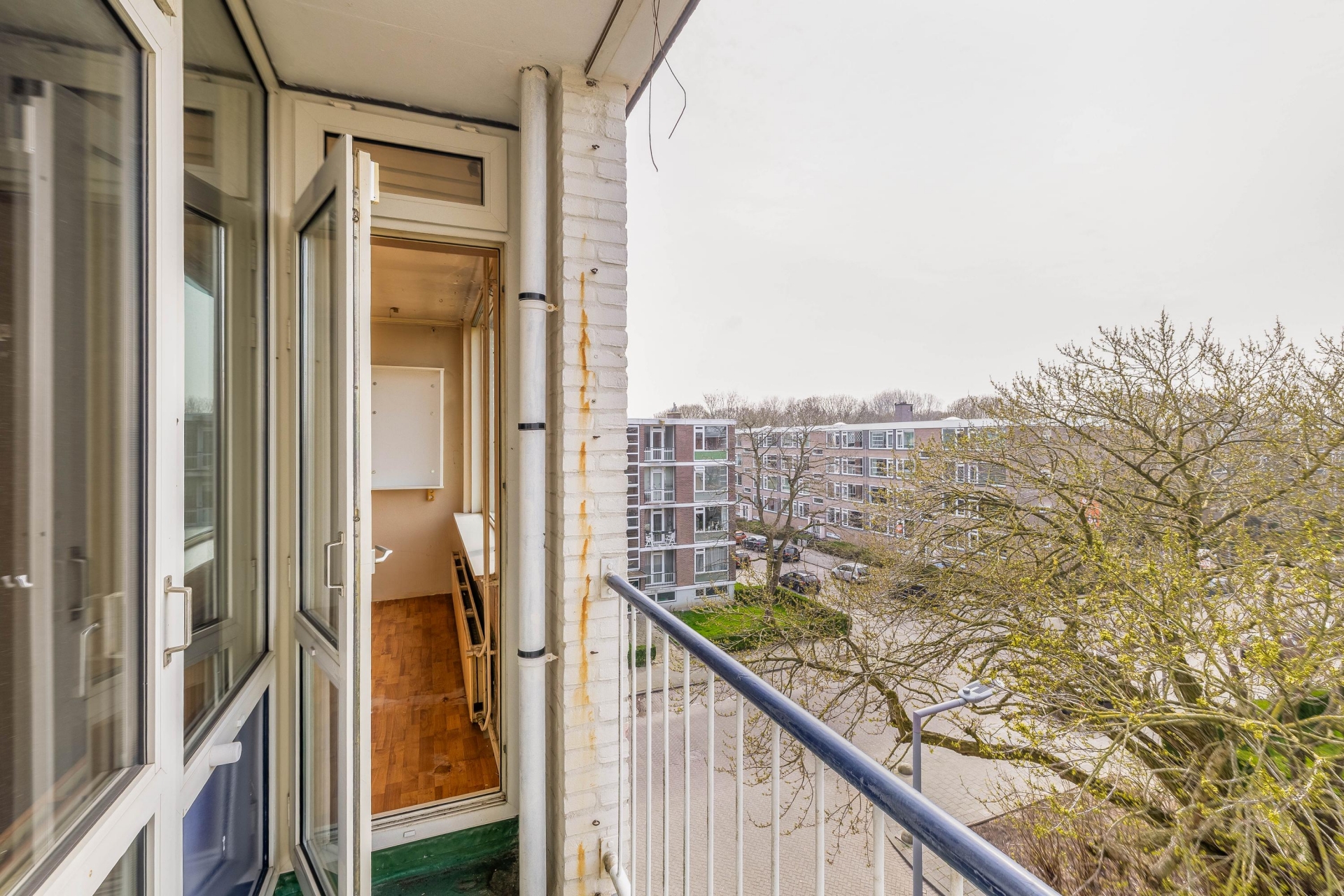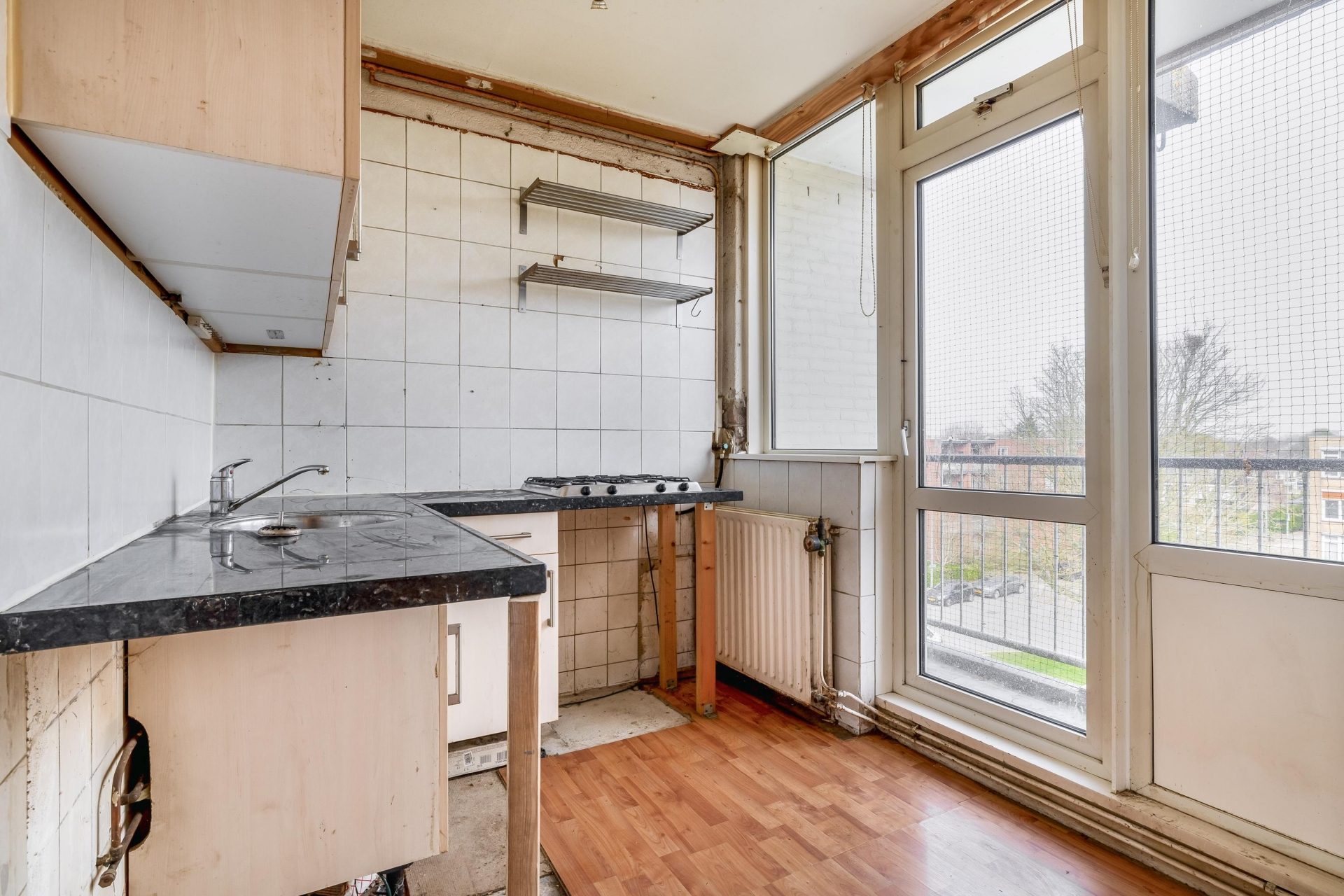 De keuken bevindt zich aan de achterzijde en geeft toegang tot het balkon. De huidige opstelling is eenvoudig en gedateerd, maar de ruimte en ligging bieden een prima uitgangspunt voor een nieuwe keukenopstelling. Het balkon ligt op het oosten, wat betekent dat je hier in de ochtend van de zon kunt genieten. Na een werkdag nog even buiten zitten in de zon maakt het wonen hier net even aangenamer met het balkon aan de achterzijde. Verder beschikt het appartement over een inpandige berging, ideaal voor het opbergen van spullen, fietsen of gereedschap. Verwarming en warm water verlopen via een VR-ketel van Bosch uit 2006. Het energielabel is G, wat aangeeft dat er nog winst te behalen is op het gebied van isolatie en duurzaamheid, een mooie kans voor wie het appartement toch gaat aanpakken.