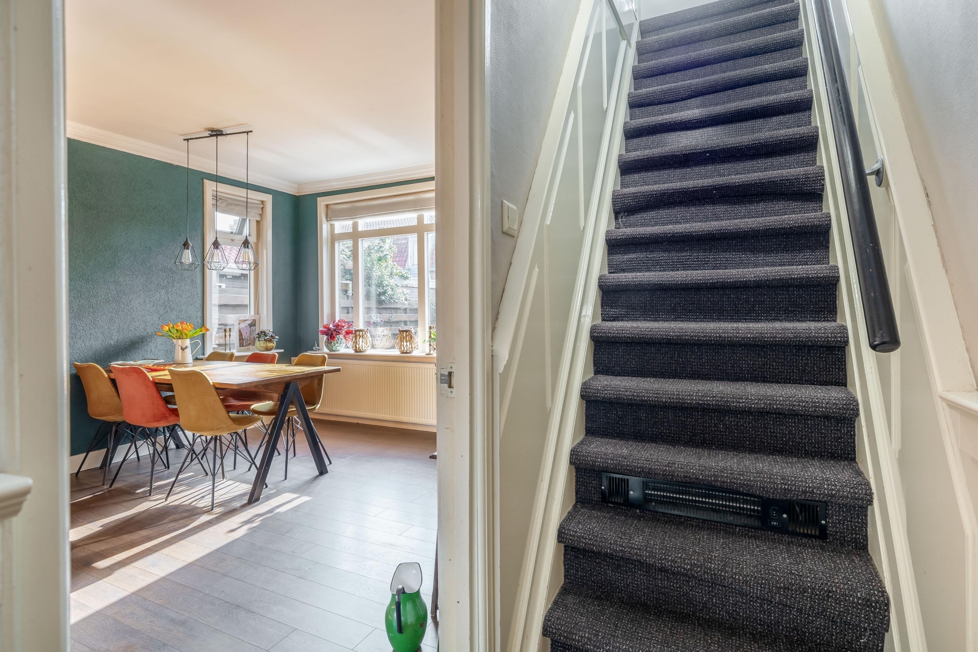 De woonkamer vormt het hart van het huis. De doorzonkamer zorgt voor een mooie verbinding tussen de voor- en achterzijde, waardoor de ruimte prettig open aanvoelt. Grote ramen aan beide kanten zorgen voor veel natuurlijk licht en een levendig uitzicht op de straat en de tuin.