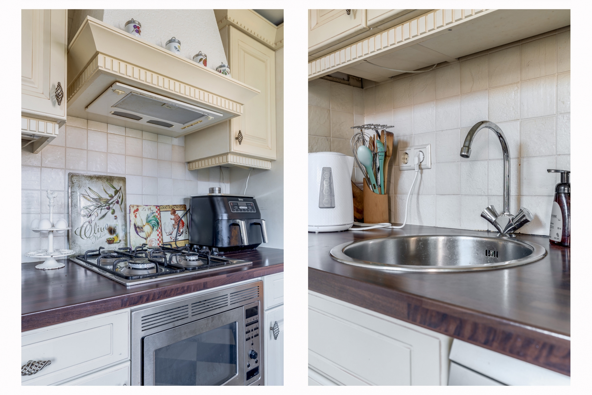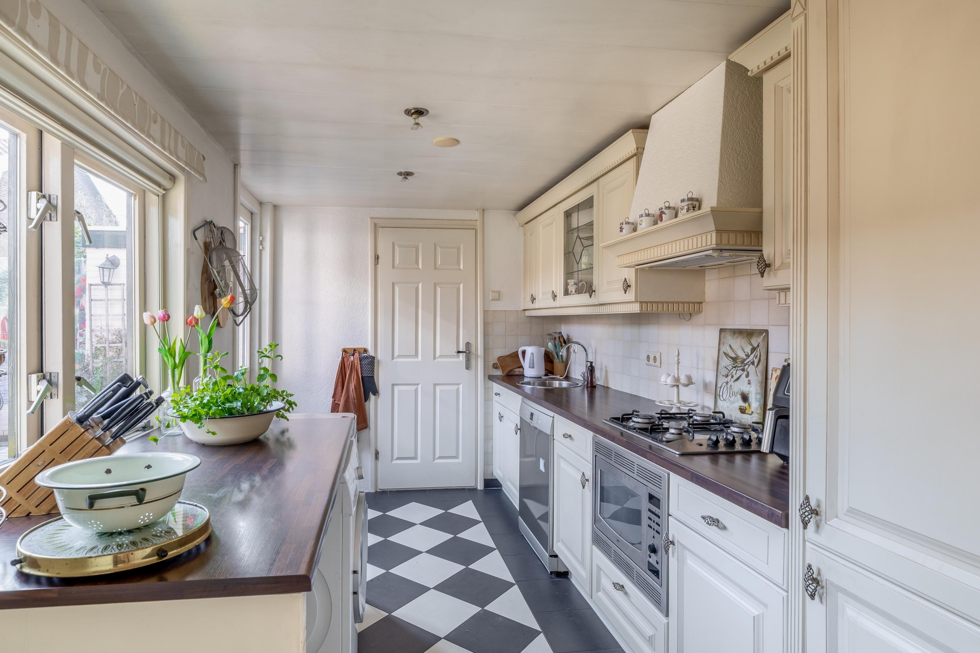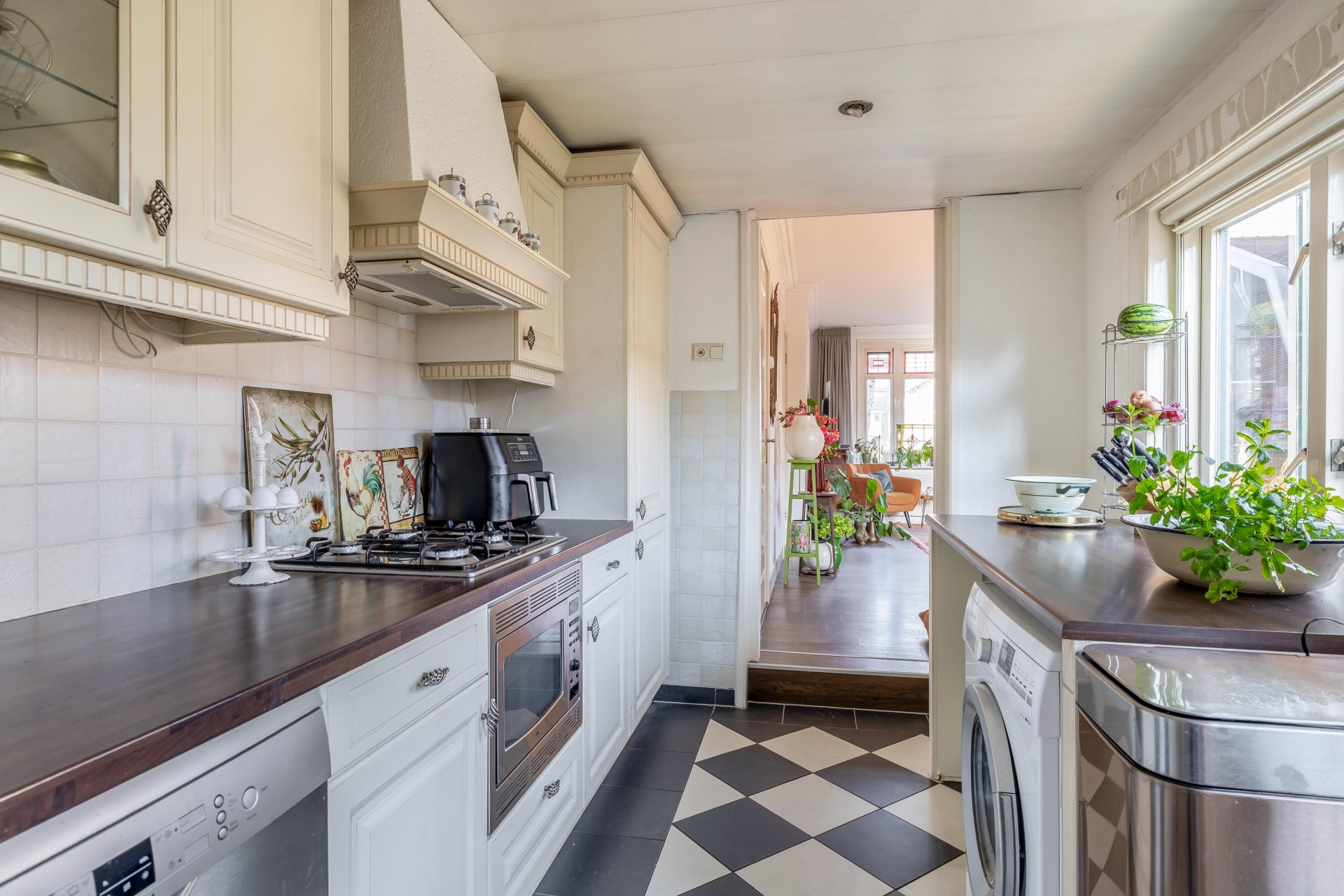 De keuken ligt aan de achterzijde van het huis en staat in directe verbinding met de tuin. Dat maakt het makkelijk om binnen en buiten met elkaar te combineren, bijvoorbeeld tijdens een etentje met vrienden of familie. Het is praktisch ingericht en biedt voldoende werk- en kastruimte.