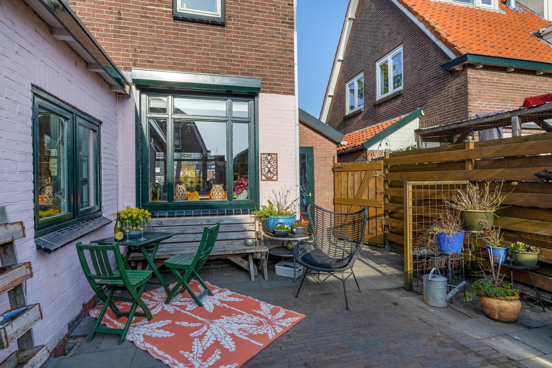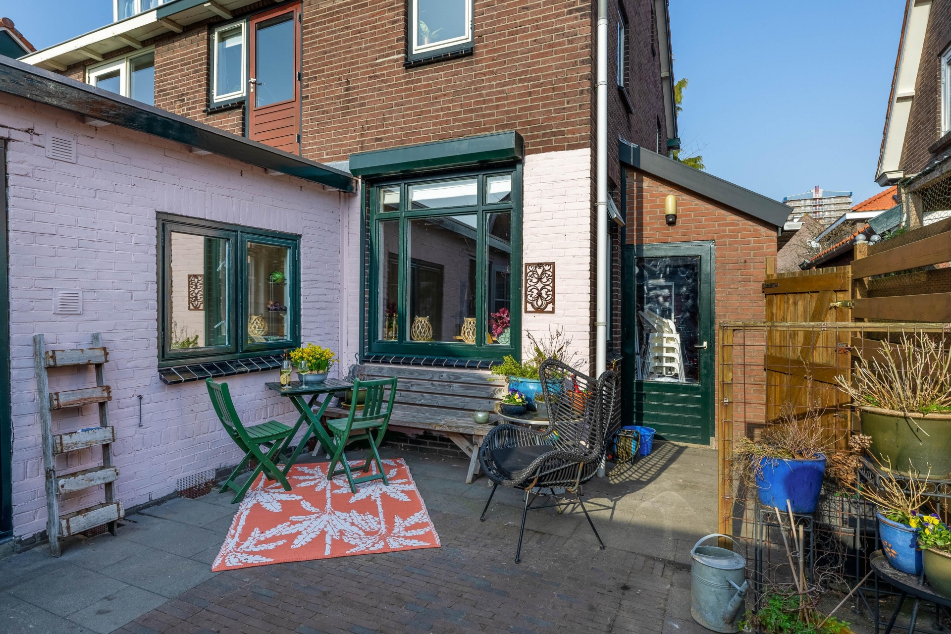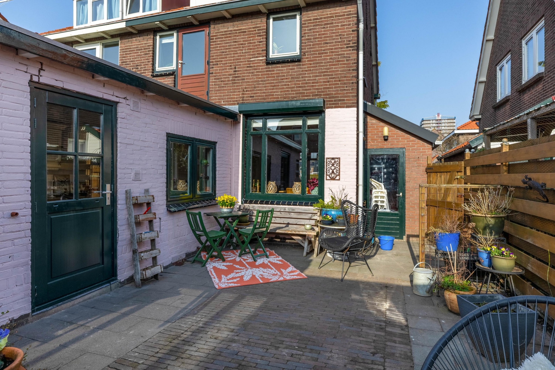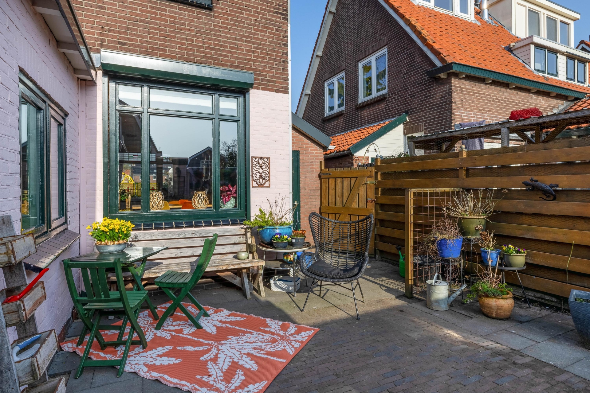 De tuin heeft daarnaast 2 praktische, compacte bergingen voor fietsen, tuin- of hobbyspullen. Dankzij de beschutte ligging kun je hier al vroeg in het seizoen comfortabel buiten zitten.