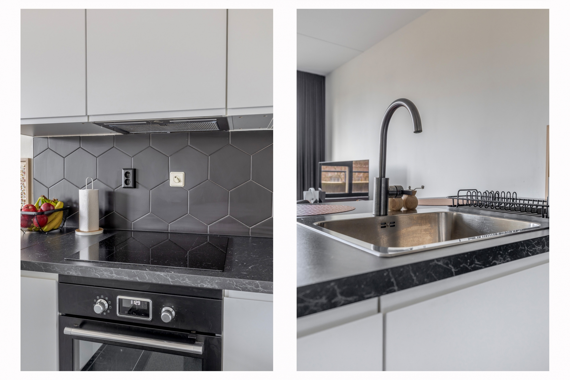 De royale woonkamer is een heerlijke, lichte ruimte met grote raampartijen en een directe verbinding met het brede balkon dat zich uitstrekt over de volledige breedte van de woning. Hier geniet je ’s ochtends van de opkomende zon en een vrij uitzicht, terwijl er voldoende plaats is voor zowel een zit- als eetgedeelte. De open keuken is recent geplaatst en uitgevoerd in een moderne stijl met strak vormgegeven kasten en hedendaags inbouwapparatuur. De twee slaapkamers liggen beide aan de balkonzijde, waardoor ze profiteren van veel licht en zicht op buiten. Ze zijn ideaal te gebruiken als slaap-, werk- of logeerkamer.