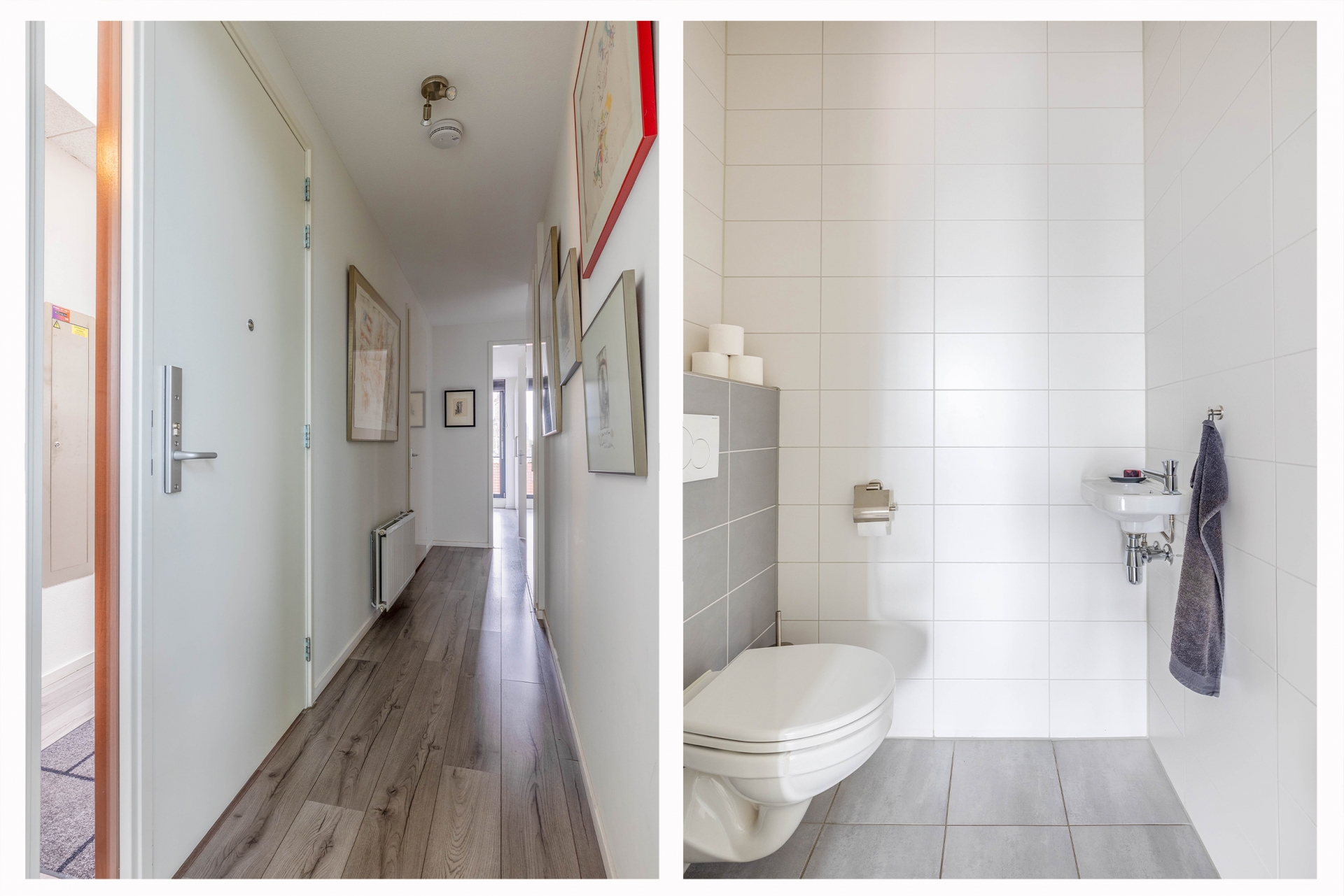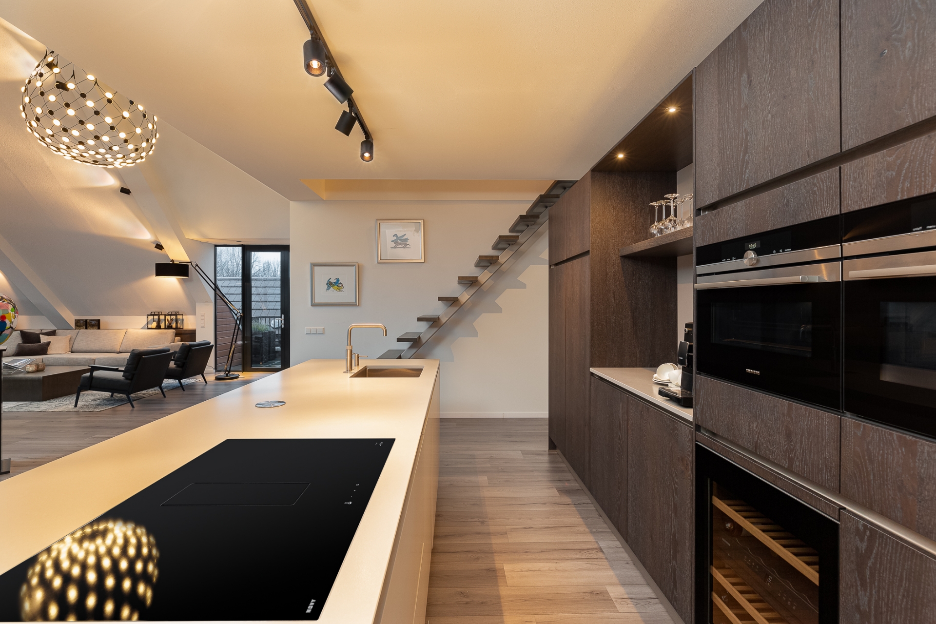 U komt binnen via een fraaie centrale hal op de begane grond en neemt de lift naar de bovenste verdieping. Daar stapt u uit in uw eigen hal, zonder andere bewoners op deze verdieping. Via de hal komt u in de ruime en lichte woonkamer met toegang tot beide terrassen, wat een genot! De open keuken is modern en voorzien van diverse inbouwapparatuur waaronder een inductie kookplaat, quooker, 2 ovens waarvan 1 combi/oven magnetron, vaatwasser, koelkast, vriezer en een eigen wijnkoeler! In de keuken een trap naar de entresol.