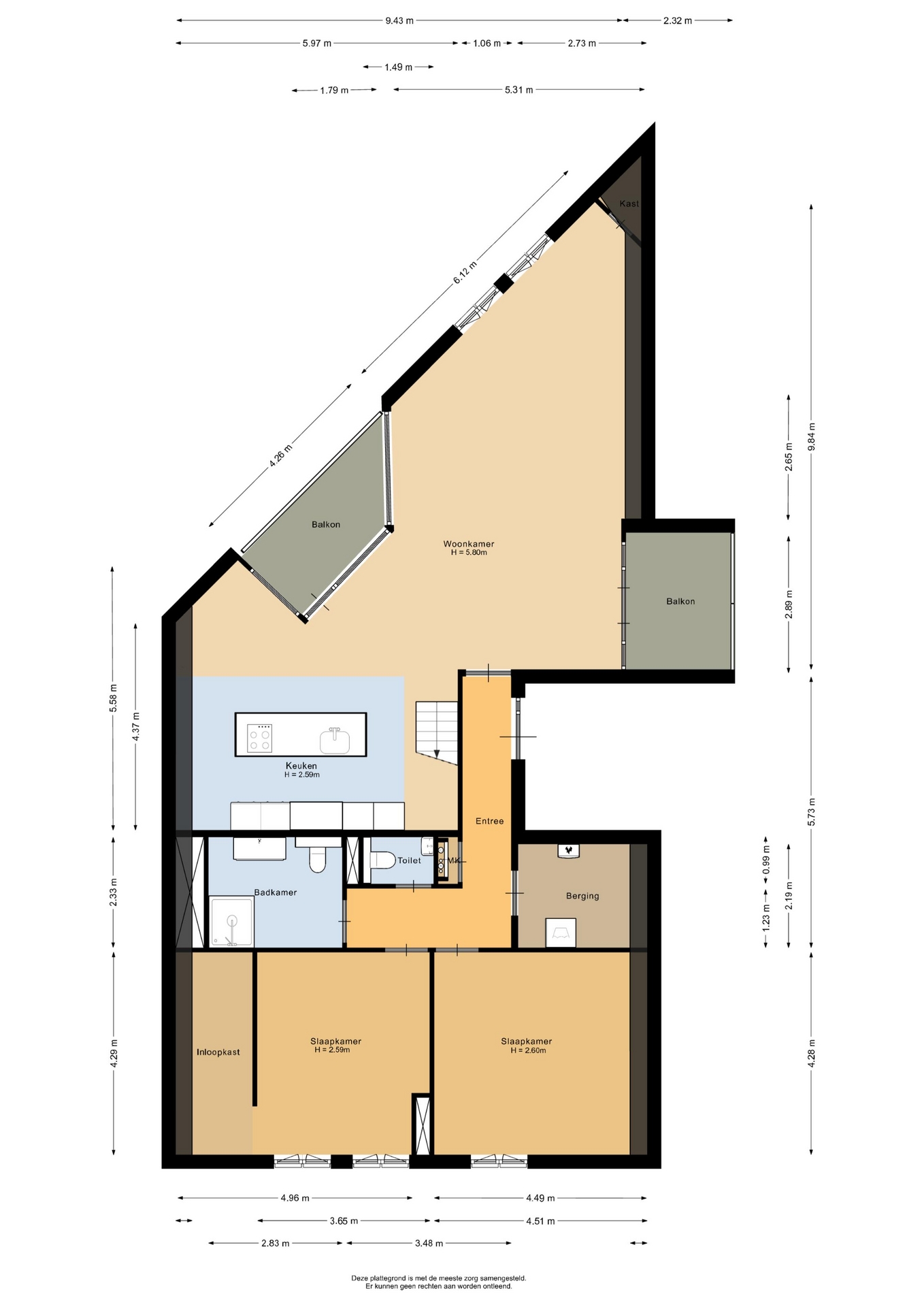 “Deze informatie is door ons met de nodige zorgvuldigheid samengesteld. Onzerzijds wordt echter geen enkele aansprakelijkheid aanvaard voor enige onvolledigheid, onjuistheid of anderszins, dan wel de gevolgen daarvan. Alle opgegeven maten en oppervlakten zijn indicatief.”